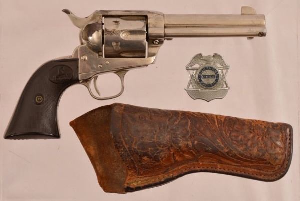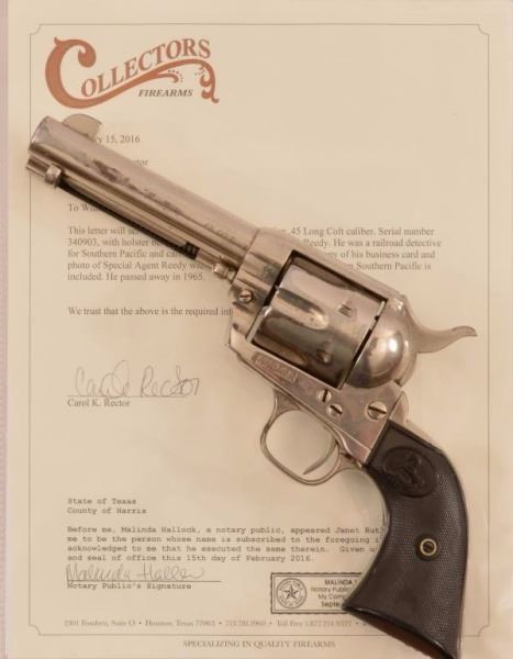 * Belonged to William Reedy, railroad detective for Southern Pactific Railroad. With badge, photos and holster. Mfg. 1921.