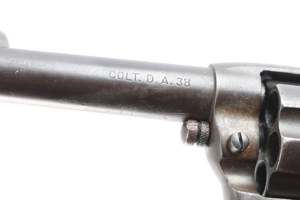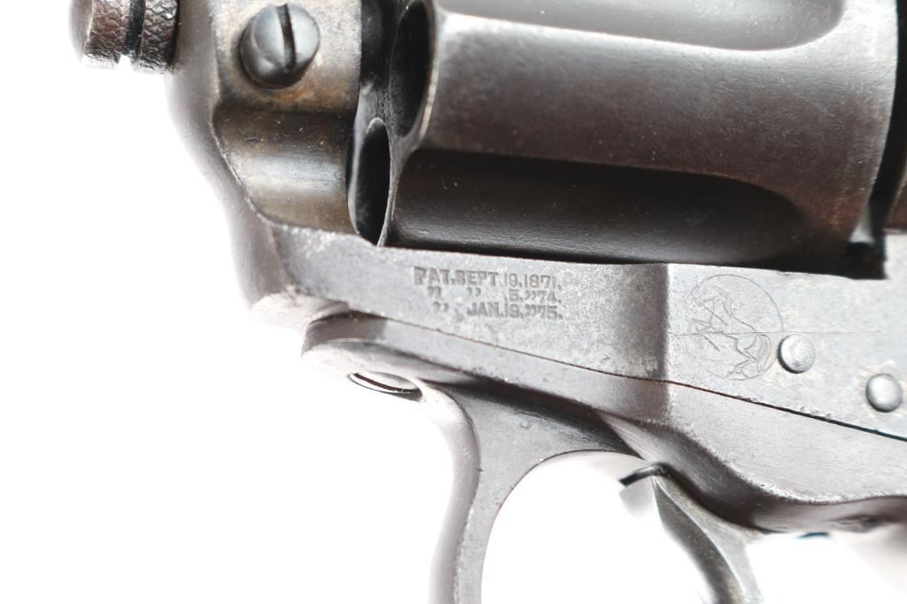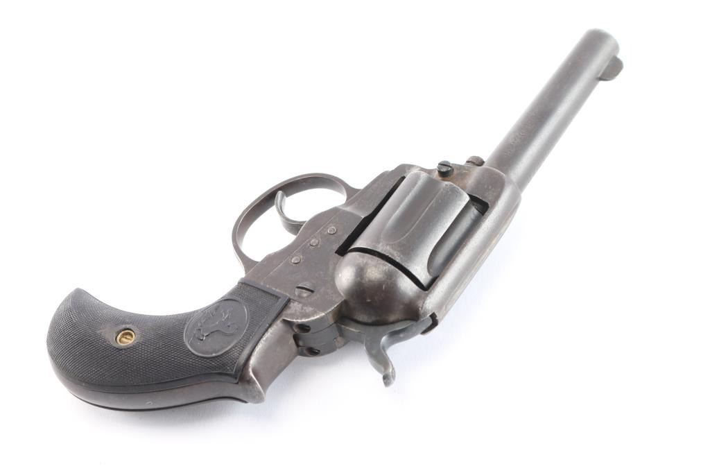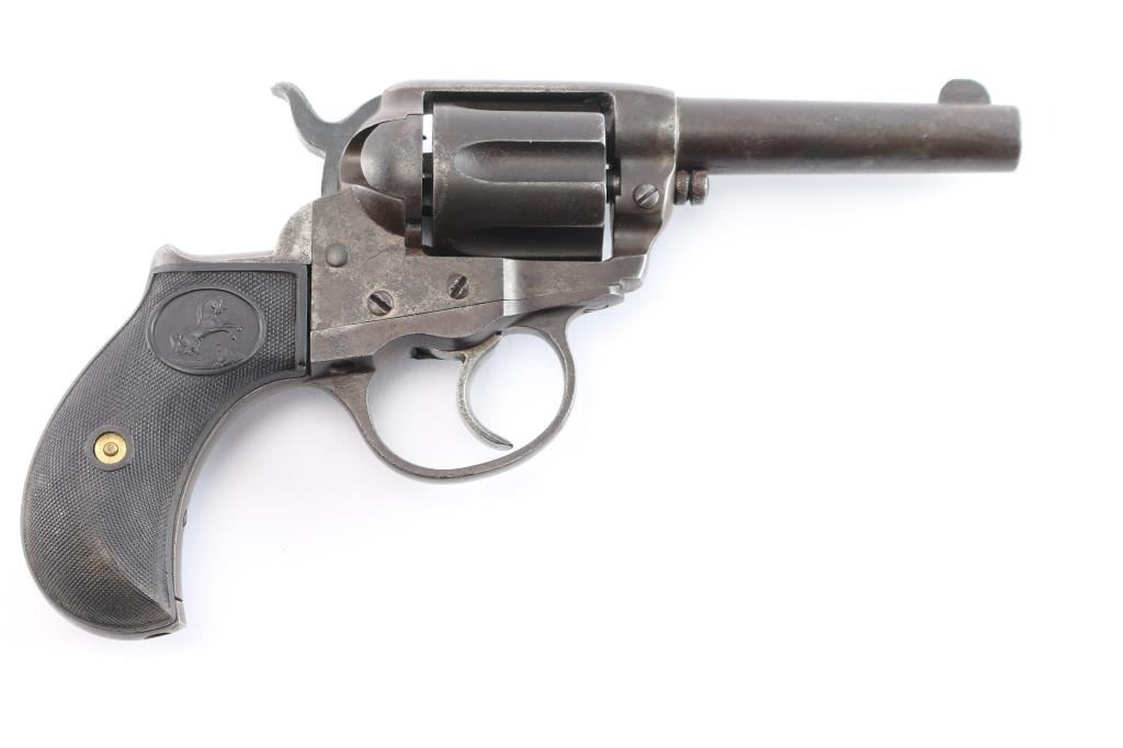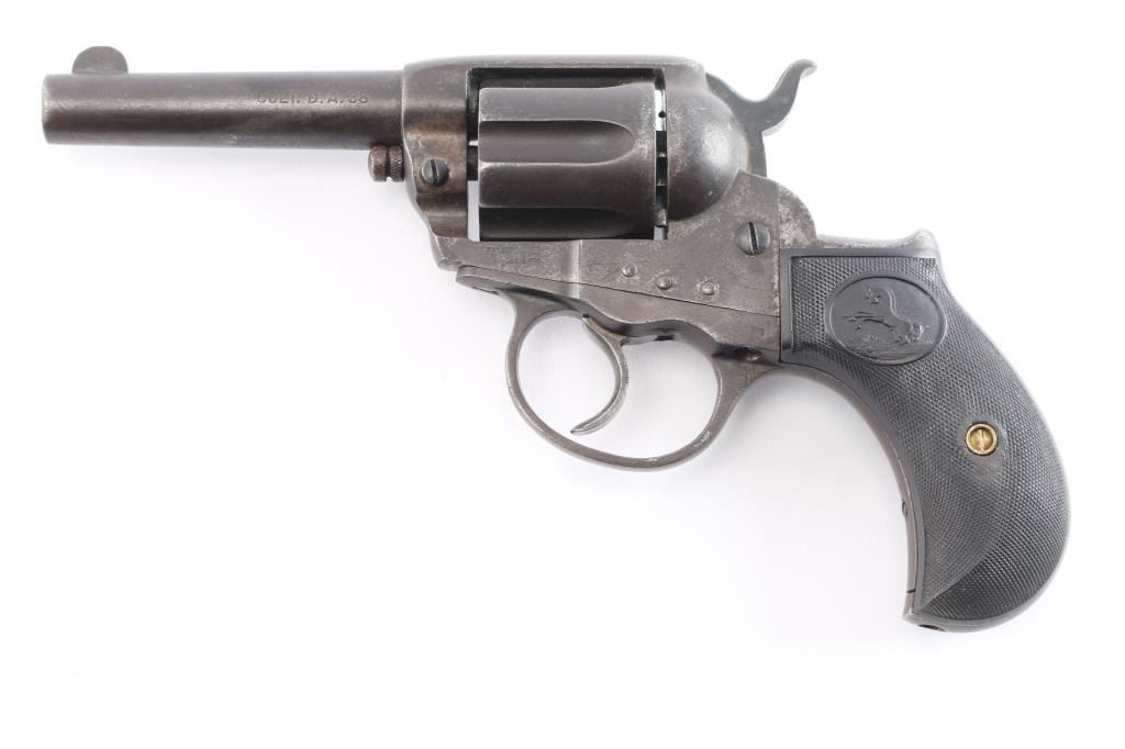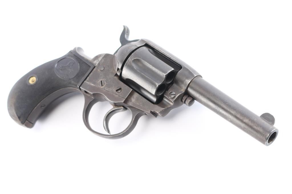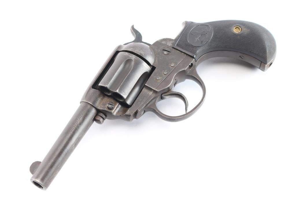 'Lightning' Shopkeepers or Sheriff's model, with 3.5" barrel and no ejector rod. Circa 1904. Double/Single action. Features blued finish, six shot fluted cylinder, bird's head grip with checkered black hard rubber "Rampant Colt" grips.(Grips appear to be newer replacements) Bore is good condition, fairly bright with strong rifling, some scattered light pitting. Charge holes are good, minor roughness. Finish shows a shows an even brown/gray toned finish, some light scattered pitting. Action is sound, good lock-up. Screw slots are good. Two line Hartford barrel address. Markings are generally sharp, Rampant Colt and patent dates on left frame. The serial number on back strap is feint but readable, the numbers on the frame and triggerguard scrubbed, unreadable but appear to match from the little that can be seen. Assembly number "78" on loading gate. Action works well.