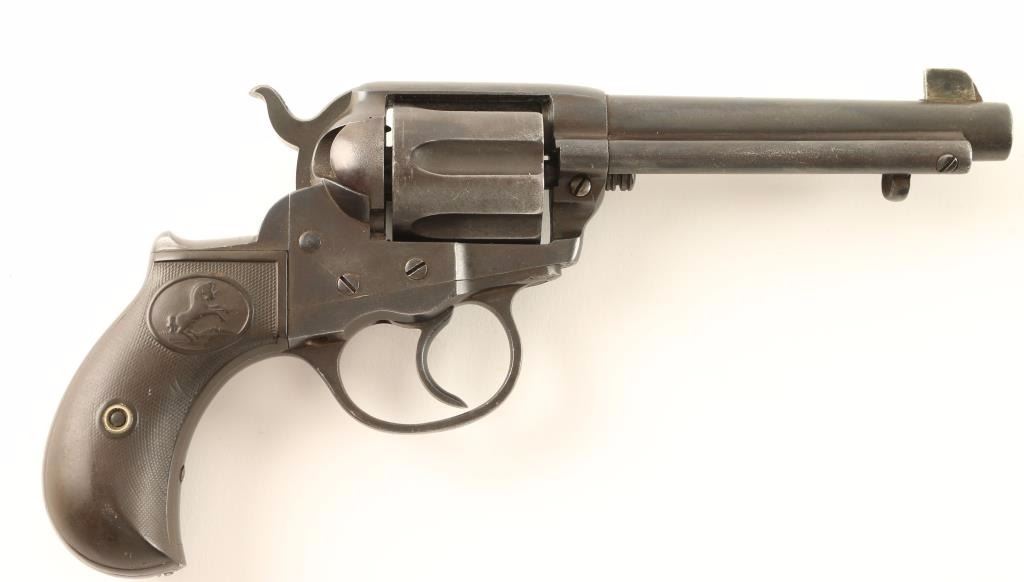 Refinished double action revolver chambered in .38 Colt, circa 1903. Features a blued refinish, 4 3/4" barrel with two line address, bullseye ring ejector, enlarged blade front sight, 'v' notched rear sight, six shot fluted cylinder, smooth trigger, checkered hammer spur, and two-piece bird's head checkered hard rubber Rampant Colt grips. Matching serial numbers on frame, trigger guard and backstrap. Revolver exhibits an even dark grey/black patina showing some light pin prick pitting on the cylinder and a small of light surface rust forming on the left side of the barrel. Action appears to work consistently in both action, bore is very good, markings are mostly legible and grips are good with worn checkering. Condition is good+. ***C&R Firearm*** ***Modern Firearm***