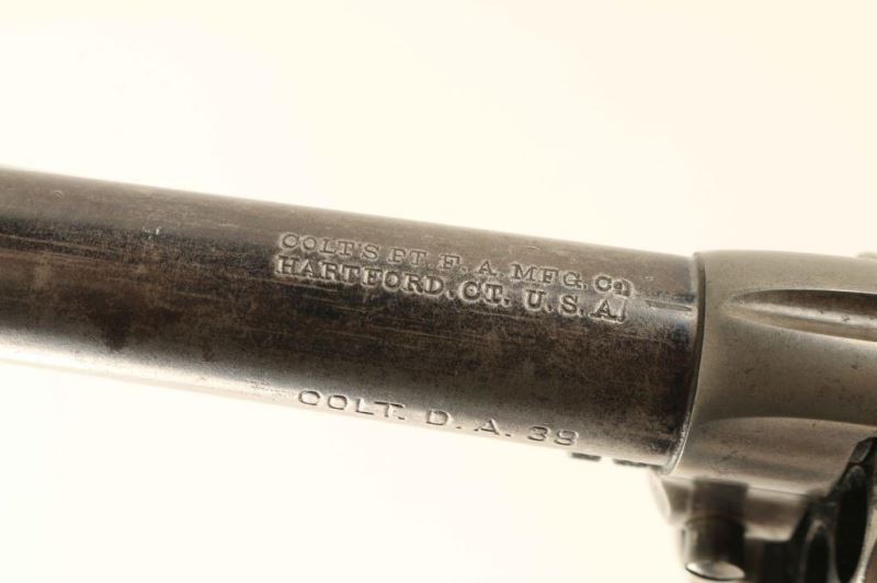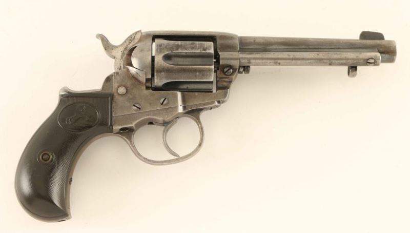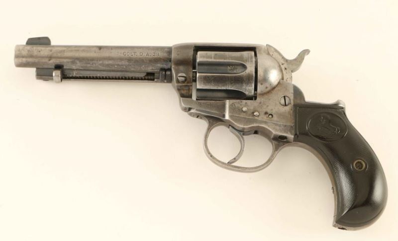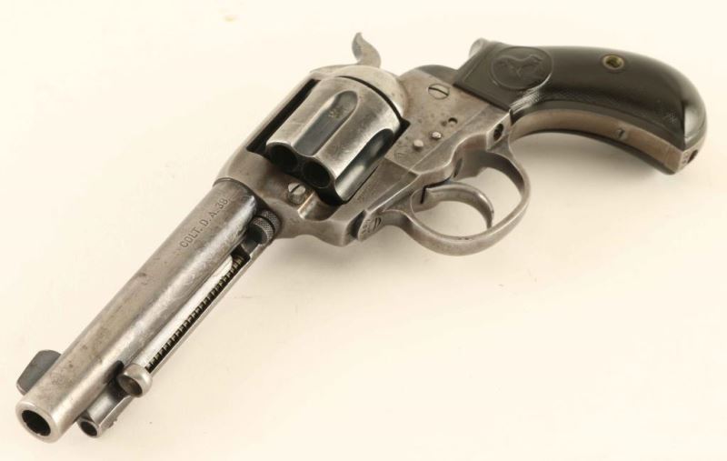 Vintage double action six-shot revolver chambered in .38 Colt, manufactured circa 1906. Featured a blued/case hardened finish, 4.5" barrel with two line address, bulls-eye ring ejector, altered blade front sight, 'v' notched rear sight, long fluted cylinder, smooth trigger, knurled hammer spur and two-piece checkered black hard rubber birds head grips with Rampant Colt decor. Serial numbers match on the frame, trigger guard and back strap. The majority of the metal surfaces display a light grey patina with approximately 20% of the revolver's bright original finish retained in the projected areas. Action is mechanically sound with all four clicks, the lock-up is very good, the bore has good luster & rifling with some pitting and the hard rubber grips are good as worn smooth. Condition is NRA Good to Very Good. ***C&R Firearm***
