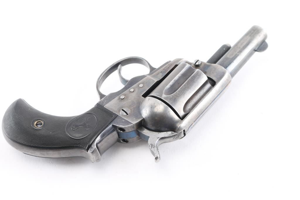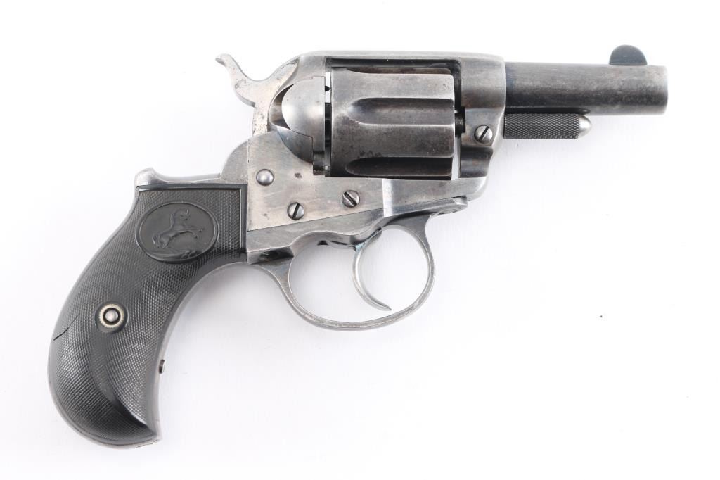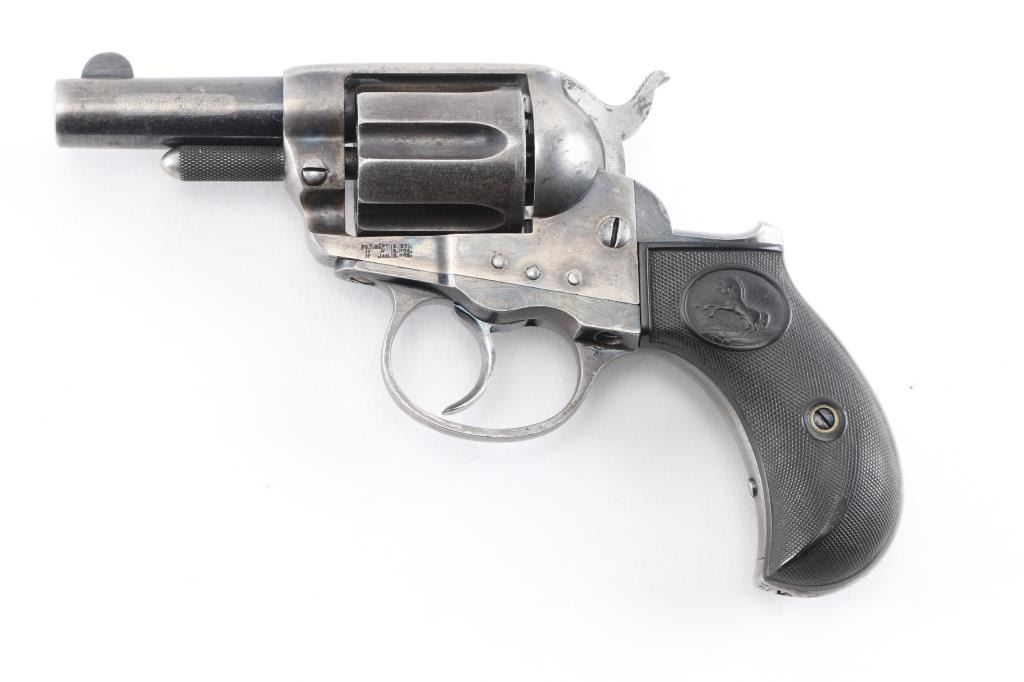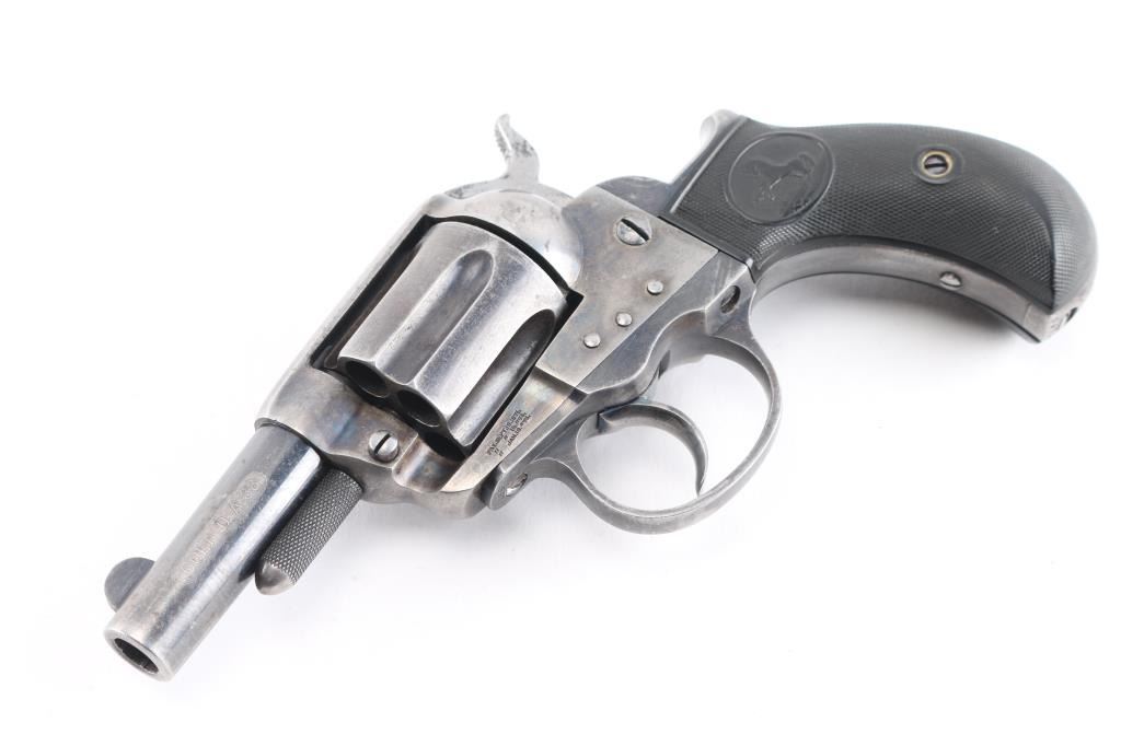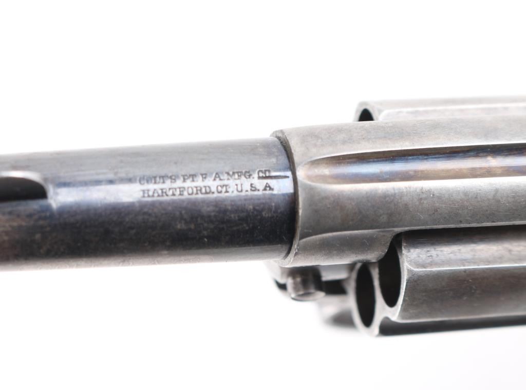 Rare Etched Barrel Colt 1877 Lightning Sheriff's Model Double Action Revolver manufactured circa 1886. Etched barrel panel 'Colt D.A. 38'. Features blued finish, checkered black hard rubber grips with Rampant Colt horse emblem, bird's head grip frame, 2.5" barrel with ejector rod, fixed sights. Bore is fair to good, strong rifling, some scattered light pitting. Charge holes are very good condition. Blue is about 30% mostly on the backstrap, barrel and triggerguard, the frame a fairly even light gray color with traces of case colors visible. Grips are overall very good condition with a minor crack at the rear of the right panel, Rampant Colt,s are clear/crisp. .Single/double action operation is smooth, with tight lock-up. Numbers on triggerguard and back strap match frame. Two line barrel address. All markings are fairly crisp. '176' assembly number on the loading gate. No ejector, knurled cylinder pin. Markings are clear/readable.