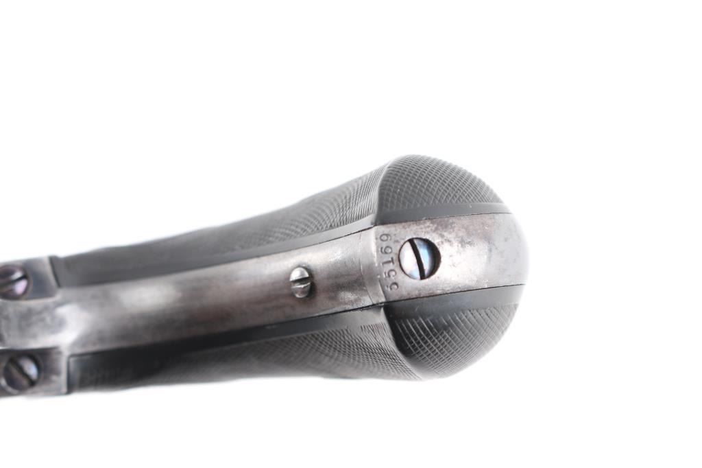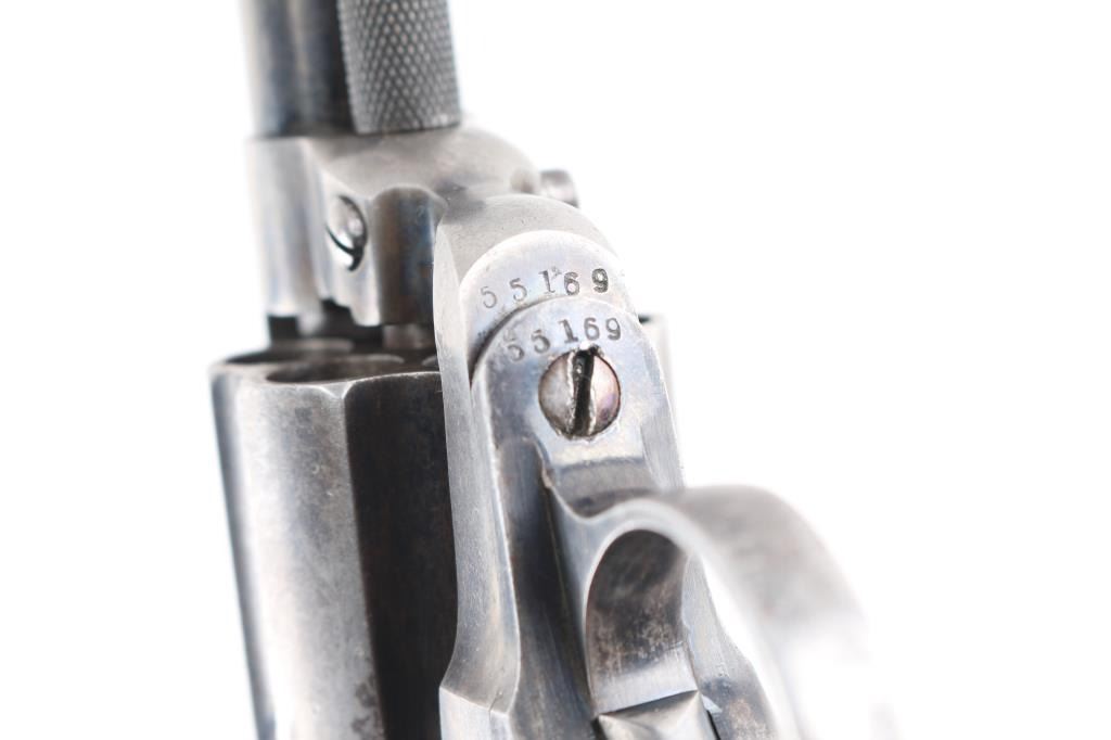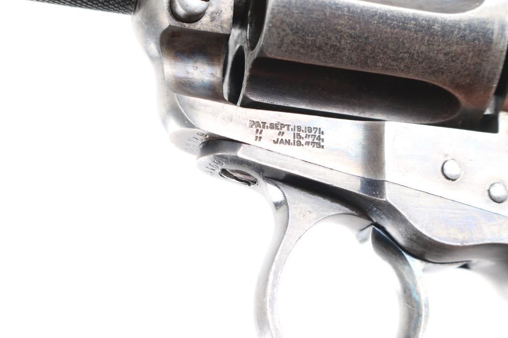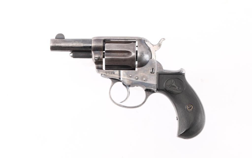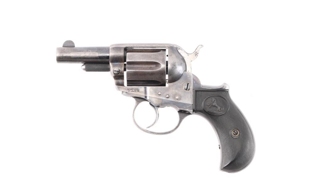 Rare Etched Barrel Colt 1877 Lightning Sheriff's Model Double Action Revolver manufactured circa 1886. Etched barrel panel 'Colt D.A. 38'. Features blued finish, checkered black hard rubber grips with Rampant Colt horse emblem, bird's head grip frame, 2.5" barrel with ejector rod, fixed sights. Bore is fair to good, strong rifling, some scattered light pitting. Charge holes are very good condition. Blue is about 30% mostly on the backstrap, barrel and triggerguard, the frame a fairly even light gray color with traces of case colors visible. Grips are overall very good condition with a minor crack at the rear of the right panel, Rampant Colt,s are clear/crisp. .Single/double action operation is smooth, with tight lock-up. Numbers on triggerguard and back strap match frame. Two line barrel address. All markings are fairly crisp. '176' assembly number on the loading gate. No ejector, knurled cylinder pin. Markings are clear/readable.