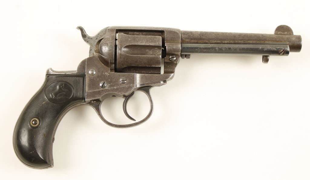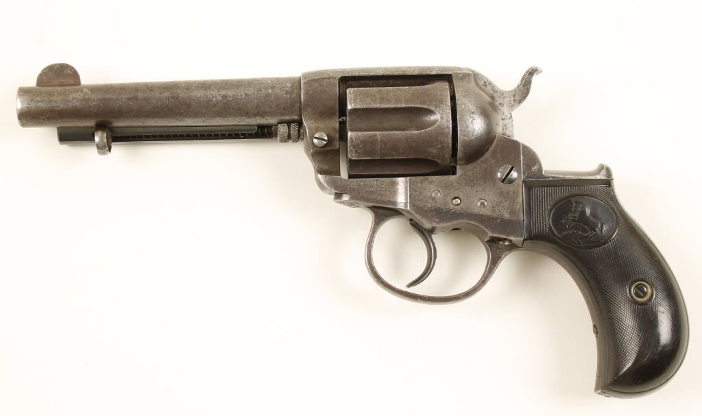 Nickeled double-action 6-shot revolver with a 4-1/2' barrel. Almost none of the plating remains and that only in protected areas. Exposed steel is dark rust stained patina with scratches, dings and pitting. Ejector rod housing retains most of its bluing and may be a replacement. All serial numbers match. Bore is somewhat shiny with rust and pitting in spots. Chambers are dull but clear of corrosion. Hard rubber grips are worn smooth in spots. Action doesn't work. Condition is fair. *Antique Firearm*