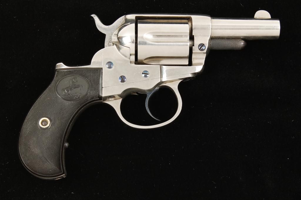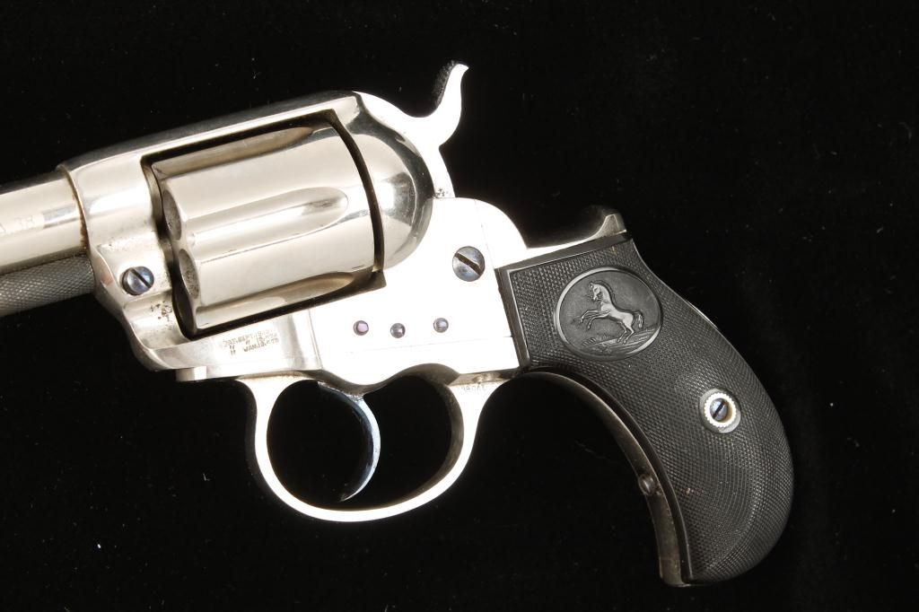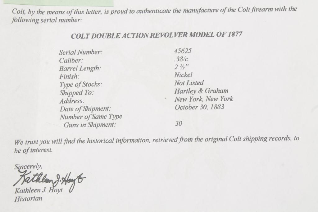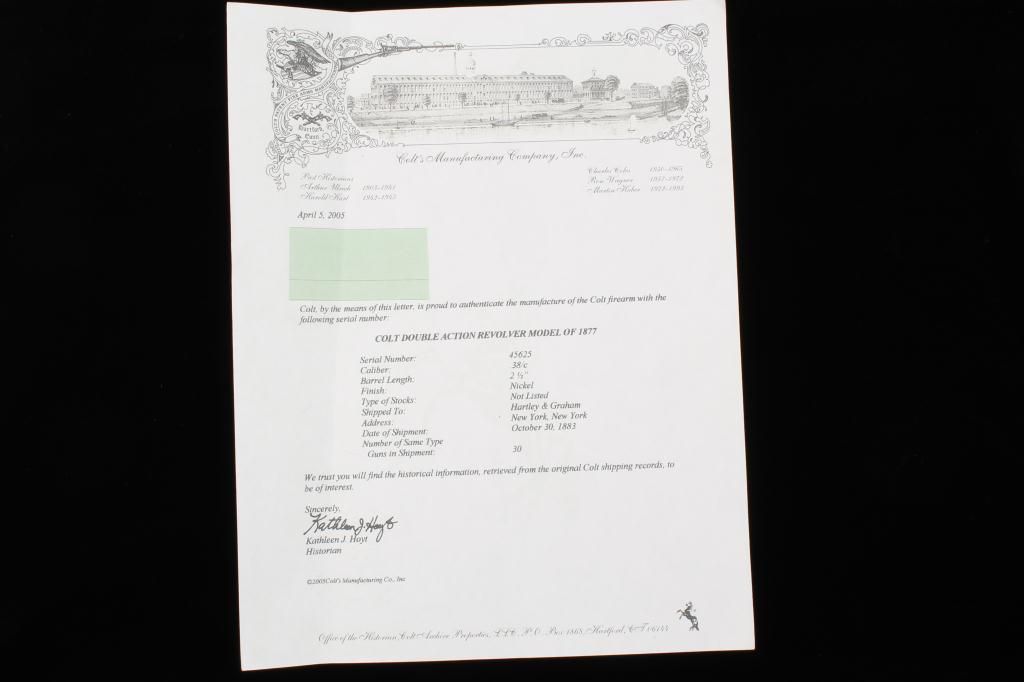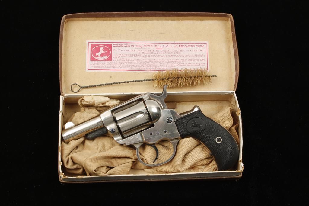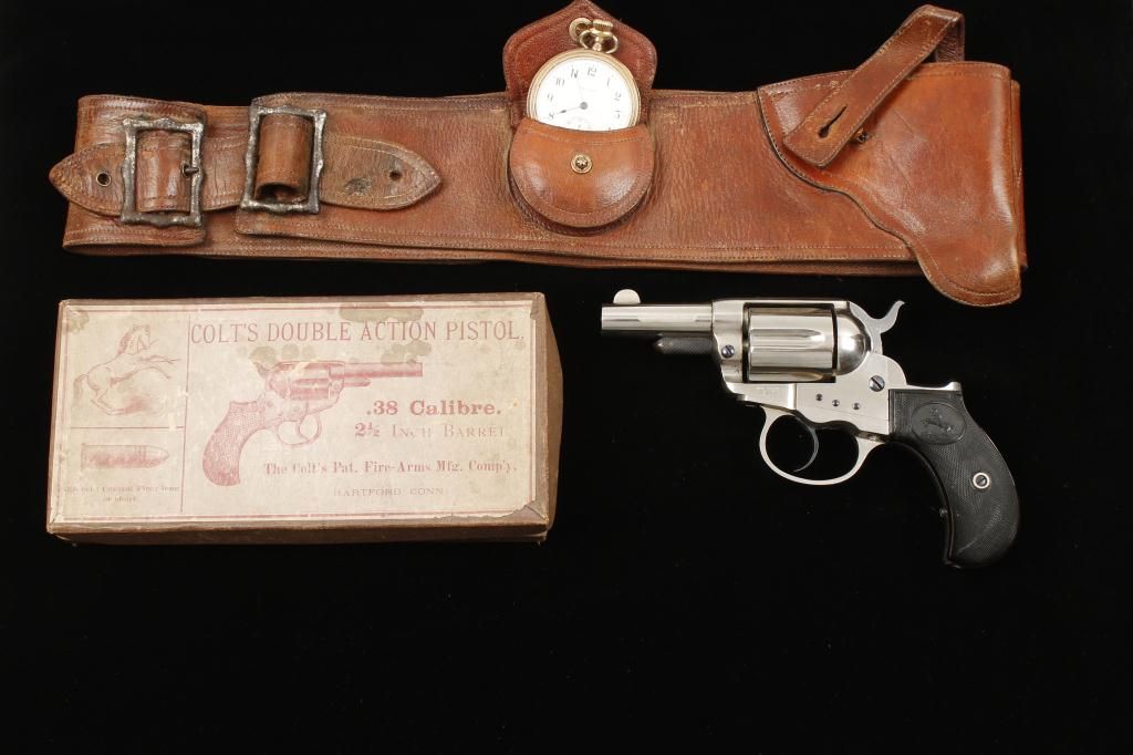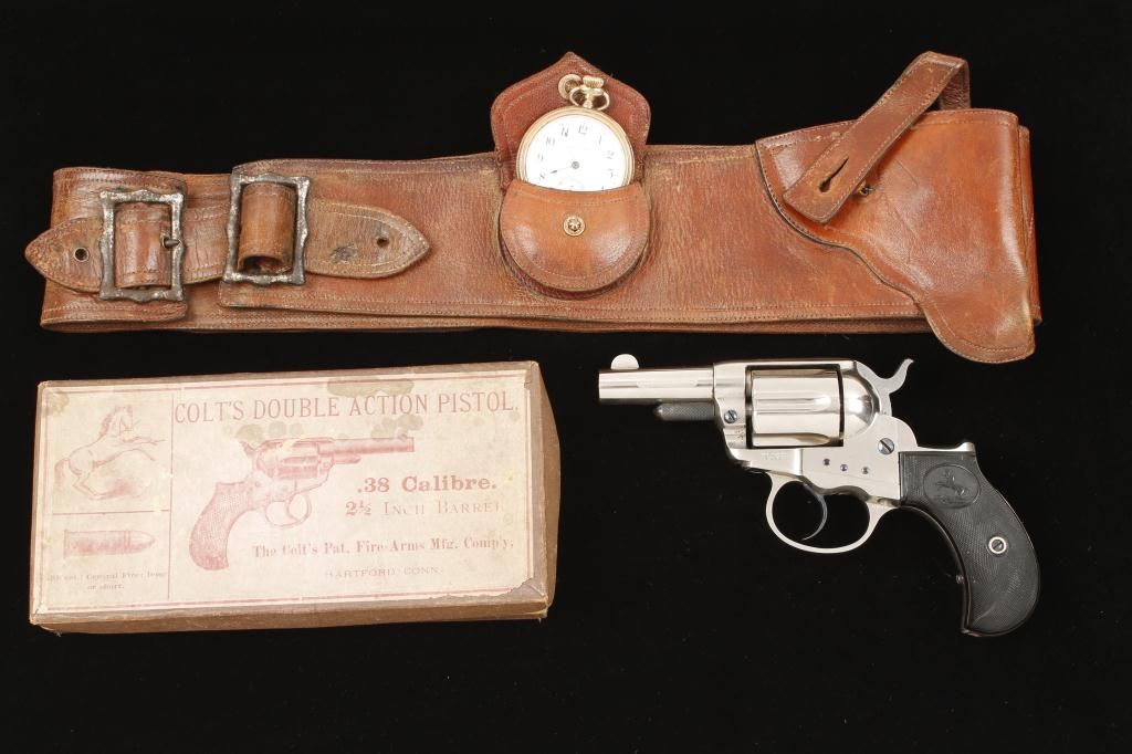 Colt 1877 Lightning Model, double action revolver, .38 caliber, 2 ½” barrel, nickel plated remaining in excellent condition with its original cardboard picture box, serial number 45625 shipped October 30, 1883 withall features verified by factory letter and sent to Hartley & Graham, New York, New York. Included with this revolver is an original messenger style belt with double buckles and provision for both revolver and pocket watchwith pocket for money or dispatch letters. The bottom of the original cardboard box is inscribed in pen “Property of Louis B. Gately U.S. Army aviation”. Louis B. Gately was born August 8, 1898 in Westerly, Rhode Island and attended Cornell University also he served in World War I and traveled throughout the West and Arizona in the early 1920s possibly where he obtained this Colt. This Colt retains 98% plus bright original nickelwith just some very small areas of pinprick pitting starting on the front edges of the frame (Minute). The etched panel is frosty and nearly 100%. The hammer, screws and small parts show all of their original bright fire