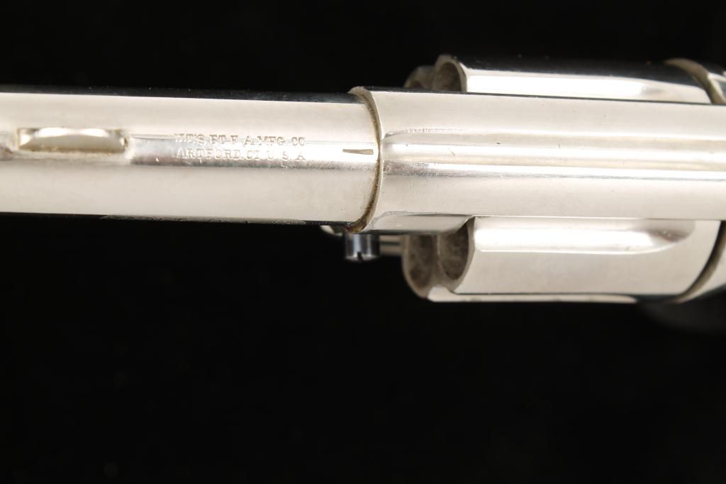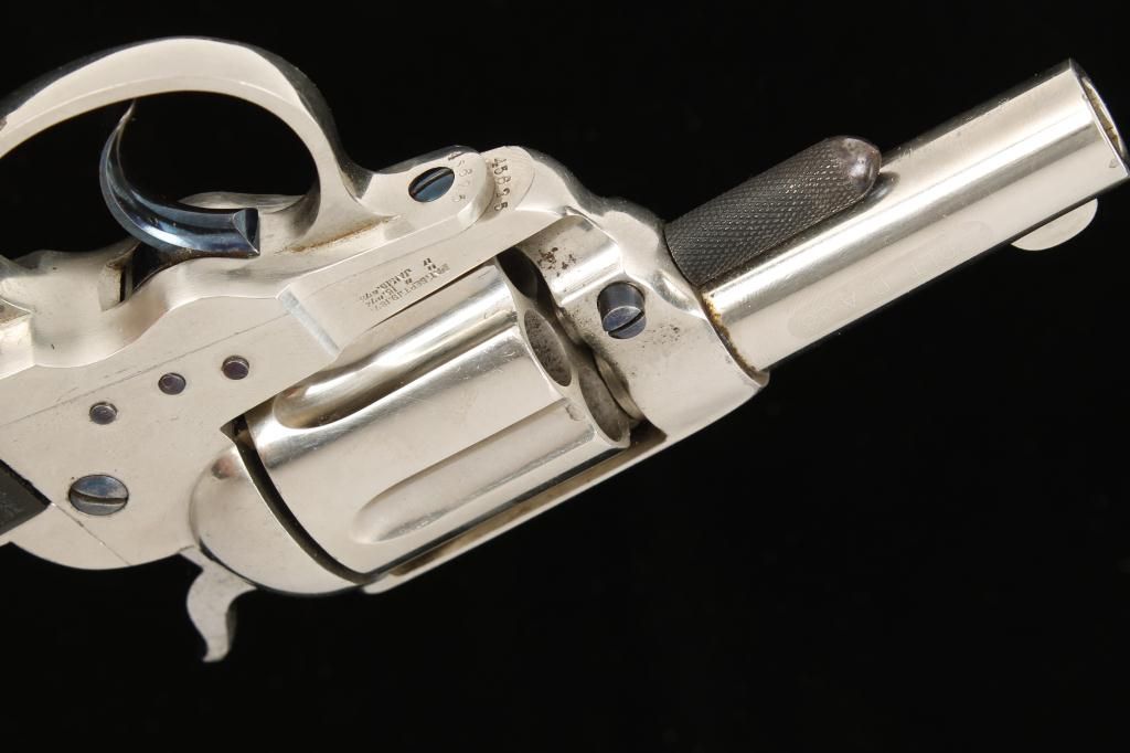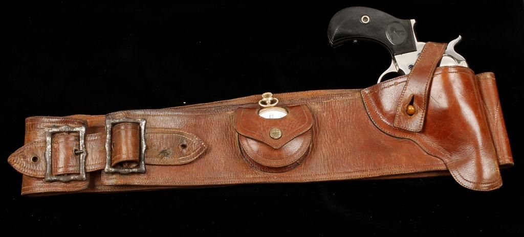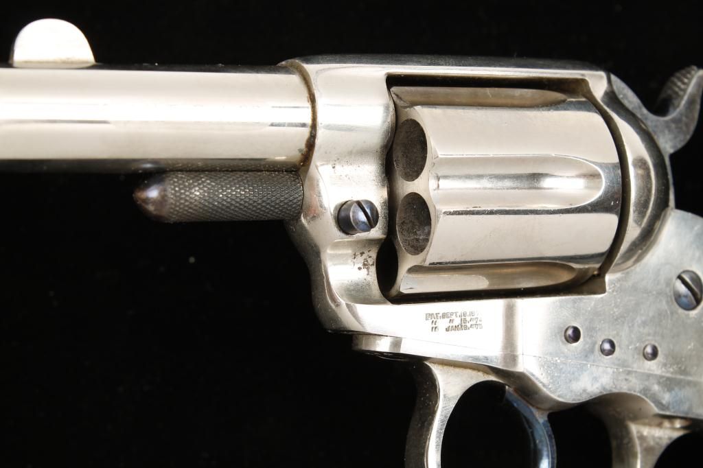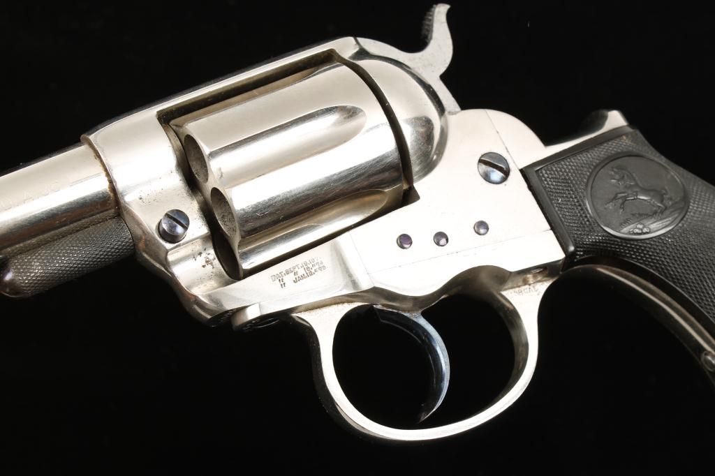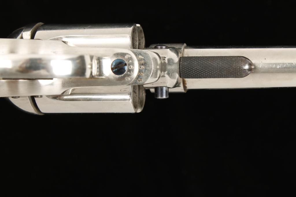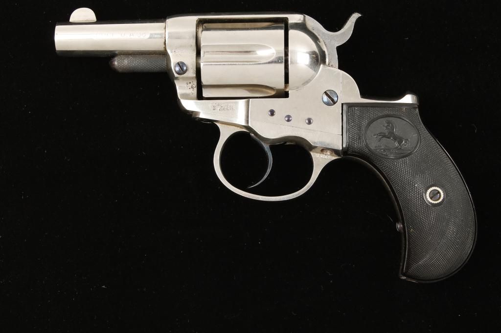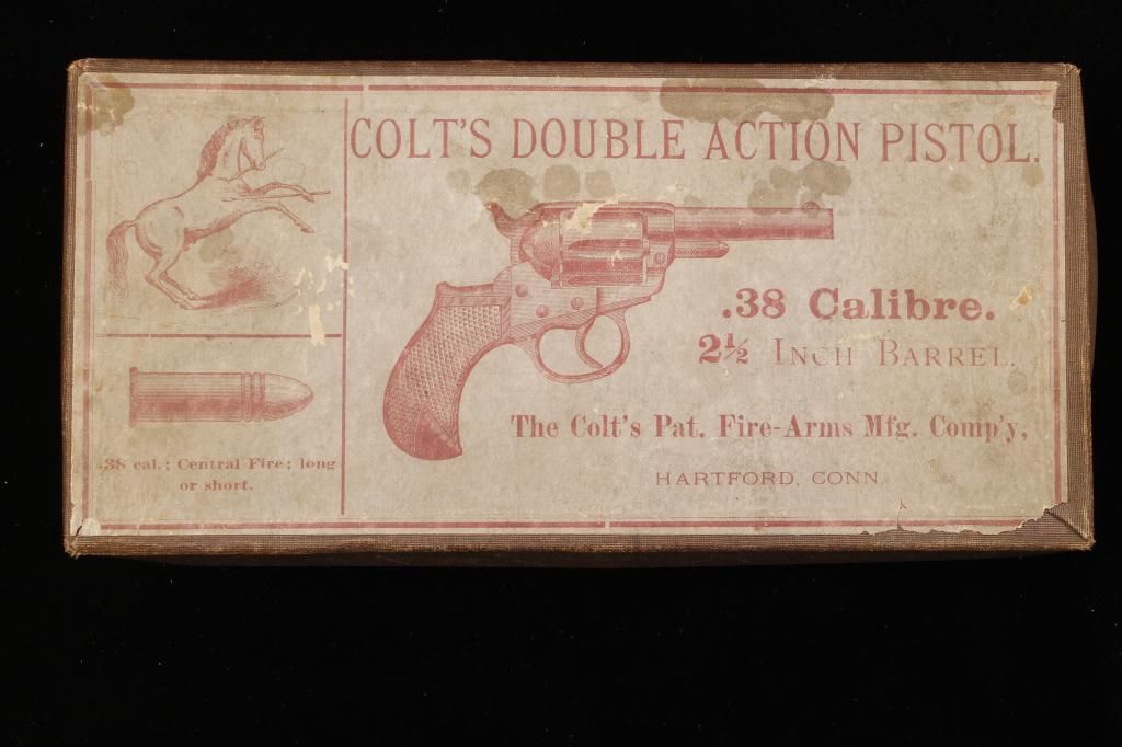 Colt 1877 Lightning Model, double action revolver, .38 caliber, 2 ½” barrel, nickel plated remaining in excellent condition with its original cardboard picture box, serial number 45625 shipped October 30, 1883 withall features verified by factory letter and sent to Hartley & Graham, New York, New York. Included with this revolver is an original messenger style belt with double buckles and provision for both revolver and pocket watchwith pocket for money or dispatch letters. The bottom of the original cardboard box is inscribed in pen “Property of Louis B. Gately U.S. Army aviation”. Louis B. Gately was born August 8, 1898 in Westerly, Rhode Island and attended Cornell University also he served in World War I and traveled throughout the West and Arizona in the early 1920s possibly where he obtained this Colt. This Colt retains 98% plus bright original nickelwith just some very small areas of pinprick pitting starting on the front edges of the frame (Minute). The etched panel is frosty and nearly 100%. The hammer, screws and small parts show all of their original bright fire