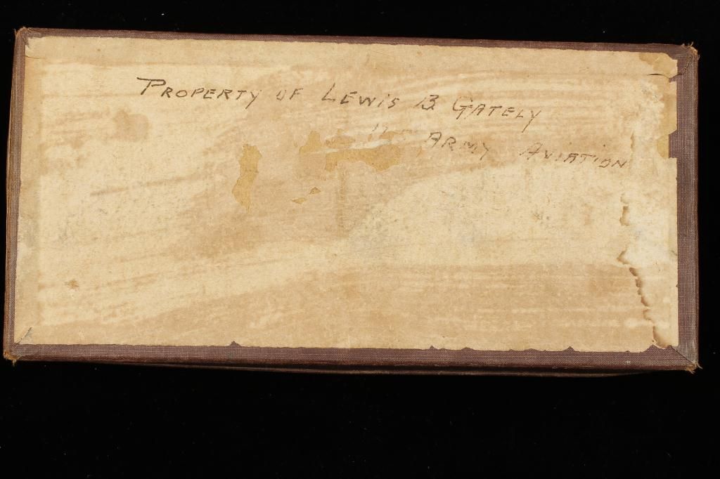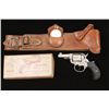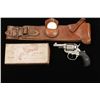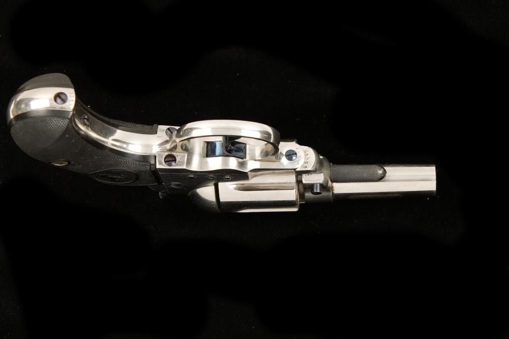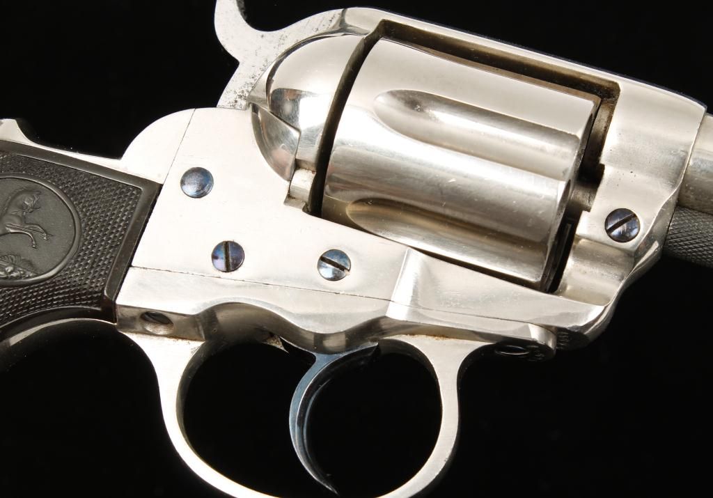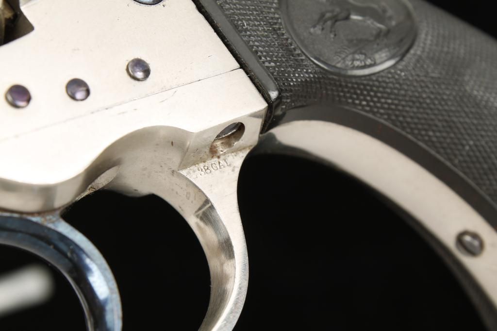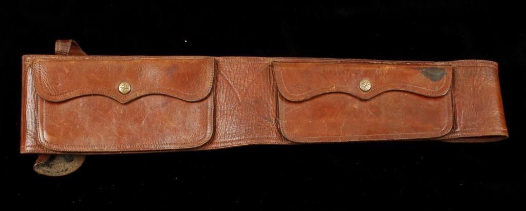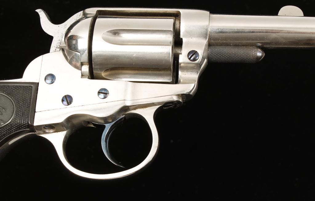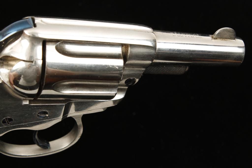 Colt 1877 Lightning Model, double action revolver, .38 caliber, 2 ½” barrel, nickel plated remaining in excellent condition with its original cardboard picture box, serial number 45625 shipped October 30, 1883 withall features verified by factory letter and sent to Hartley & Graham, New York, New York. Included with this revolver is an original messenger style belt with double buckles and provision for both revolver and pocket watchwith pocket for money or dispatch letters. The bottom of the original cardboard box is inscribed in pen “Property of Louis B. Gately U.S. Army aviation”. Louis B. Gately was born August 8, 1898 in Westerly, Rhode Island and attended Cornell University also he served in World War I and traveled throughout the West and Arizona in the early 1920s possibly where he obtained this Colt. This Colt retains 98% plus bright original nickelwith just some very small areas of pinprick pitting starting on the front edges of the frame (Minute). The etched panel is frosty and nearly 100%. The hammer, screws and small parts show all of their original bright fire