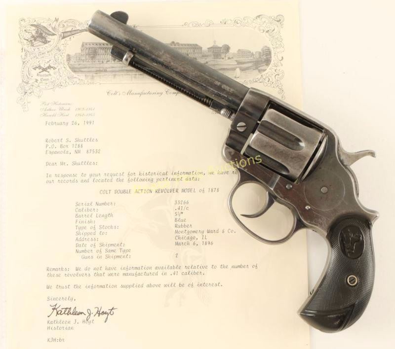 'Frontier' Double action six-shot revolver chambered in 41 Colt, circa 1894. Features a blued finish, 5 1/2" barrel with single line address, ejector rod, blade front sight, v-notch rear sight, smooth trigger, checkered hammer spur, fluted cylinder, swing-out loading gate, no lanyard loop and checkered two-piece Colt hard rubber bird's head grips. Includes a Colt factory letter confirming it's configuration and stating it was shipped to Montgomery Ward & Co. of Chicago, Illinois on March 6, 1986 in a two gun shipment. Revolver exhibits approximately 65% of it's original blued finish showing honest wear and a light amount of scattered pin prick pitting. The marking are mostly sharp with the serial number slightly less clear. Two addition marking have been made on the left side of the frame, a "C.H." in the finish and "CH" stamped in the metal. Action works well, bore is excellent and grips are near fine. Condition is fine. ***Antique Firearm***