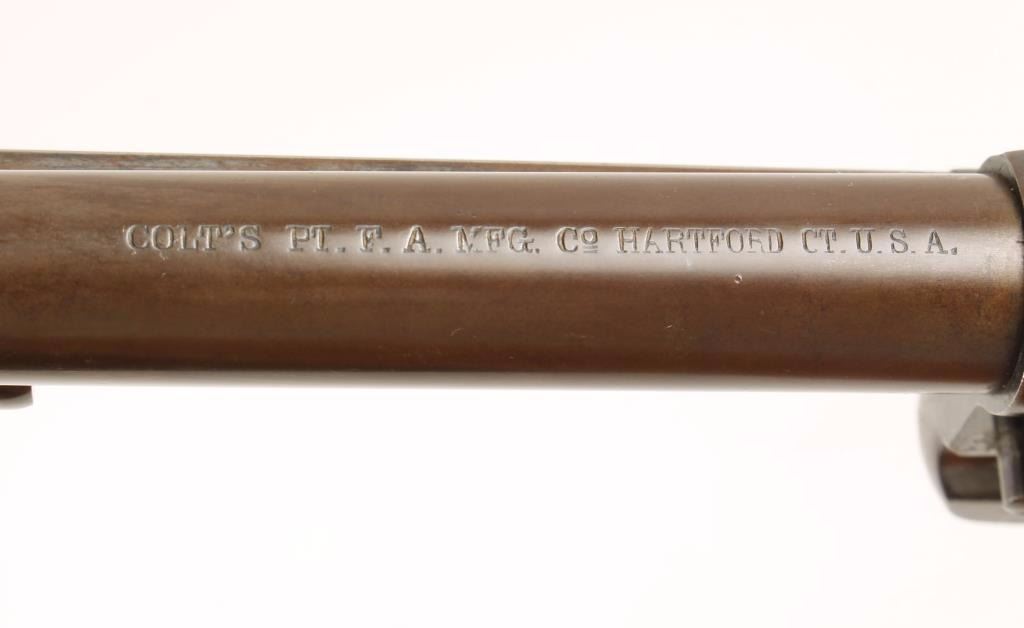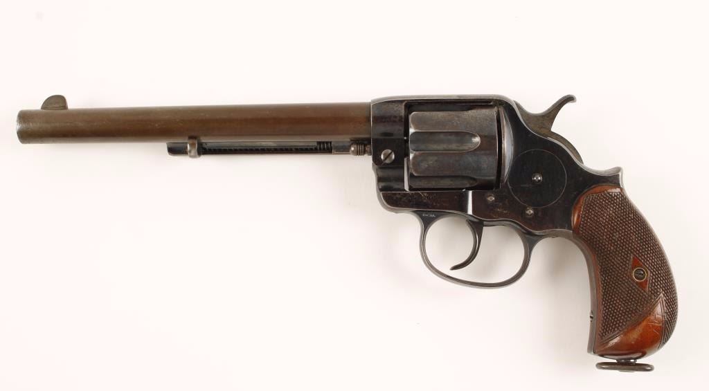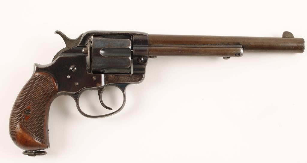 'Frontier' Early large frame double action revolver chambered in .45 Colt circa 1879. Features a 7 1/2" barrel, ejector rod, blade front sight, v-notched rear sight, blued frame with swing out loading gate, fluted 6 shot cylinder, checkered hammer spur, smooth trigger, lanyard loop and early style two piece checkered walnut grips. Finish on barrel has moved to an even brown patina, frame retains 75% original bright bluing, and cylinder retains 50% original finish mixed with patina. Wood grips are fine with semi sharp checkering, action is strong and bore is very good. Condition is near excellent as antique. ***Antique Firearm***