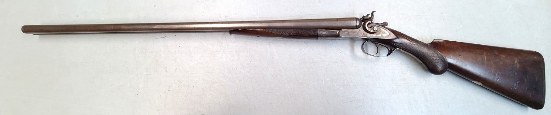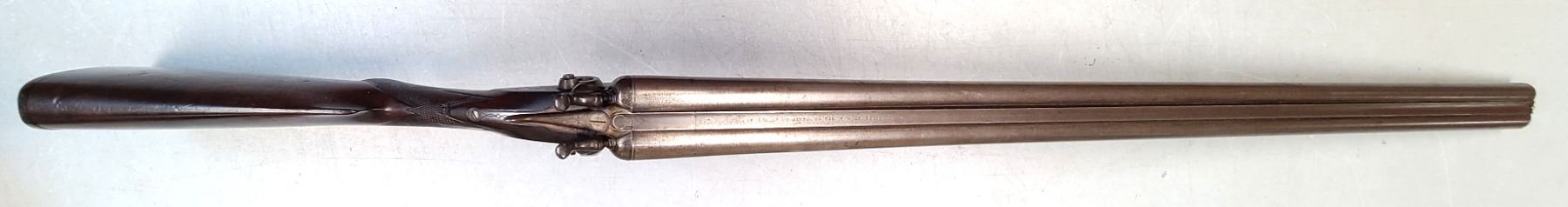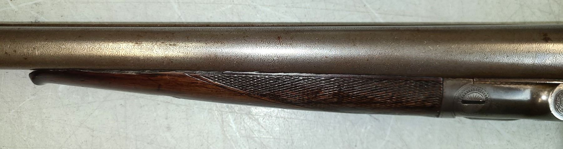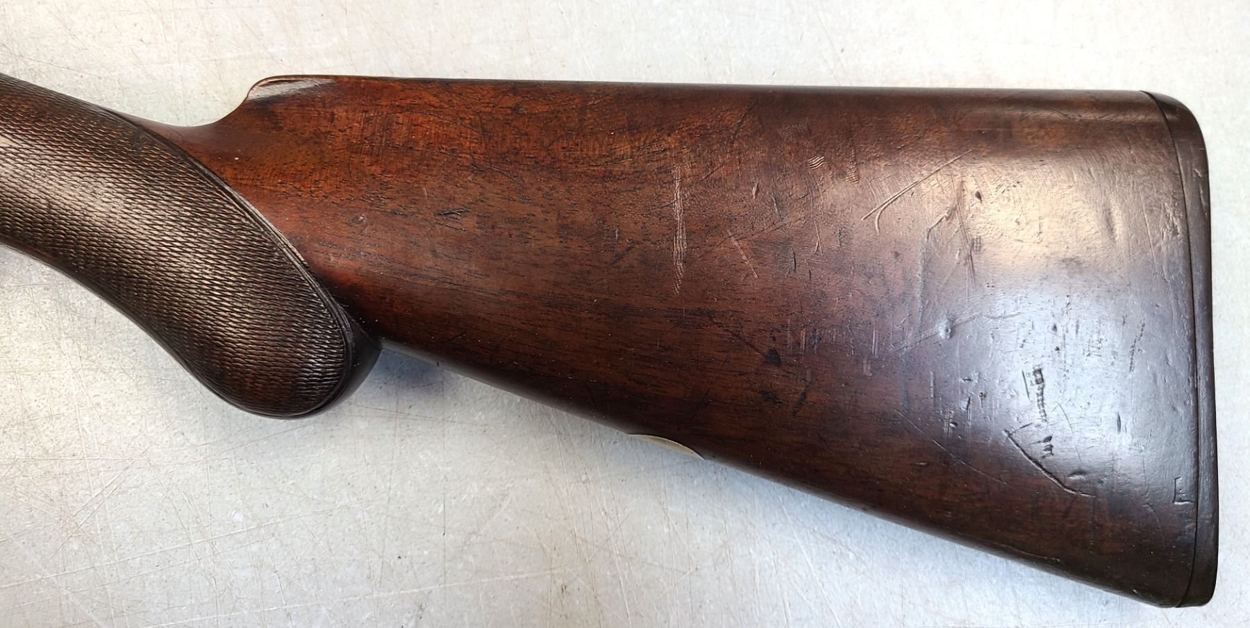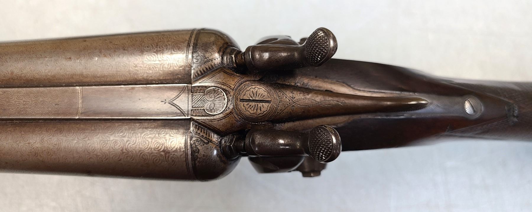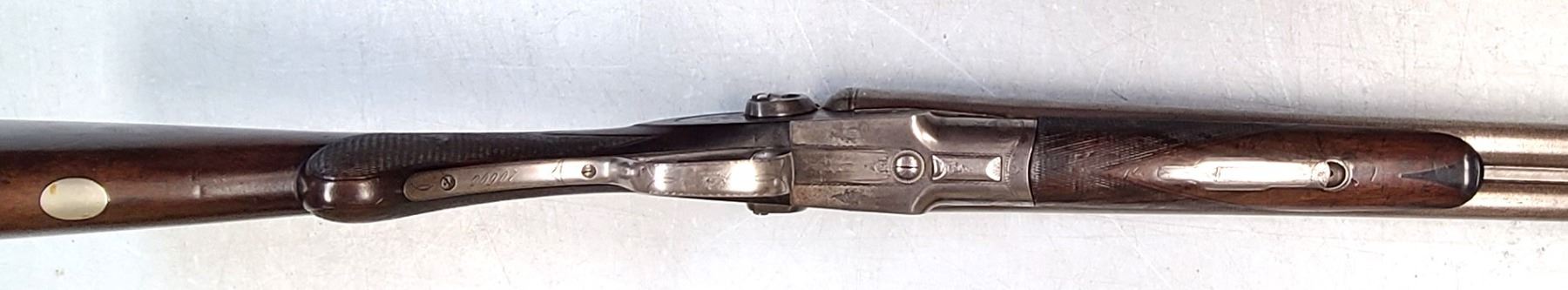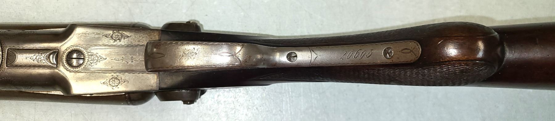 This double trigger shotgun is a 12-gauge solid rib with 30-inch barrels.