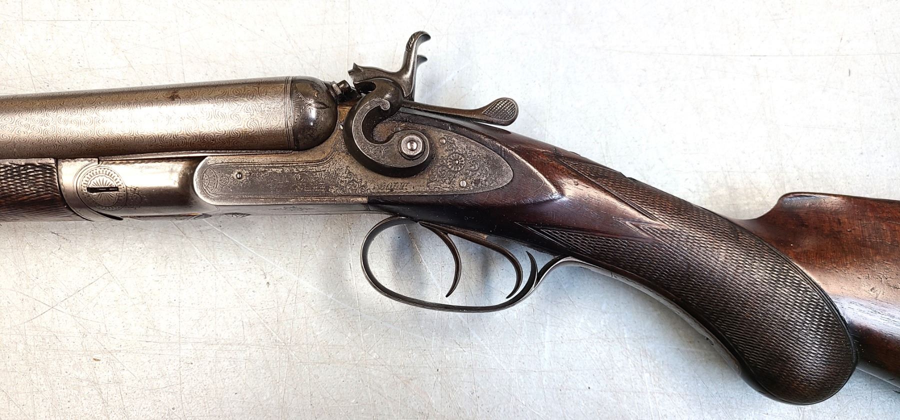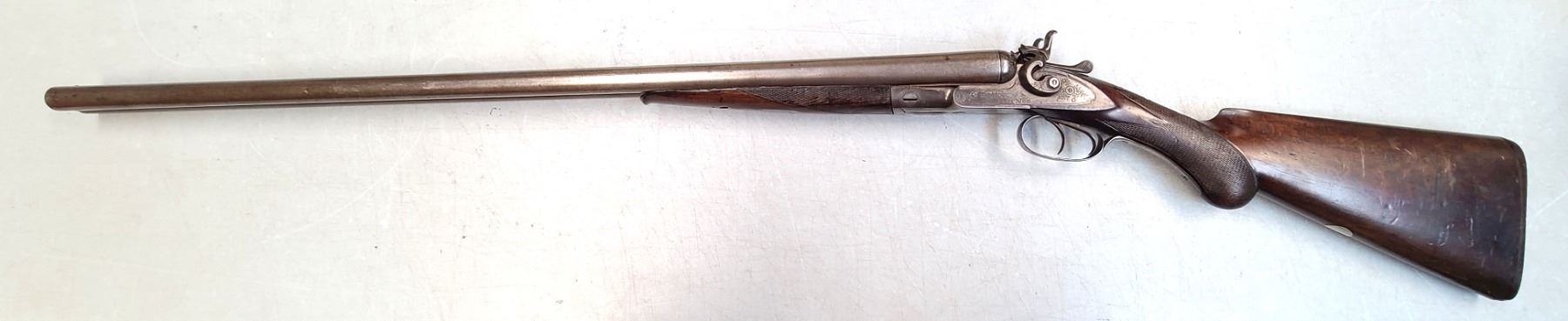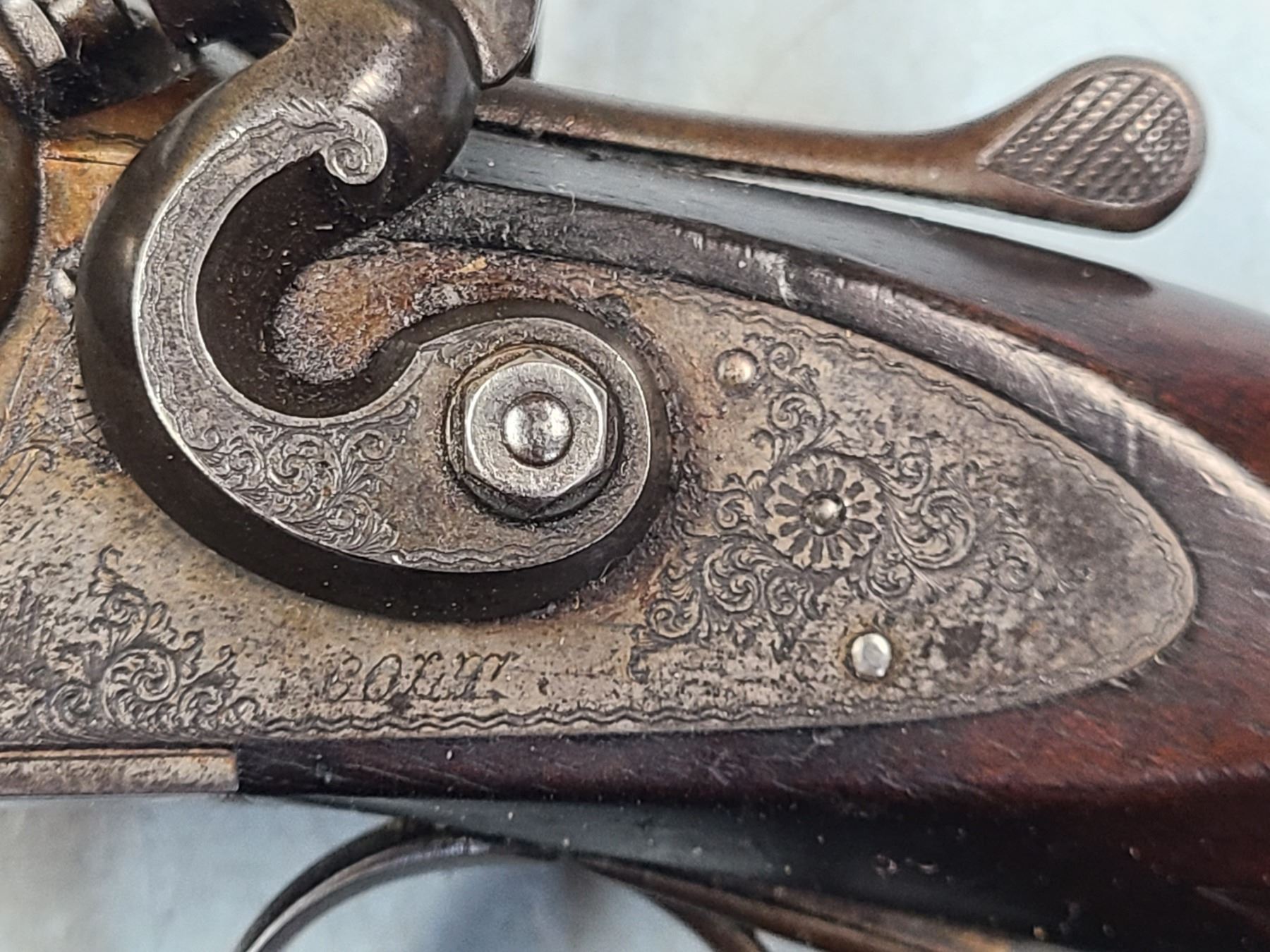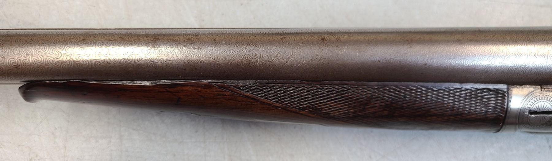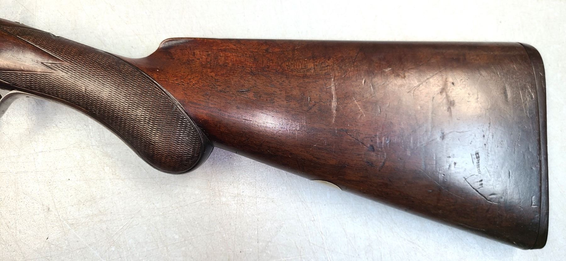 This double trigger shotgun is a 12-gauge solid rib with 30-inch barrels.