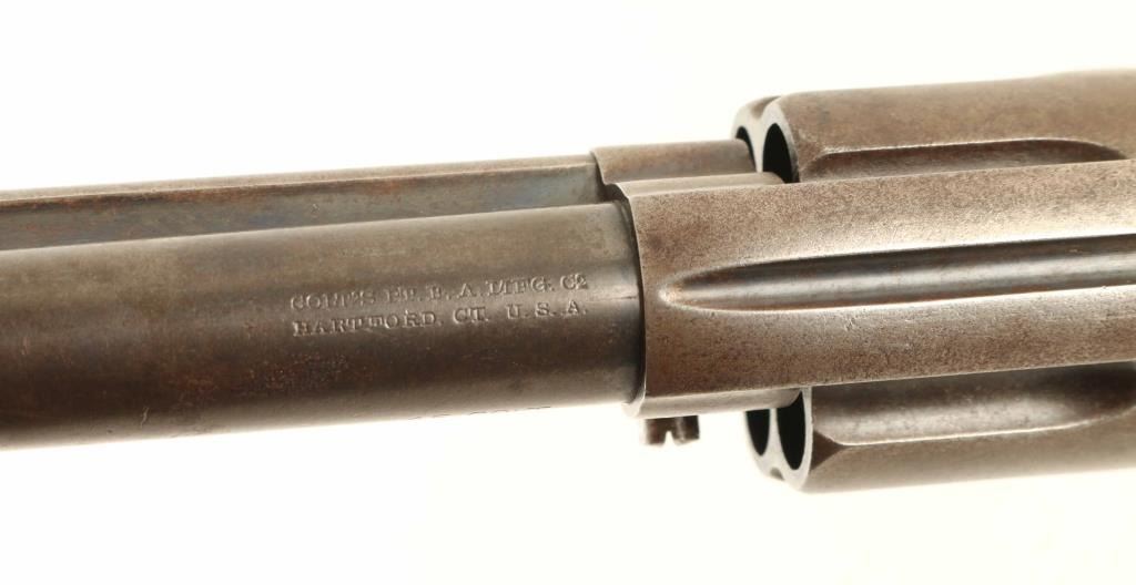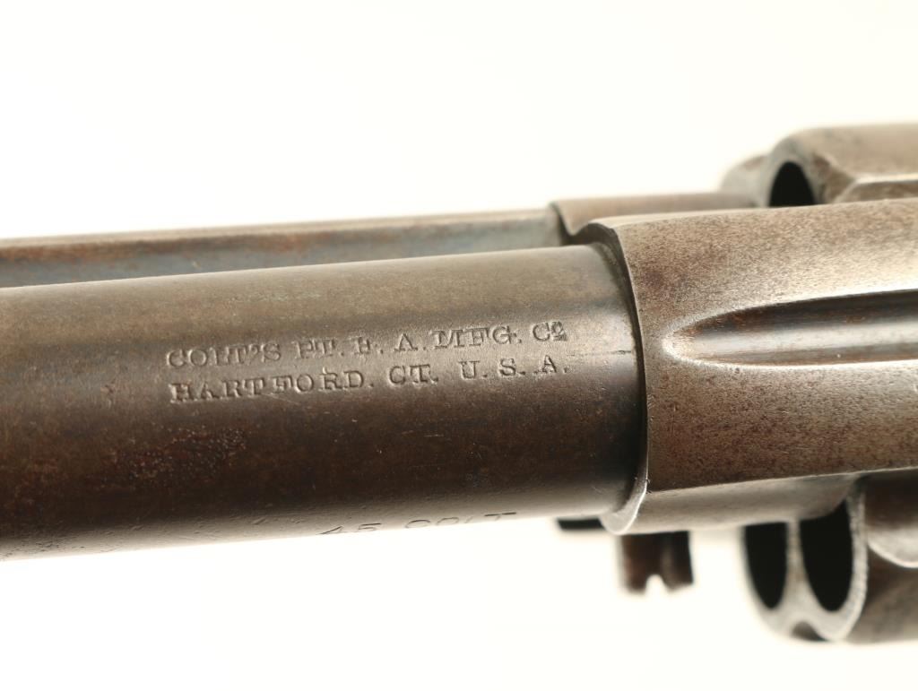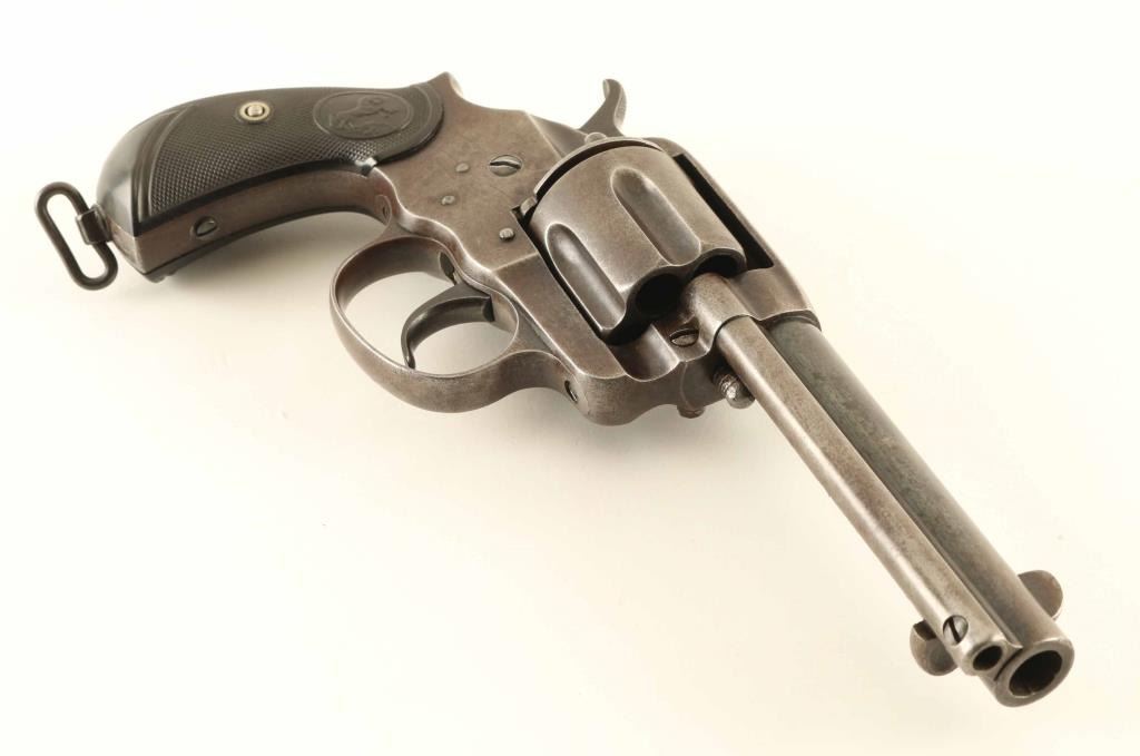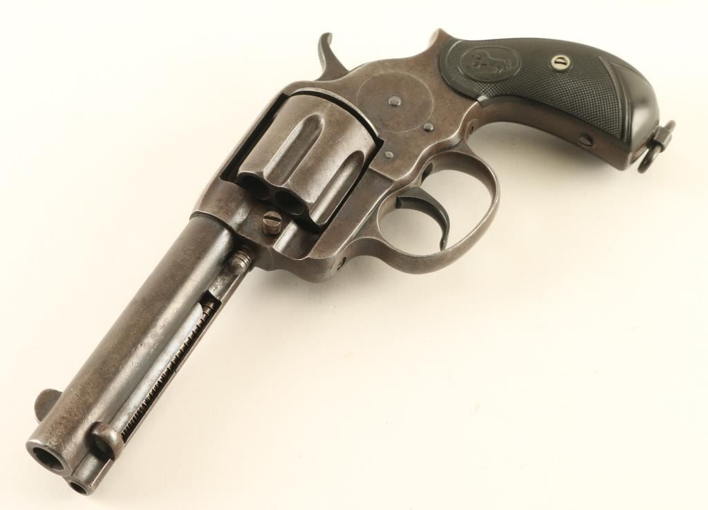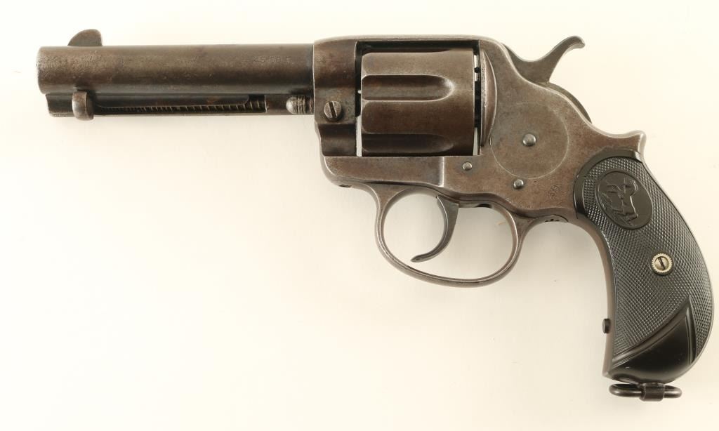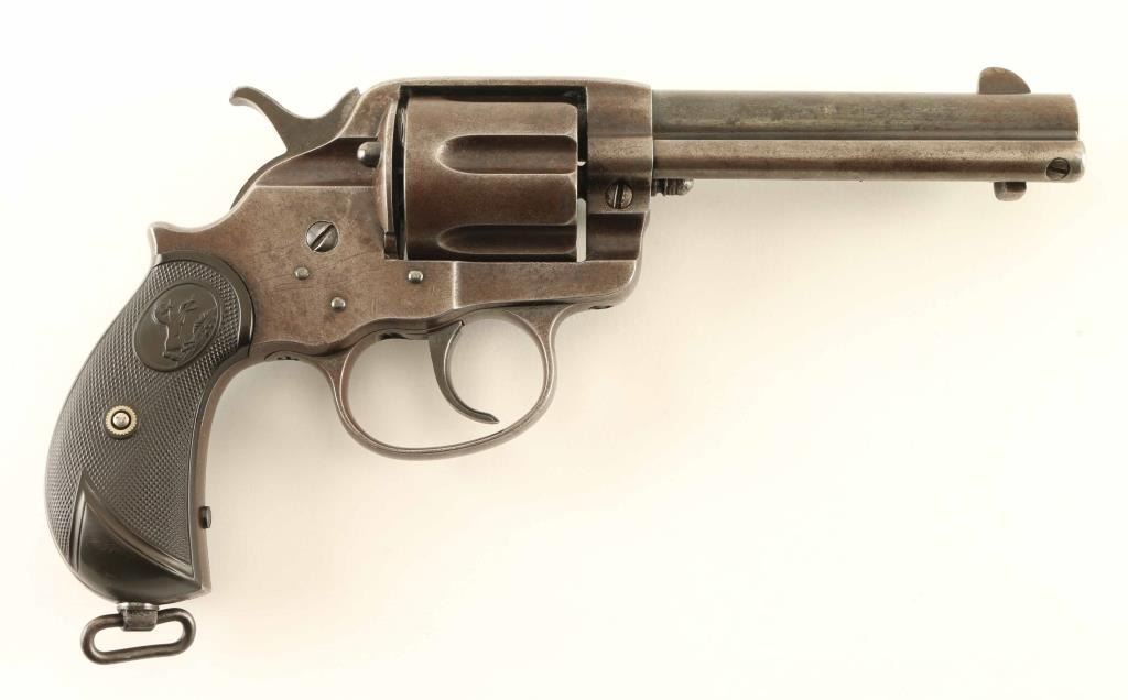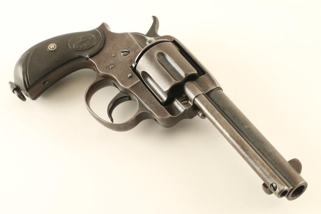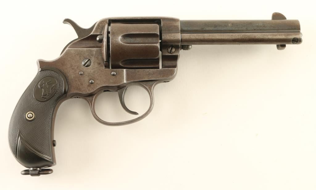 Large frame double/single action revolver manufactured circa 1894. Features blued finish, checkered dark brown gutta percha grips with Rampant Colt horse emblem, bird's head grip frame, 4.75" barrel with ejector rod, fixed sights, lanyard ring at butt. Bore is bright with good rifling, several small areas of pitting visible throughout. Retains full coverage of a dull grayish brown color, darker on barrel and protected top edge of ejector rod housing, shallow patina in many areas. Grips are good condition. Screw slot damage noted on right side of frame, surrounded by tiny shallow tool marks. Cylinder can turns slightly with trigger & hammer at rest. Action is fairly smooth with fair lock-up when trigger is held to rear, single action operation indicates hammer interference with trigger when firing. Double line barrel address and caliber marking are crisp. Colt emblem on left side of frame is slightly eroded or lightly struck on lower right. Condition is NRA Good +*** Antique Firearm ***