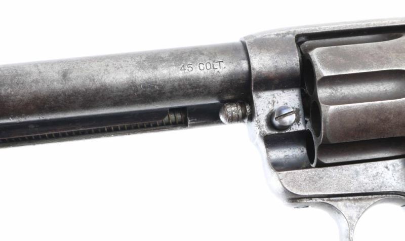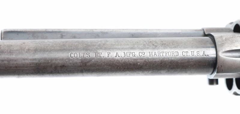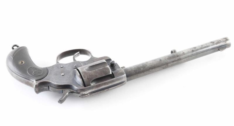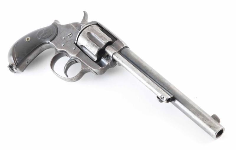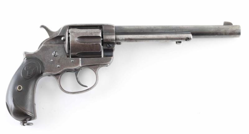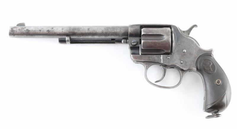 Large frame double/single action revolver manufactured circa 1896. Features blued finish, checkered dark brown gutta percha grips with Rampant Colt horse emblem, bird's head grip frame, 7.5" barrel with ejector rod, fixed sights, lanyard ring at butt. Bore needs cleaned but looks fine. Grips are good condition, with chip missing on right panel at rear of butt. Screw slot damage noted on right side of frame, along with tool marks around the screw hole. Caliber marking on left side of barrel. NRA Good Antique Firearm