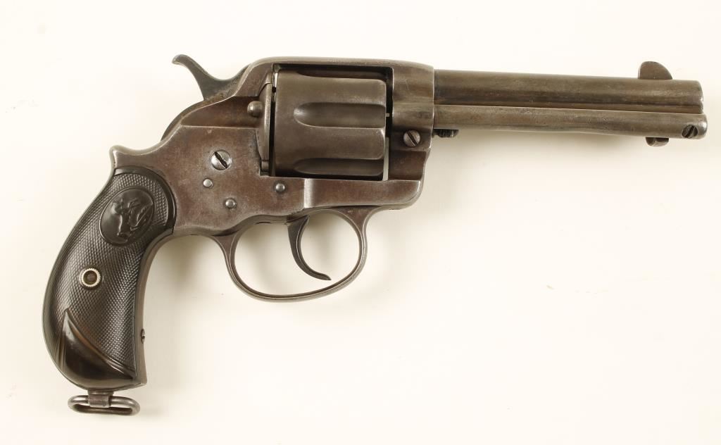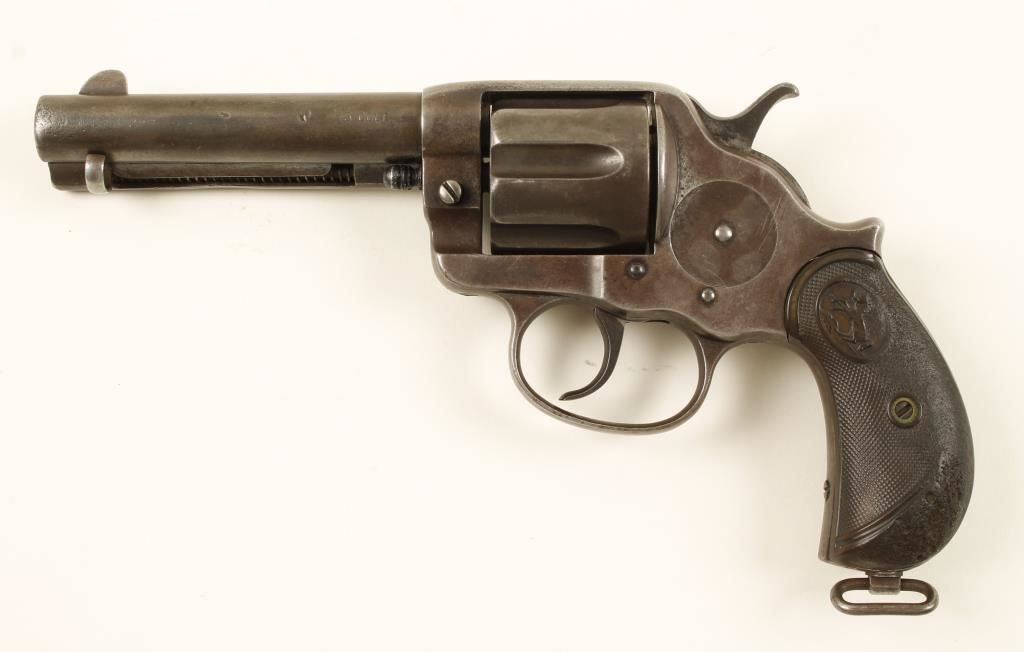 Blued large Frame double action six-shot revolver made in 1894. 4.75" barrel, fixed sights, swing out loading gate, lanyard loop, & checkered hard rubber birds head grips. Finish has turned to brown patina and action functions well. Left grip has damage as if it were burned. Overall condition is fait to good. *Antique Firearm*