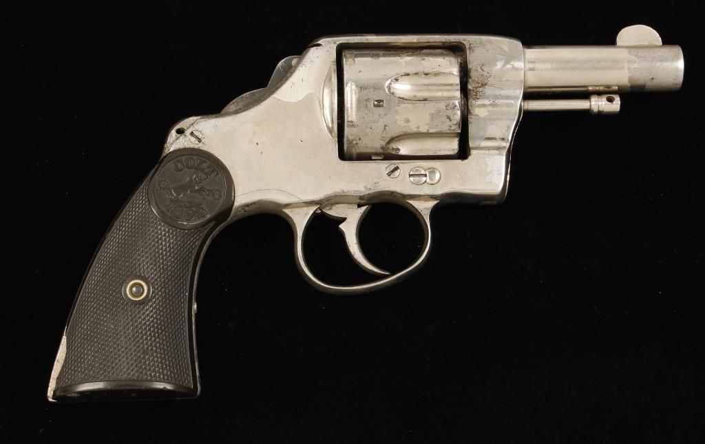 Bobbed hammer double action only six shot revolver made in 1893. Has a 3" barrel and vestiges of a 3-line address on the barrel. Bore is frosty with uneven surfaces. It has been nickel plated and it is now bubbling and flaking off. The frame behind the hammer and above the grips has been narrowed with a hole drilled through to accommodate a wire or cord which facilitated drawing from deep overalls of railroad men at the turn of the 20th century (by family tradition). The Model 1892 grips have chips in the lower rear corners. Condition is poor to fair but it is interesting.