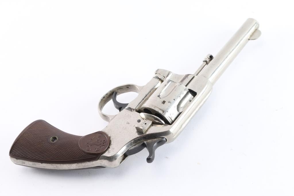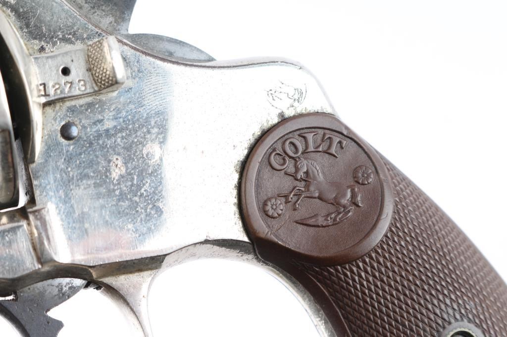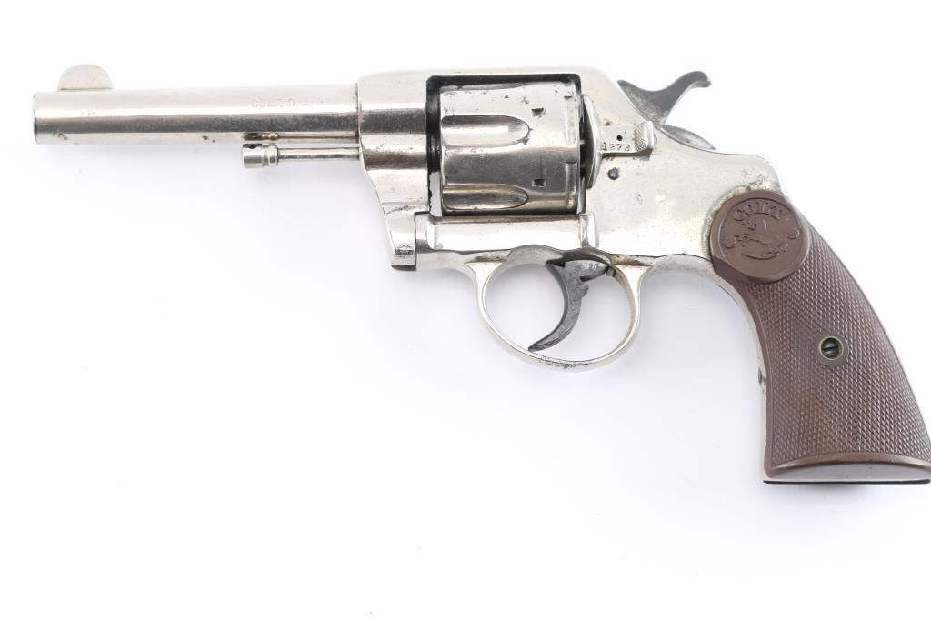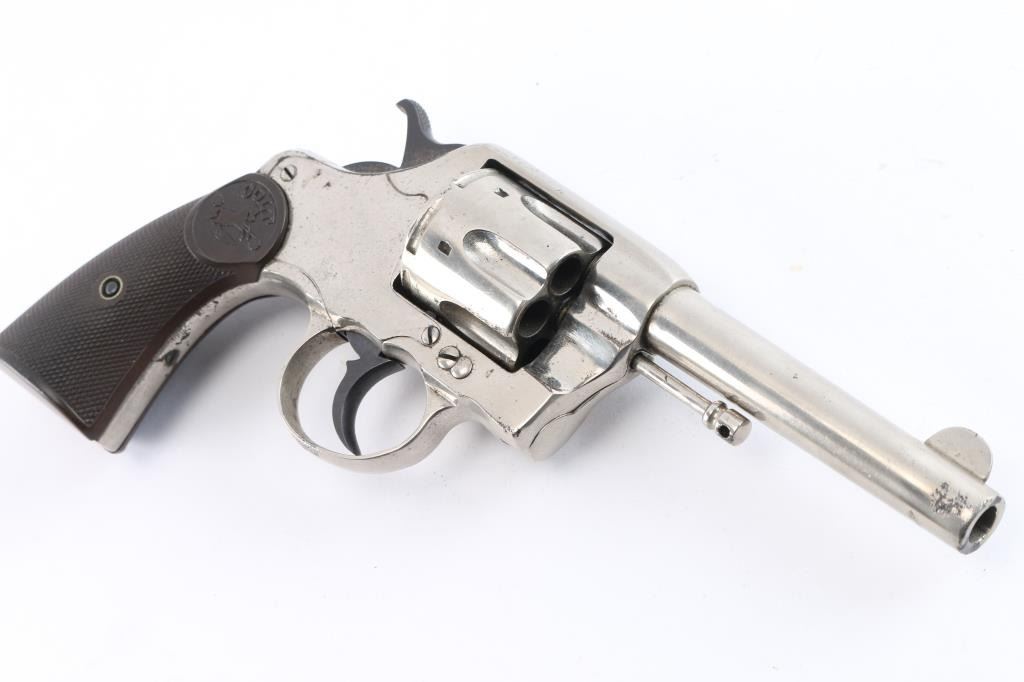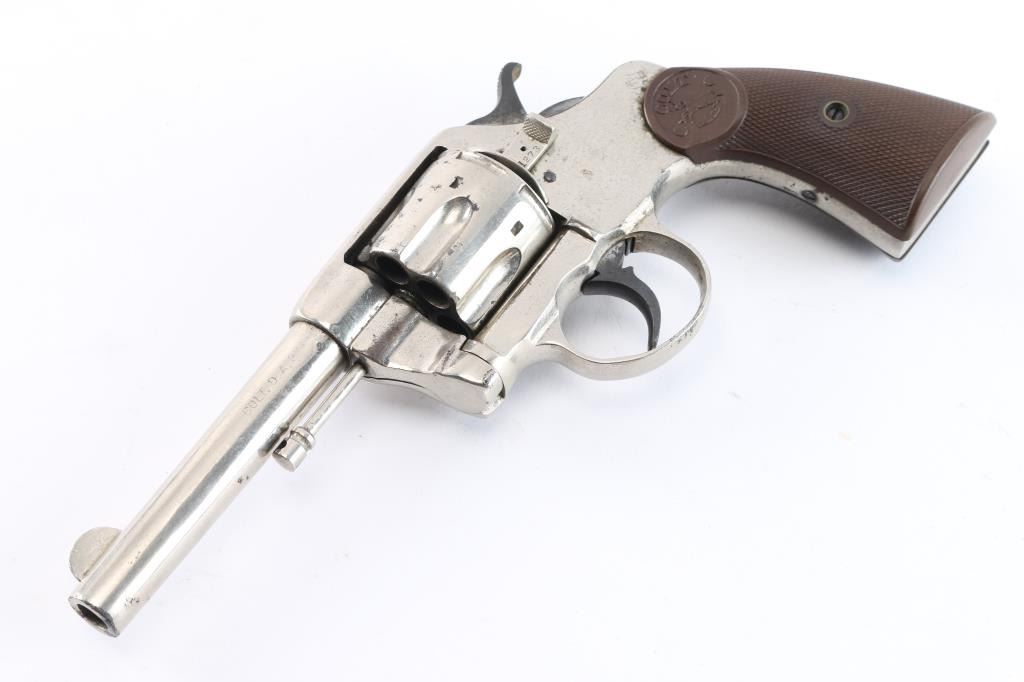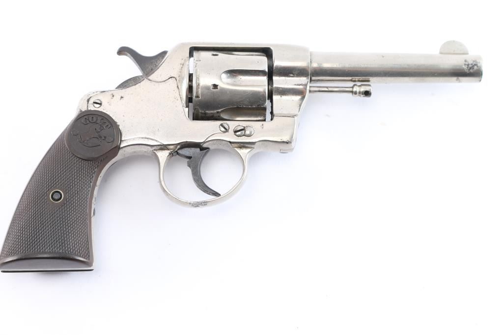 Commercial Colt 1892 New Army/Navy model chambered in .38 Long Colt. features a 4 1/2" barrel, exposed cylinder pin, swing-out 6 shot cylinder. The revolver has a very old nickel refinish obscuring the 3 line barrel address, brown checkered hard rubber grips with round "Colt" & Rampant Colt' motifs. Bore is overall good with strong rifling, some scattered very light pitting, action works well, grips are very good and the nickel refinish is about 85% with some flaking and patches of pitting.
