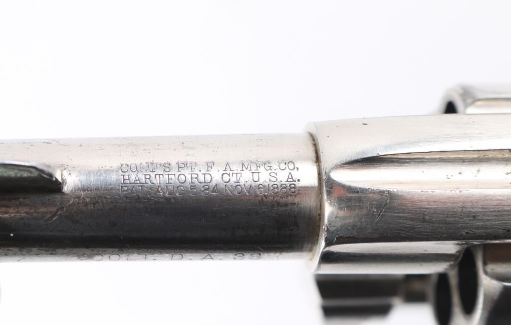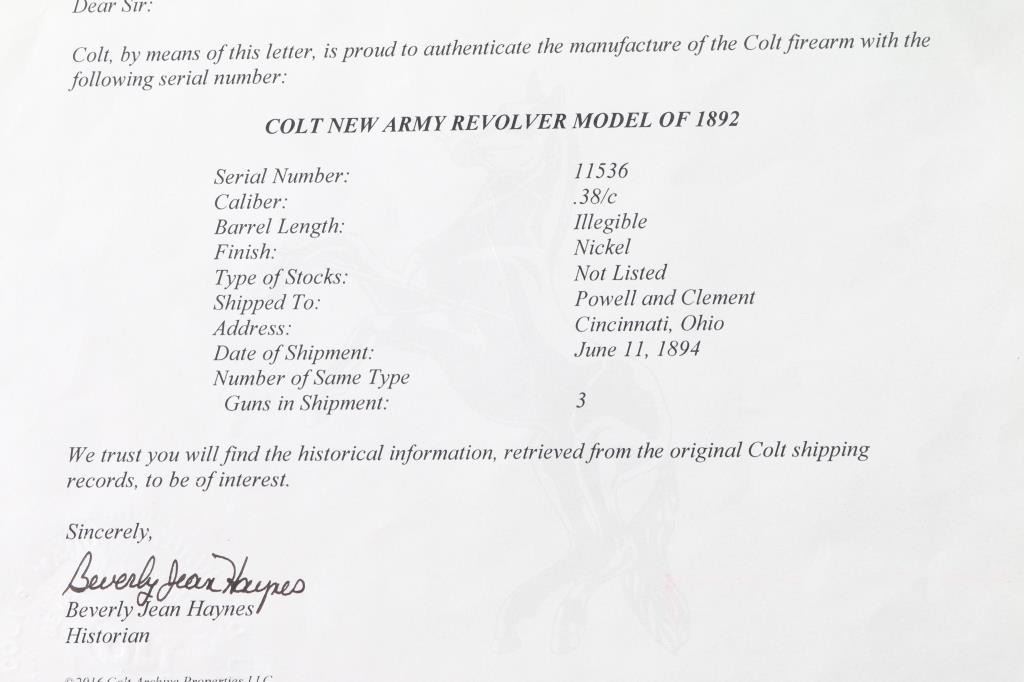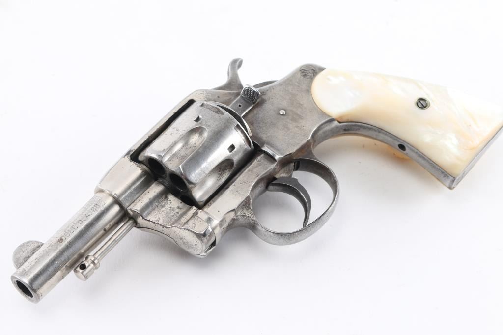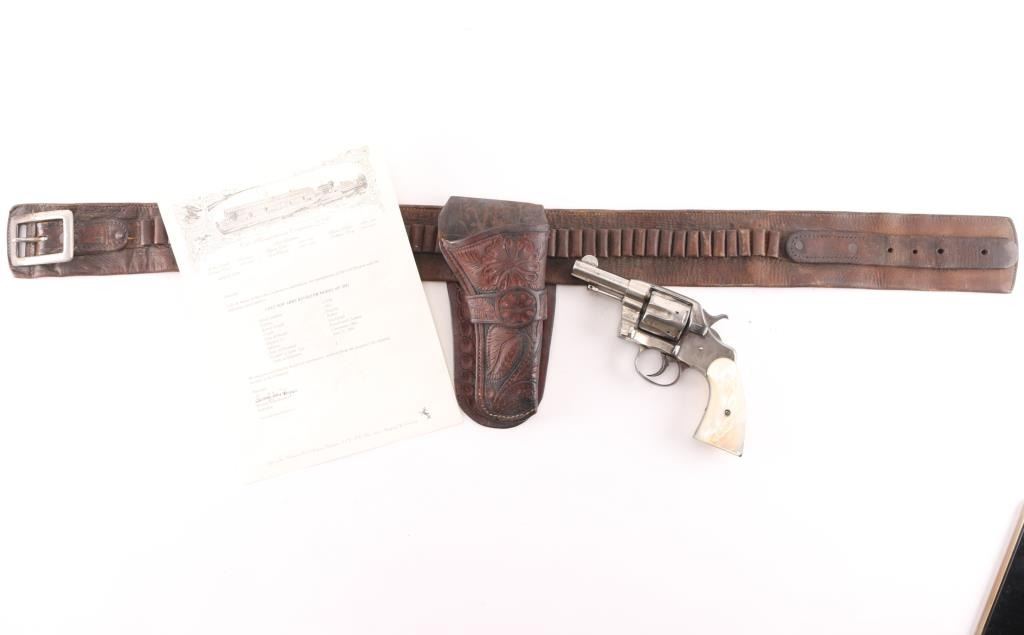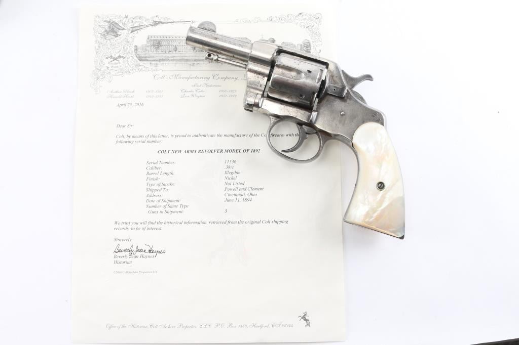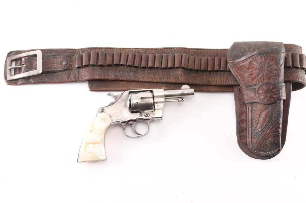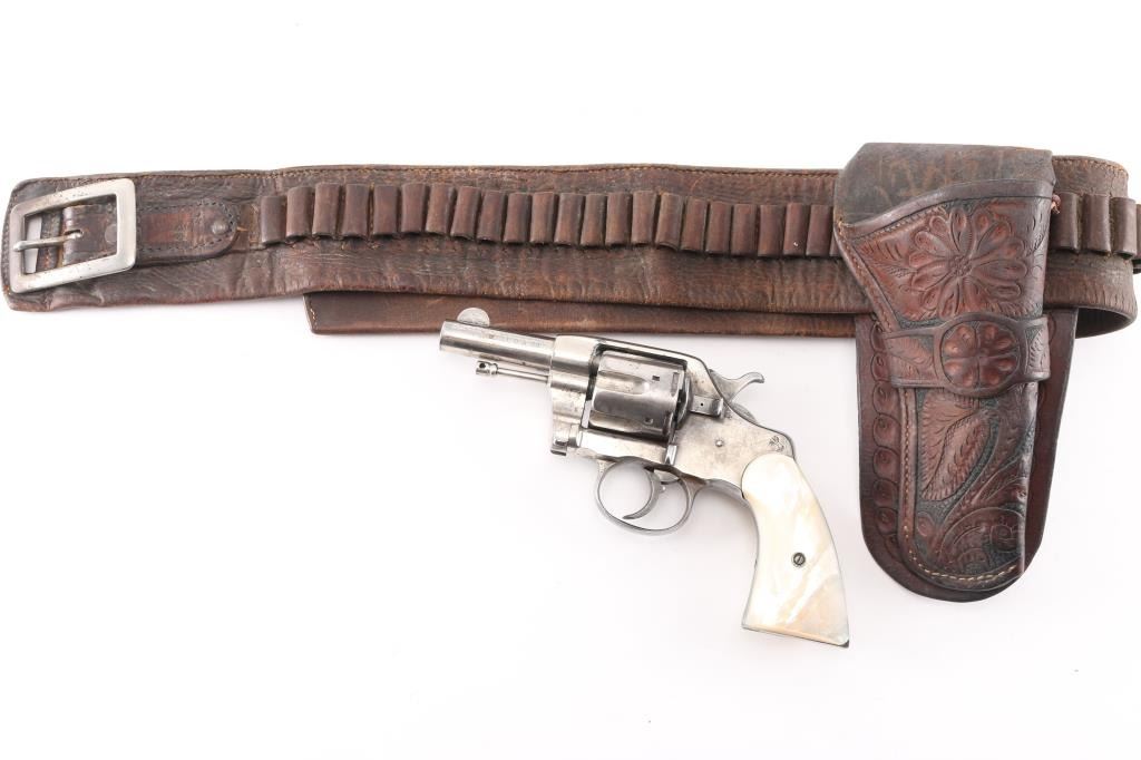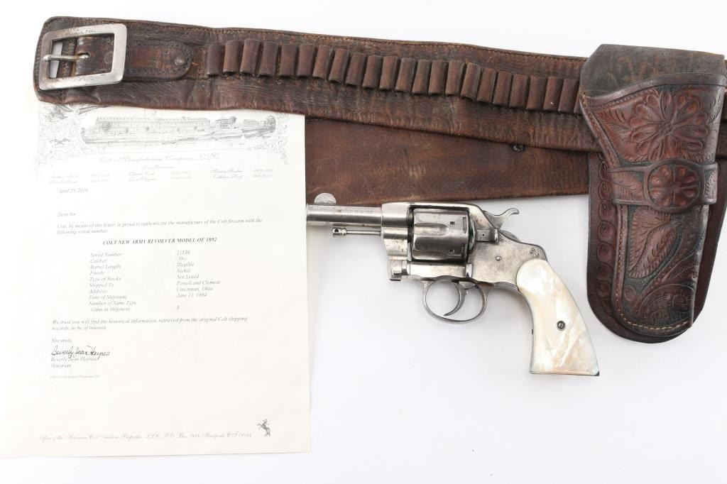 Civilian version of the Colt M1892 revolver, also known as the "New Army", lacked military markings and was sold with hard rubber grips featuring either a prancing Colt or the word "COLT" in an oval, depending on the model. This revolver has the Rampant Colt in circle at the rear of the left frame. Civilian version, was produced in approximately 10,000 to 12,000 units after Colt skipped over the next 2,000 serial numbers and started offering it on the civilian market around serial number 10,000 in 1893. Original nickel finish confirmed by factory letter. 3" barrel with half moon" front sight, integral rear sight. Nice period mother of pearl grips with raised steers head on right panel, non shrouded ejector rod. Assembly number "7" stamped on inside frame, crane and cylinder release, 3 line address/patent dates, "Colt D.A. 38 on left barrel. Bore is very good/bright, action is smooth with tight lock-up, grips are overall very good with a couple of very minor chips out of the right panel, nickel finish is about 85% with minor flaking on the right frame, edge wear and some scattered light pin-prick pitting. Comes with factory letter stating the revolver was shipped on June 11, 1894 to Powell & Clement, Cincinnati, Ohio, one of a 3 gun shipment. Confirms the caliber, finish and serial number. Also comes with a vintage holster rig marked "G.S. Garcia Maker Elko, Nev" in a circle on belt, brown leather with full coverage cartridge loop, single loop holster with hand tooled floral designs, overall very good condition with no tears, intact stitching with no separations. About size 30-32. Marked the same as the belt but a little faint from wear. Barrel is good fit to holster except the barrel is short about 2". Markings are clear/readable.NRA Condition-Excellent as Antique Firearm.