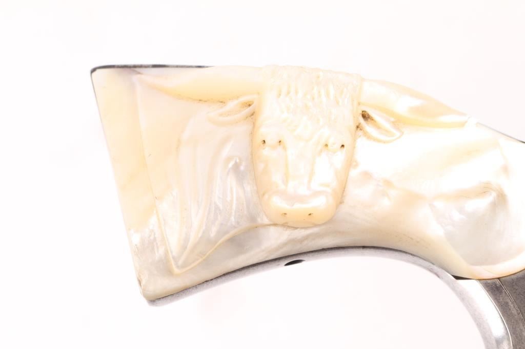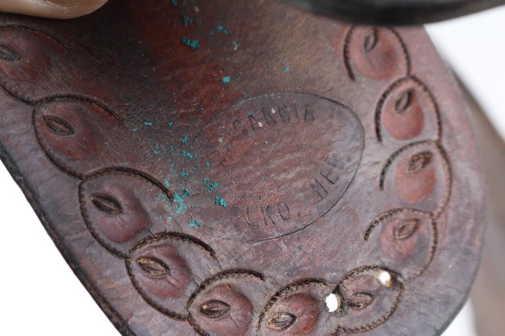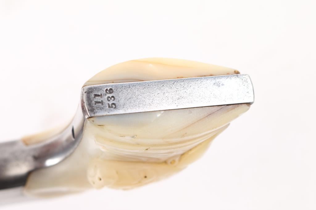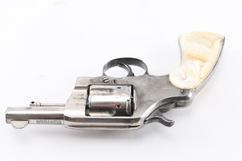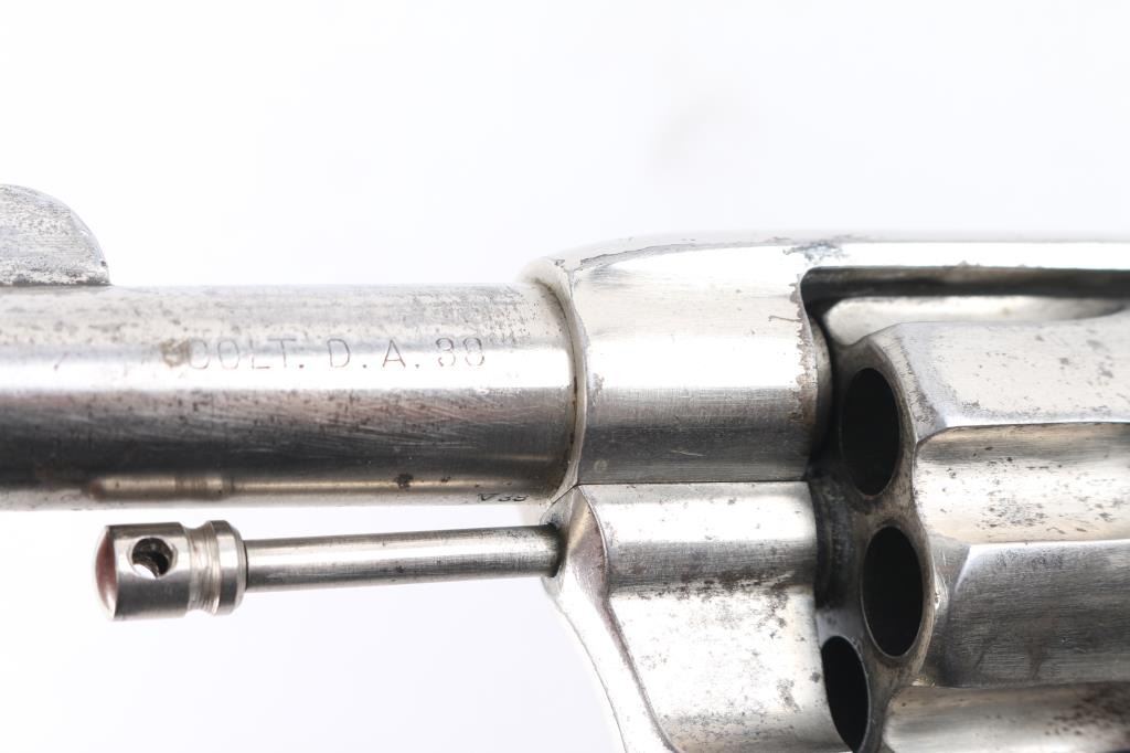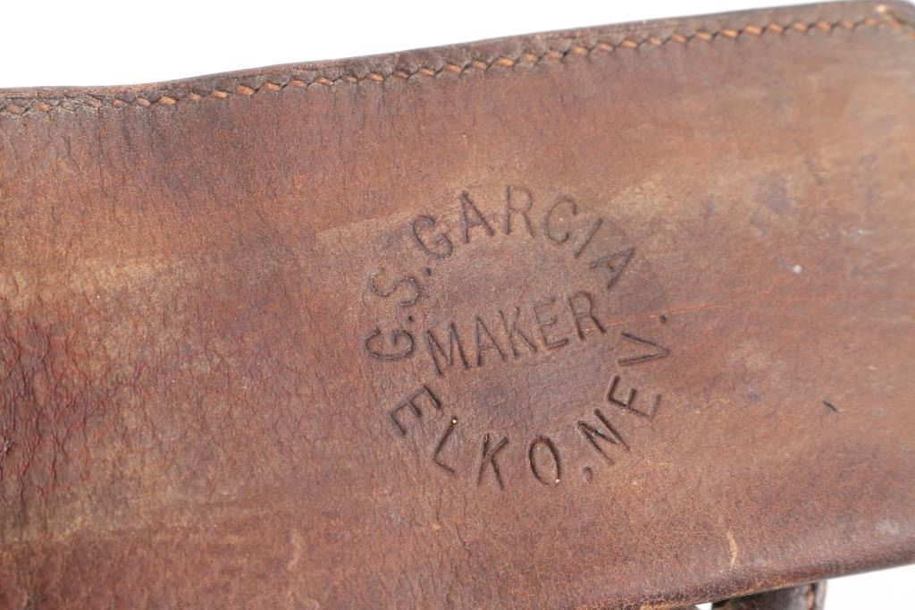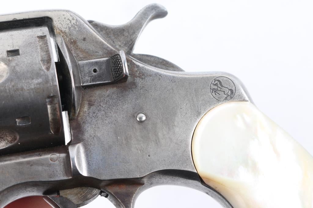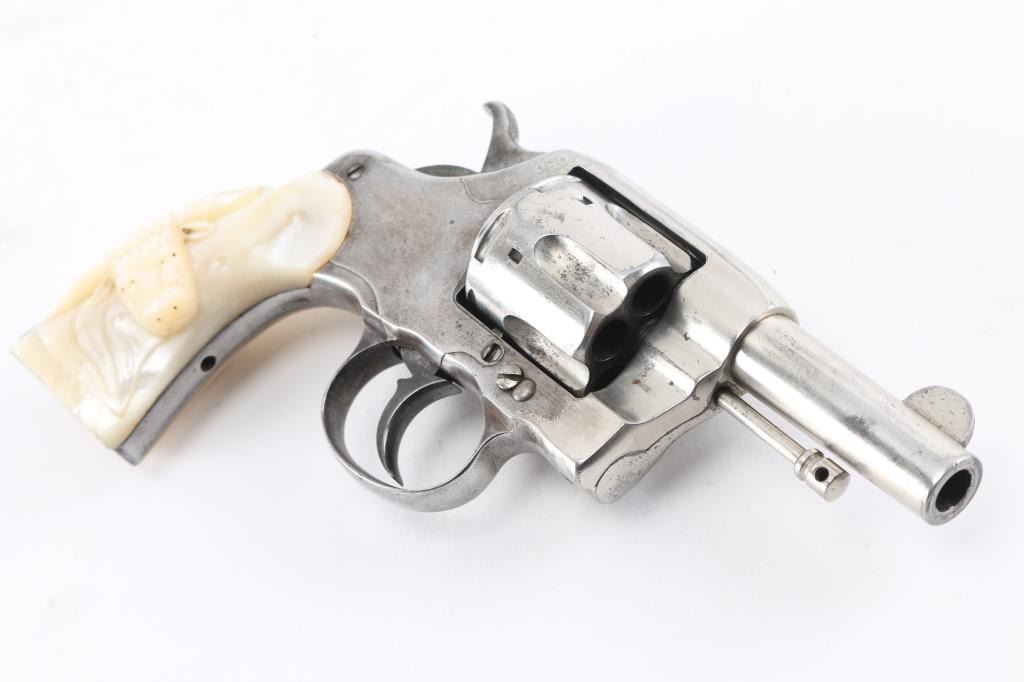 Civilian version of the Colt M1892 revolver, also known as the "New Army", lacked military markings and was sold with hard rubber grips featuring either a prancing Colt or the word "COLT" in an oval, depending on the model. This revolver has the Rampant Colt in circle at the rear of the left frame. Civilian version, was produced in approximately 10,000 to 12,000 units after Colt skipped over the next 2,000 serial numbers and started offering it on the civilian market around serial number 10,000 in 1893. Original nickel finish confirmed by factory letter. 3" barrel with half moon" front sight, integral rear sight. Nice period mother of pearl grips with raised steers head on right panel, non shrouded ejector rod. Assembly number "7" stamped on inside frame, crane and cylinder release, 3 line address/patent dates, "Colt D.A. 38 on left barrel. Bore is very good/bright, action is smooth with tight lock-up, grips are overall very good with a couple of very minor chips out of the right panel, nickel finish is about 85% with minor flaking on the right frame, edge wear and some scattered light pin-prick pitting. Comes with factory letter stating the revolver was shipped on June 11, 1894 to Powell & Clement, Cincinnati, Ohio, one of a 3 gun shipment. Confirms the caliber, finish and serial number. Also comes with a vintage holster rig marked "G.S. Garcia Maker Elko, Nev" in a circle on belt, brown leather with full coverage cartridge loop, single loop holster with hand tooled floral designs, overall very good condition with no tears, intact stitching with no separations. About size 30-32. Marked the same as the belt but a little faint from wear. Barrel is good fit to holster except the barrel is short about 2". Markings are clear/readable.NRA Condition-Excellent as Antique Firearm.