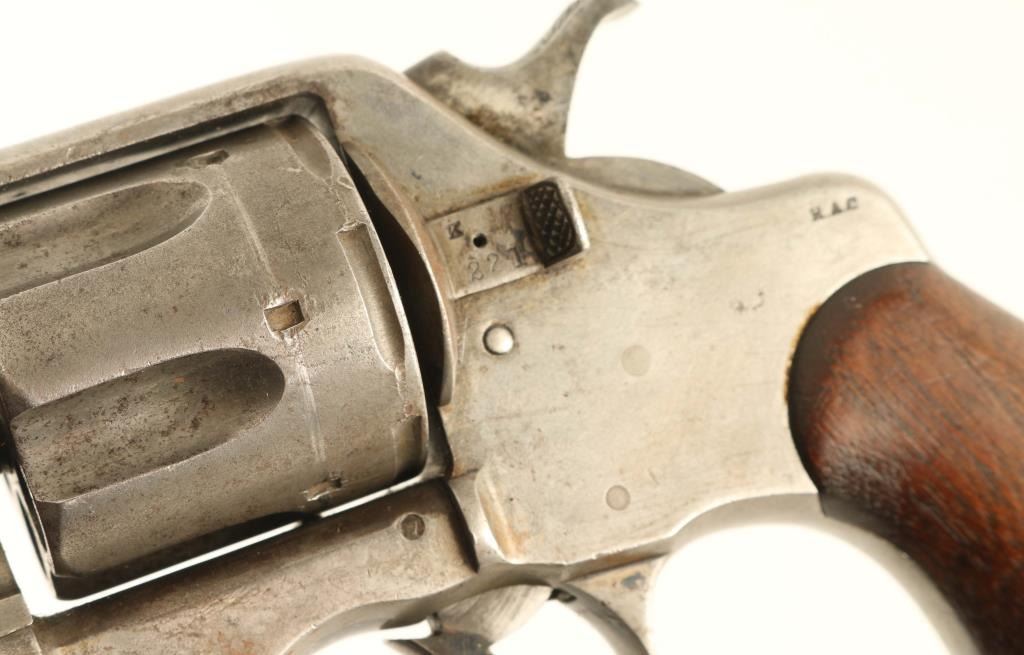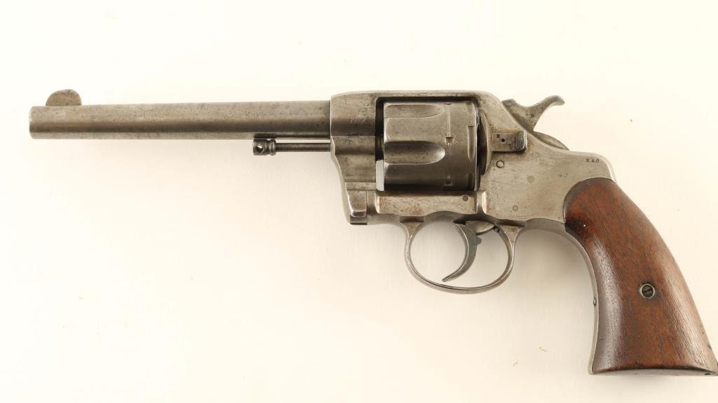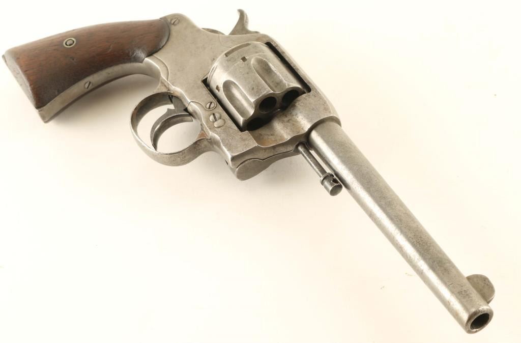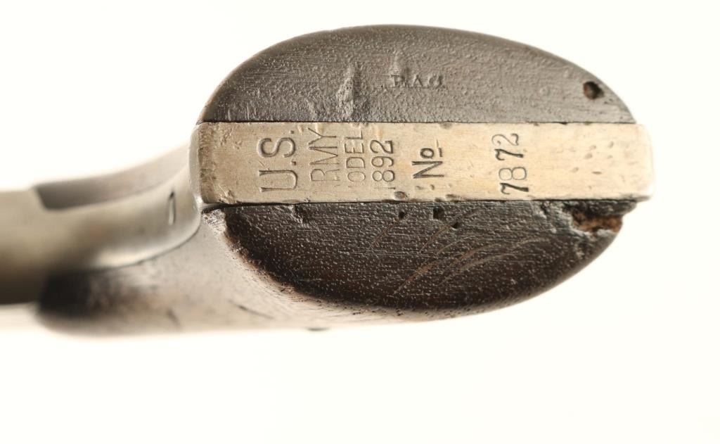 US Military revolver features 6" barrel, fixed sights, swing-out 6 shot cylinder, single/double action. Bore is good condition, bright with strong rifling, some tiny pits observed. Cylinder charge holes are good condition. Metal is almost entirely a dull light gray color, with remains of darker finish in a few protected areas. Grips are good or better condition walnut, small dents, fit to frame is good with missing wood at bottom points. Action is not working properly, cylinder rotates freely, hammer and trigger function and will occasionally rotate the cylinder. Markings include "RAC" on frame, "US ARMY MODEL 1892" on bottom of frame. Observed numbers on cylinder latch and crane do not match serial. Condition is NRA Fair *** Antique Firearm ***