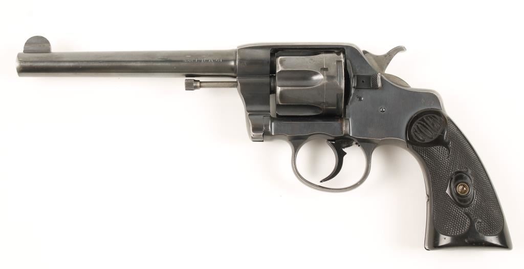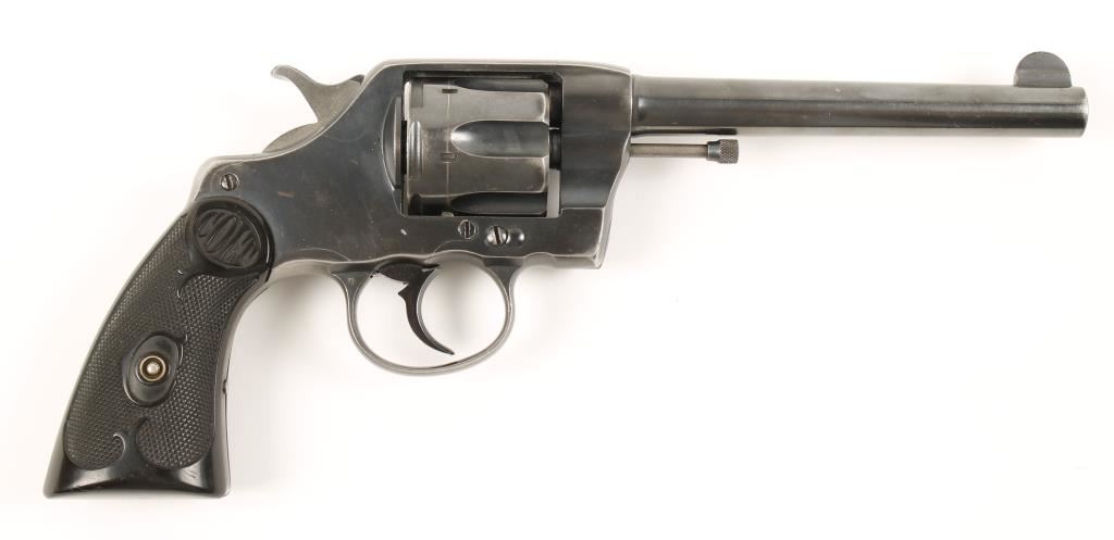 Blued double-action 6-shot revolver with a 6" barrel. Finish is bright with edge wear, wear to the grip straps, sharp roll-stamps and a drag line. bore is shiny with good rifling and the chambers are clear of deficiencies. Function is tight and smooth. Black hard rubber grips are in excellent condition. Condition is very good.