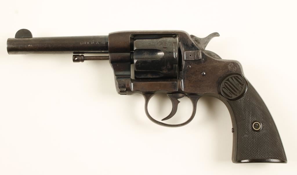 Blued double action six shot revolver. Has a 4.5:" barrel & black checkered hard rubber grips. Blued finish is turning to brown patina with much surface rust. Overall condition is fair to good. *Modern Firearm*