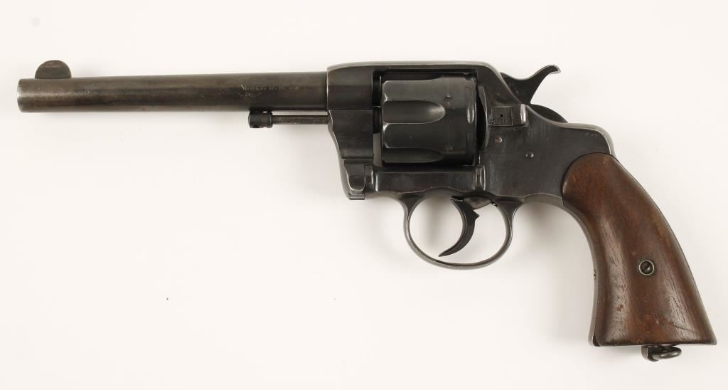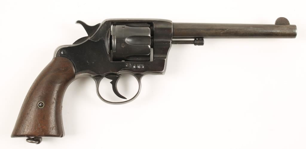 Marked "US ARMY Model 1901". Blued double-action 6-shot revolver. Finish is fading to a grey patina in exposed areas. Roll-stamping is sharp. Bore is shiny with worn rifling and the chambers are dirty but clear. Functions well with decent lock-up. Grips are plain smooth wood with dings and scratches and tiny chips at the corners. Condition is good. *Modern Firearm*