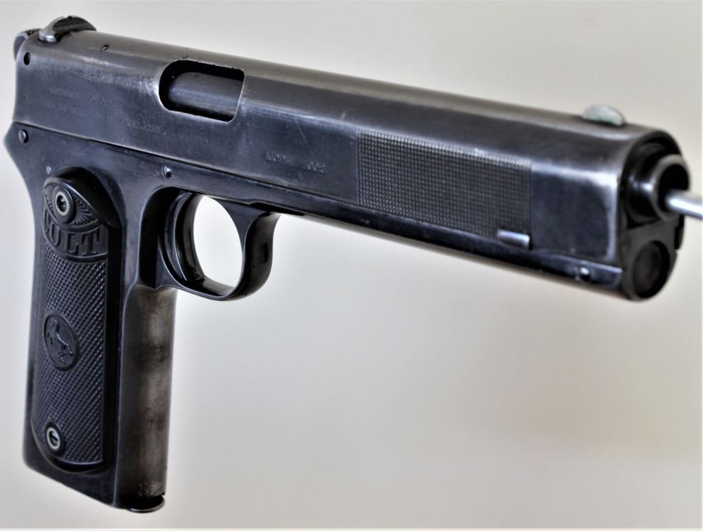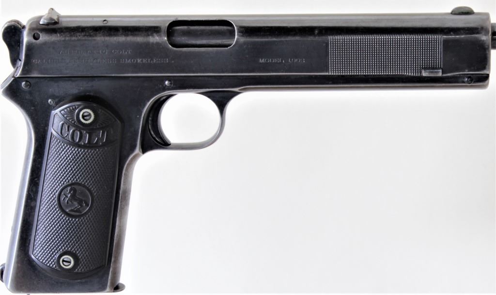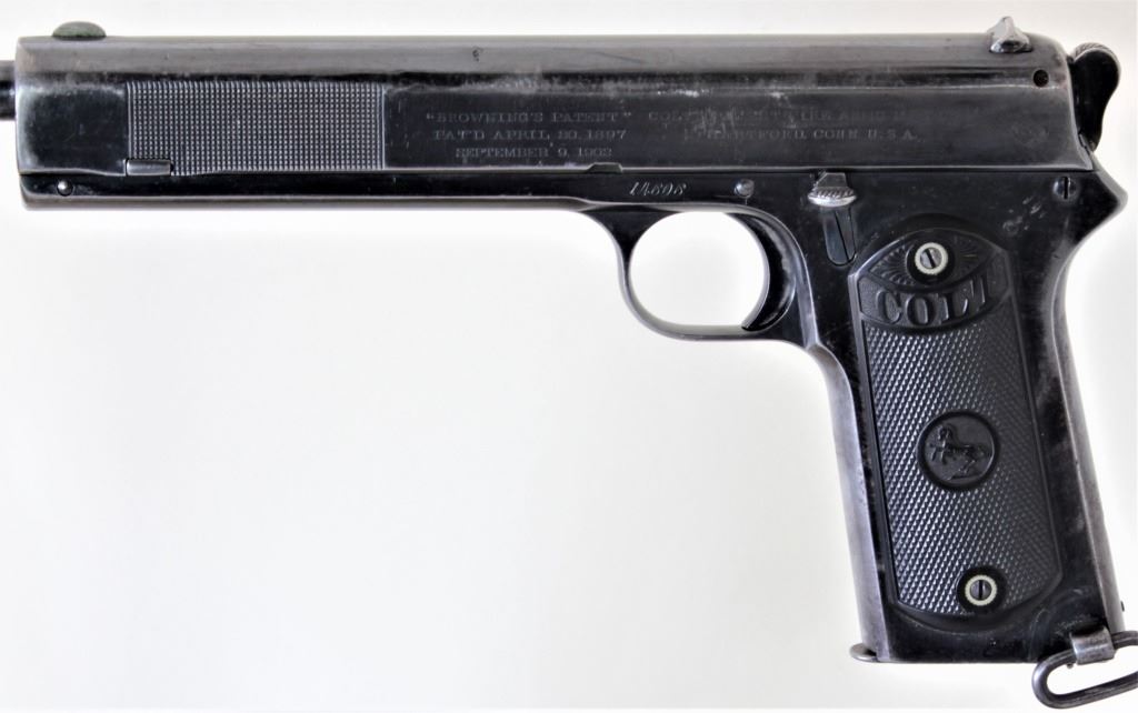 Colt 1902 .38 cal. SN 14606 semi auto 6" blued barrel and hard rubber checkered grips, military first type the slide with early front serration and 3 line patent on left side. Frame with lanyard ring on left side. Model 1902 on the right. Pistol remain6" blued barrel and hard rubber checkered grips, military first type the slide with early front serration and 3 line patent on left side. Frame with lanyard ring on left side. Model 1902 on the right. Pistol remains good to very good condition, 60-70% blue thinning and drifting to gray on back and front area of grips, moderate holster wear to muzzle and areas of light erosion or pin prick pitting. Colt Rampant grips remain very good to near fine, checkering relatively sharp withoriginal 8 round patent dated magazine intact. Mechanically excellent with very good bore. Well cared for long slide made in 1903. De Accessioned from a state of AZ Museum. FFL / Modern. Est. 1000-1800