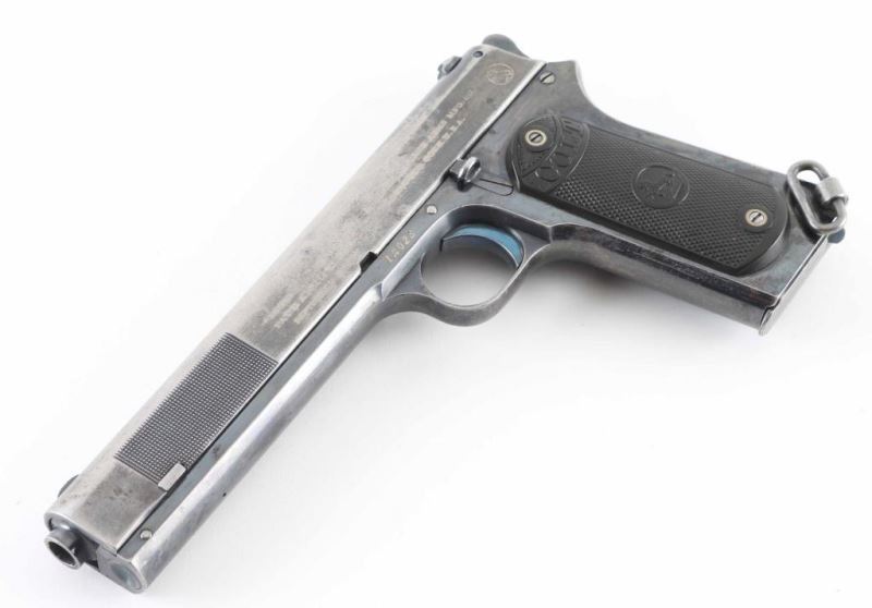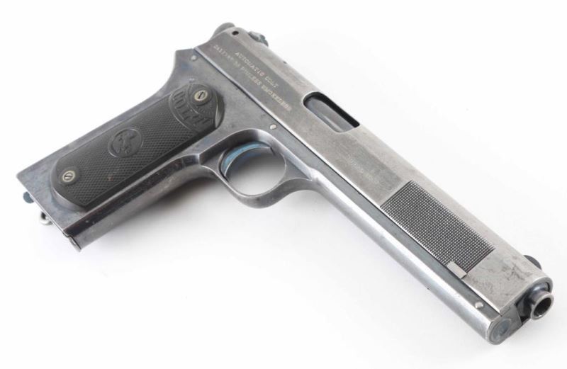 Very early production single action semi-automatic pistol chambered in .38 Automatic Colt Pistol, manufactured in Hartford, CT circa 1903. The Colt 1902 was the second pistol in the 1911 developmental lineage, it was an improvement over the 1900 Model with tool-less take-down, increased capacity, added slide catch, and lanyard ring. Features a polished blued finish, 6" barrel, round blade front sight, dovetailed rear sight with 'u' notch, forward knurling on the slide, smooth fire blued trigger, spur-less rounded hammer with case hardened finish, heel magazine release, 8 round magazine with patent date on the floorplate, steel frame with slide stop & lanyard ring on the left side and checkered hard rubber grips with "COLT" & Rampant Colt decor. Serial numbers on the frame and slide are matching. Pistol retains approximately 40% of its original high polish blued finish showing heavy finish loss on the slide and handling marks/wear on the frame. The action is sound, the bore shows good rifling with scattered pin prick pitting, markings are clear and the hard rubber grips are near fine. Condition is NRA Very Good. ***C&R Firearm***