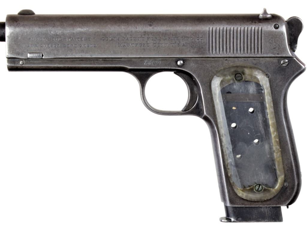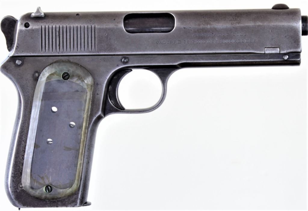 Colt 1903 .38 cal. SN 18620 semi automatic pistol early production with rounded hammer and "Browning Patent" on slide. Pistol void of all blued finish now gray turning to plum, metal generally smooth. Grips early handmade clear Texan or plex in the mannesemi automatic pistol early production with rounded hammer and "Browning Patent" on slide. Pistol void of all blued finish now gray turning to plum, metal generally smooth. Grips early handmade clear Texan or plex in the manner ofWorld War theatre fighting knives, frame marked Colt cal. 38. Action tight and functions perfectly, bore good with average rifling. Well used Colt that's seen a lot of use and action with no cosmetic condition but still remainsmechanically fine with a lot of character, made in 1903. De Accessioned from a state of AZ Museum. FFL / Modern. Est. 250-400