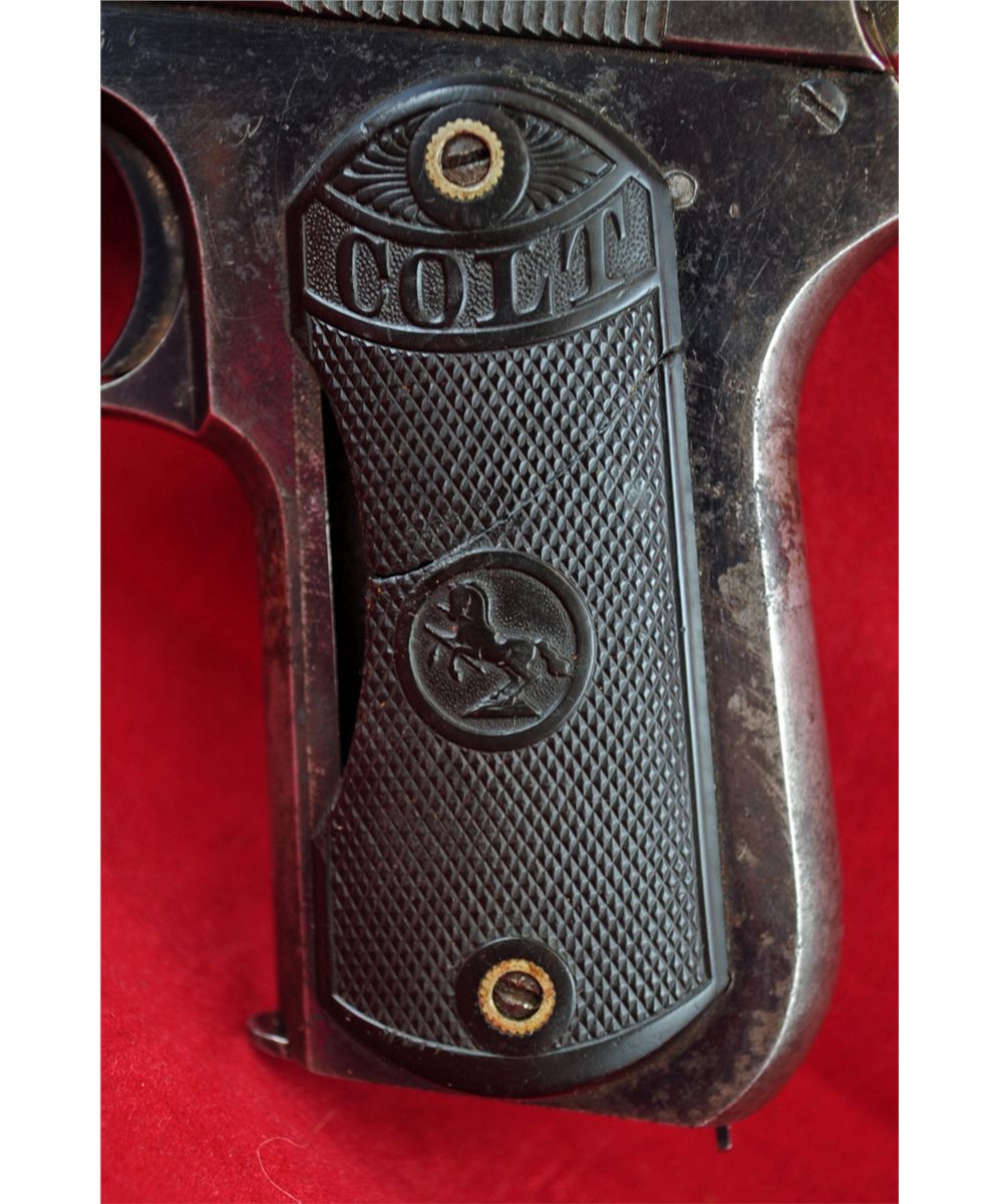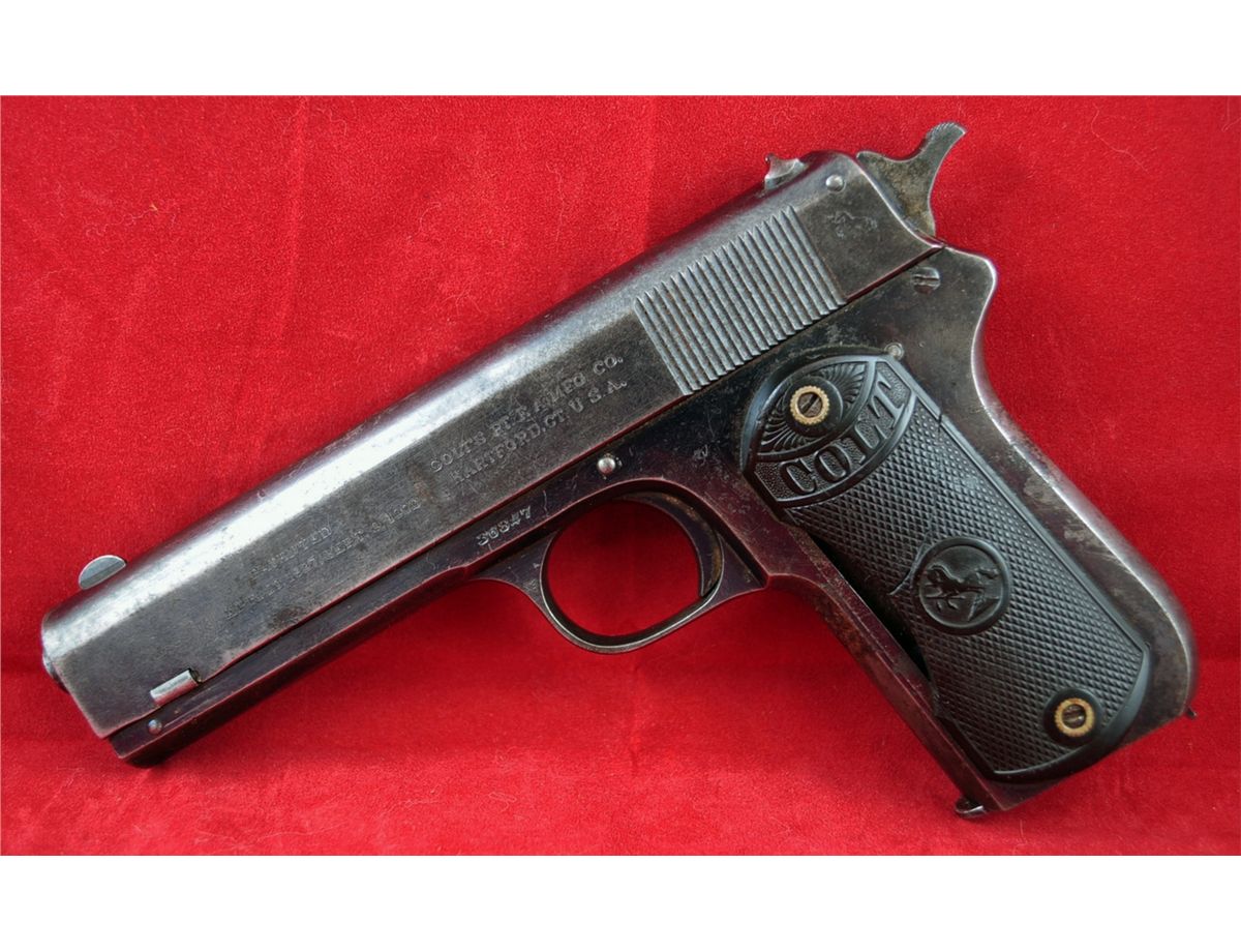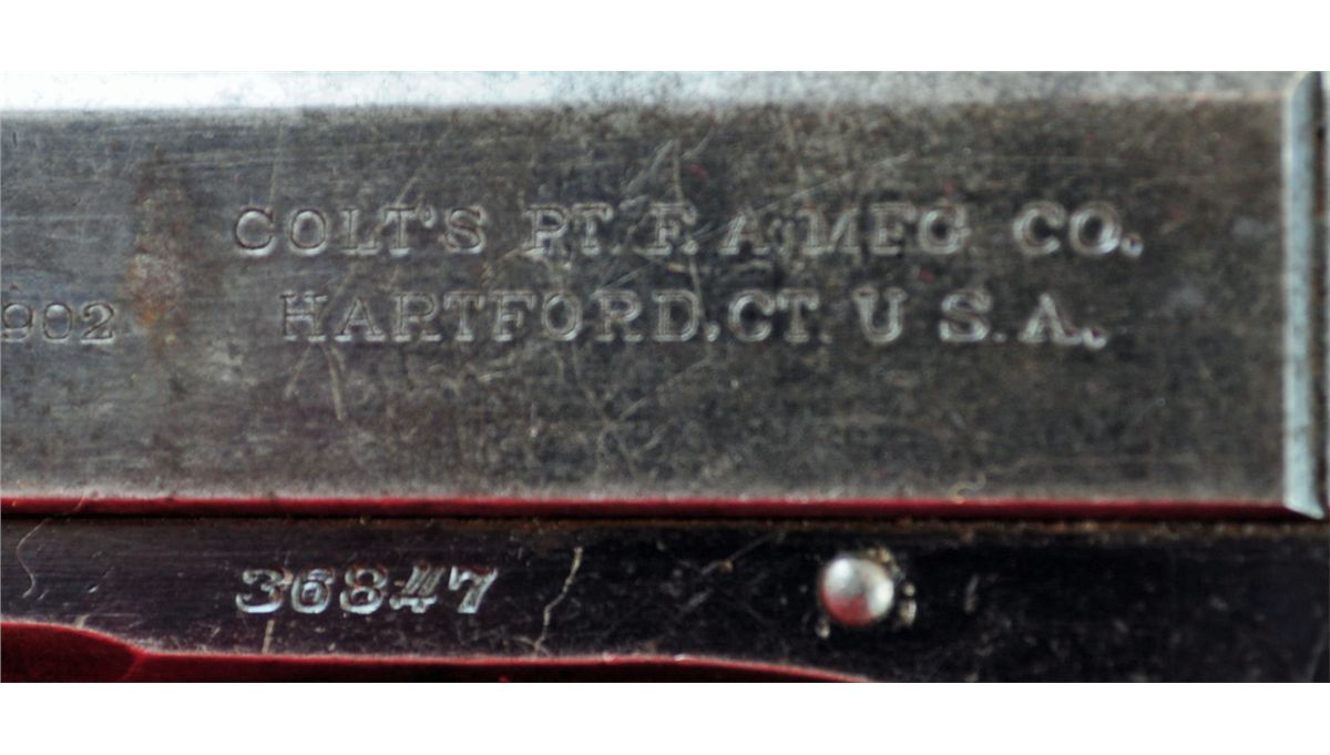 Colt 1903 Pocket .38 ACP/38 Rimless Smokeless, Cal. Semi Auto Pistol, 3" Inch Barrel, Ser.#36847, Damaged Grips, and marked U.S. brown leather shoulder holster. Pistol has damaged grips.See photos for more information. Gun is believed to be but not guaranteed to be in shooting order. Kennedys Auction Service has not attempted to test fire any gun in this auction and all guns are sold "IN AS IS CONDITION" and are not guaranteed to be operational.