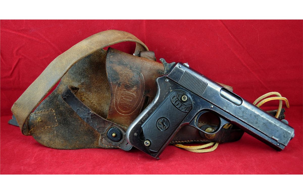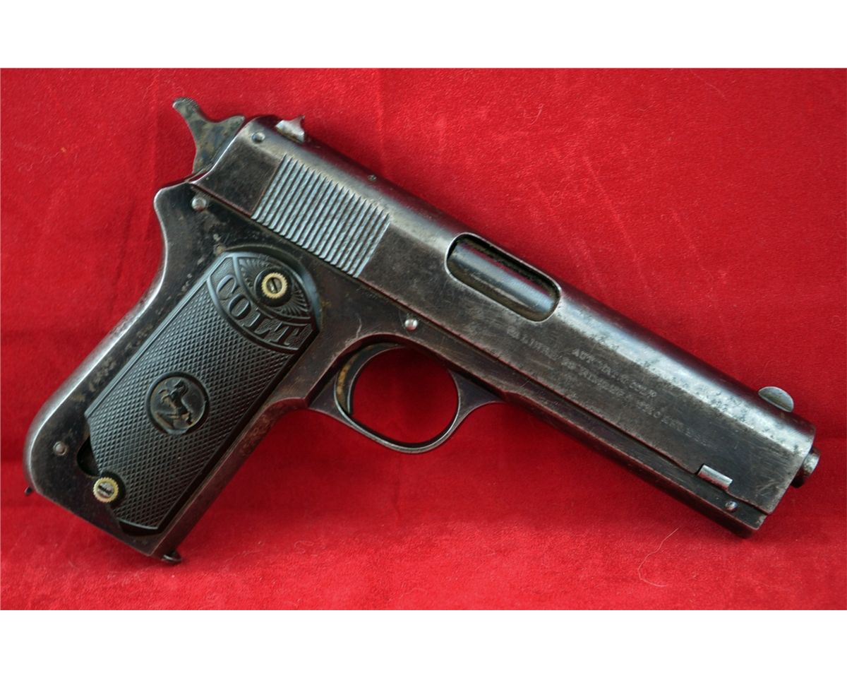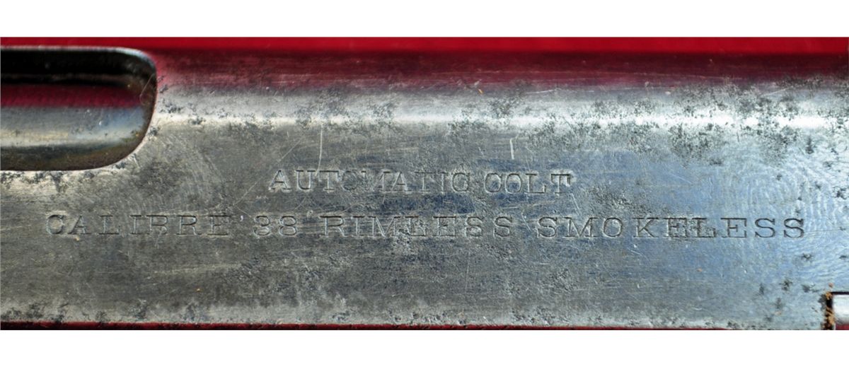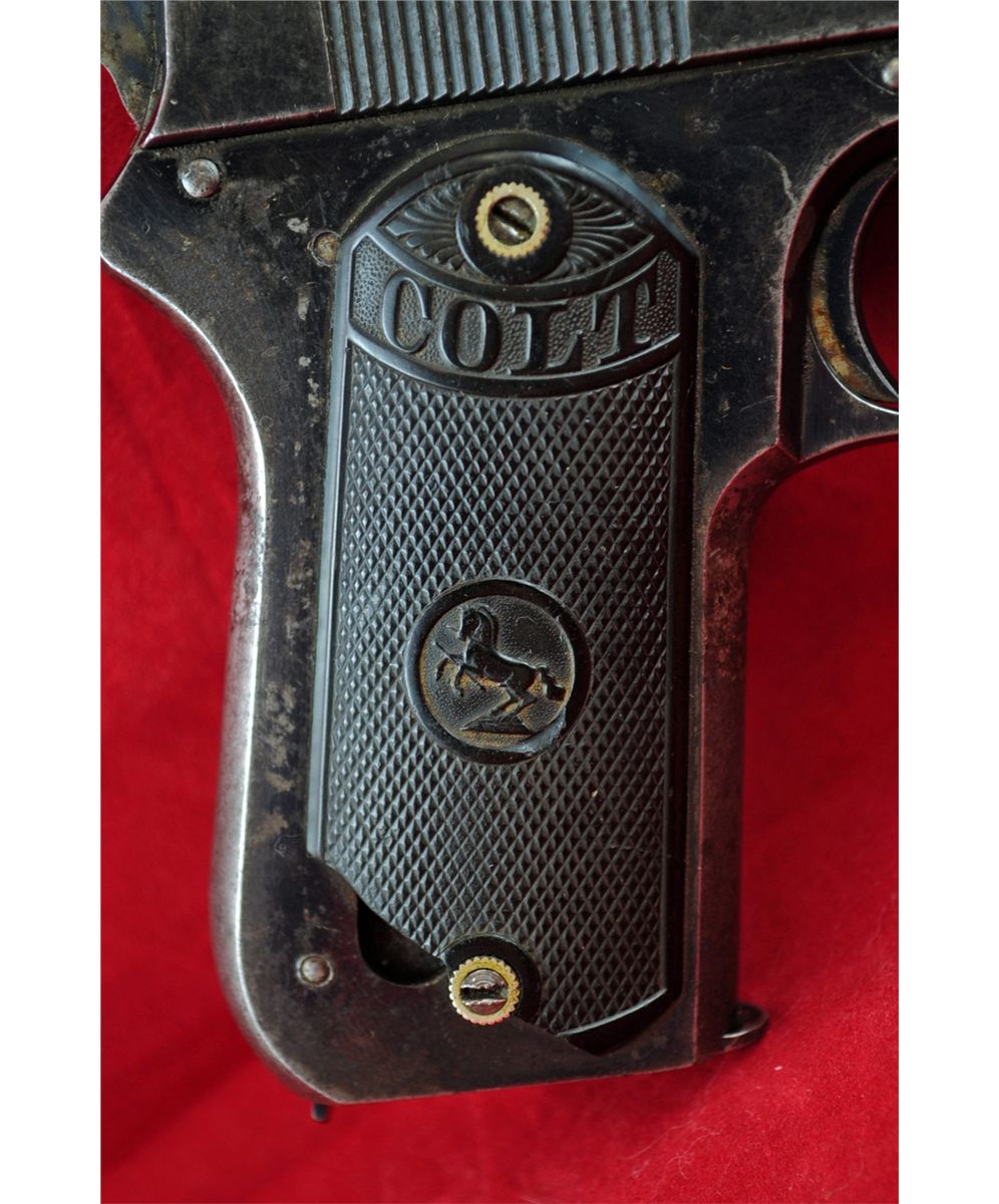 Colt 1903 Pocket .38 ACP/38 Rimless Smokeless, Cal. Semi Auto Pistol, 3" Inch Barrel, Ser.#36847, Damaged Grips, and marked U.S. brown leather shoulder holster. Pistol has damaged grips.See photos for more information. Gun is believed to be but not guaranteed to be in shooting order. Kennedys Auction Service has not attempted to test fire any gun in this auction and all guns are sold "IN AS IS CONDITION" and are not guaranteed to be operational.
