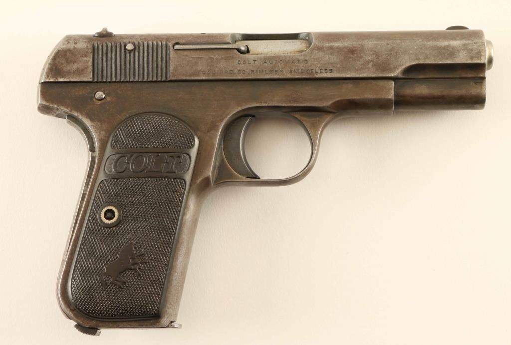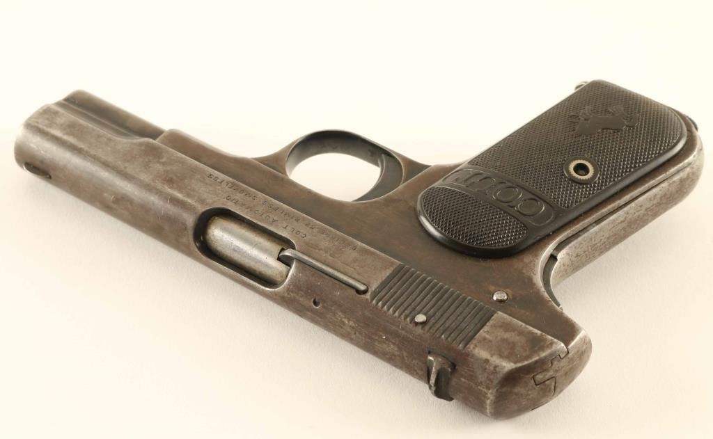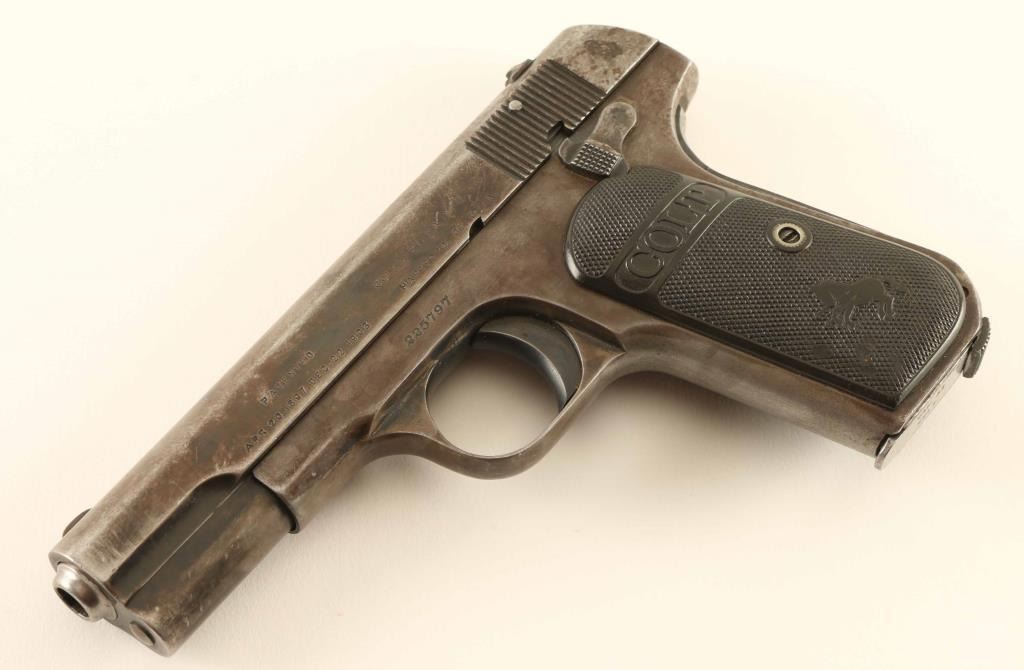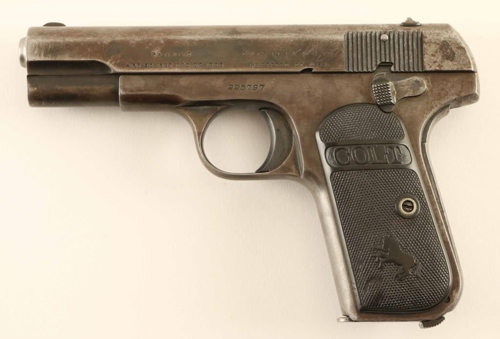 'Type III' Vintage concealed hammer single action semi-automatic pocket pistol chambered in .32 Auto, manufactured circa 1916. Features a blued finish, 3.75" barrel, blade front sight, dovetailed rear sight with 'u' notch, two-line address/patent marking on the left side of the slide, smooth trigger, thumb safety/slide stop on the left side of the frame, grip safety, heel magazine release, factory two-tone 8 round magazine, steel frame and two-piece checkered black hard rubber grips with "COLT" & Rampant Colt decor. Pistol exhibits less than 10% of it's original finish with the majority of the metal surfaces displaying a mottled brown patina. The pistol also displays some light scattered surface rust on the back side. Action is crisp, the bore shows light scattered pitting, the markings are very good, the magazine is good, and the hard rubber grips are good with wear. Condition is NRA Fair. ***C&R Firearm***