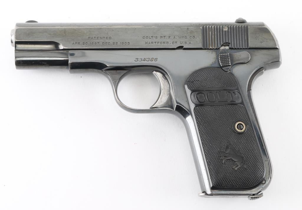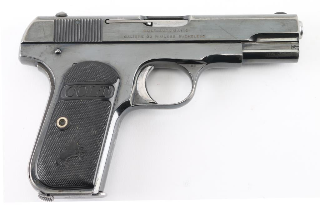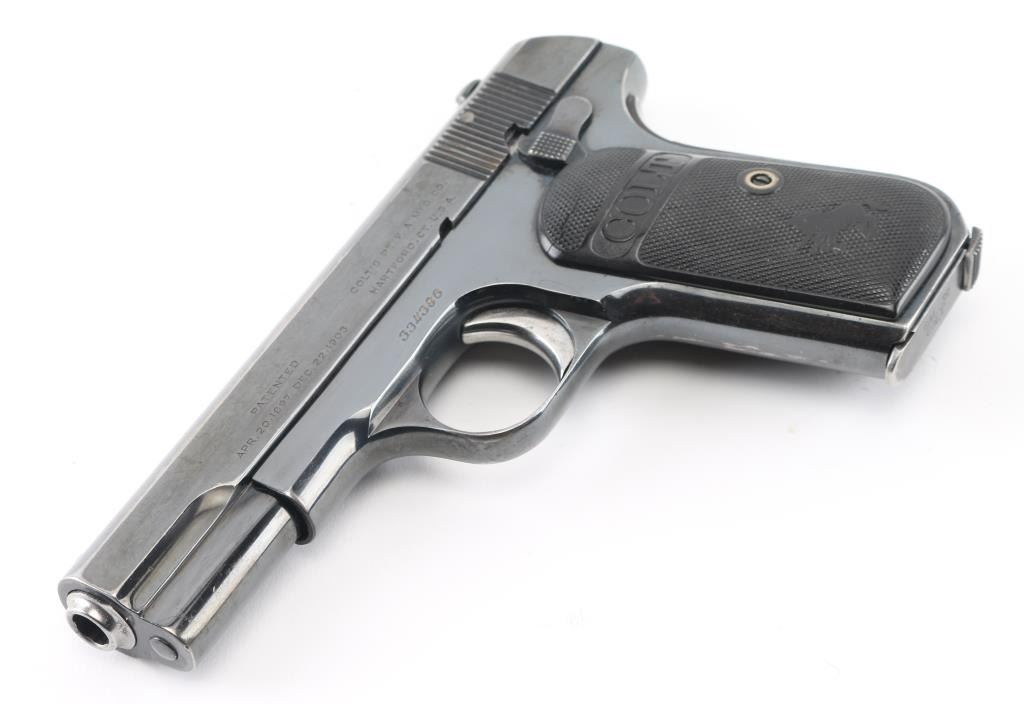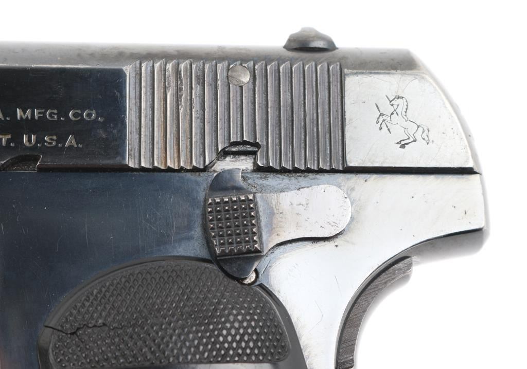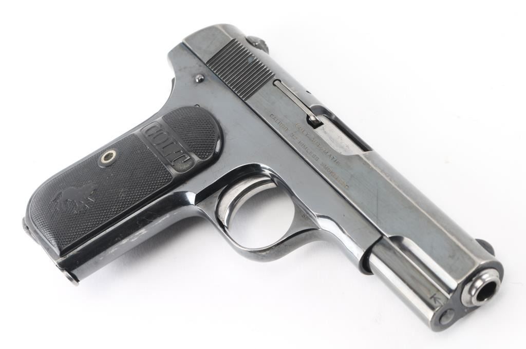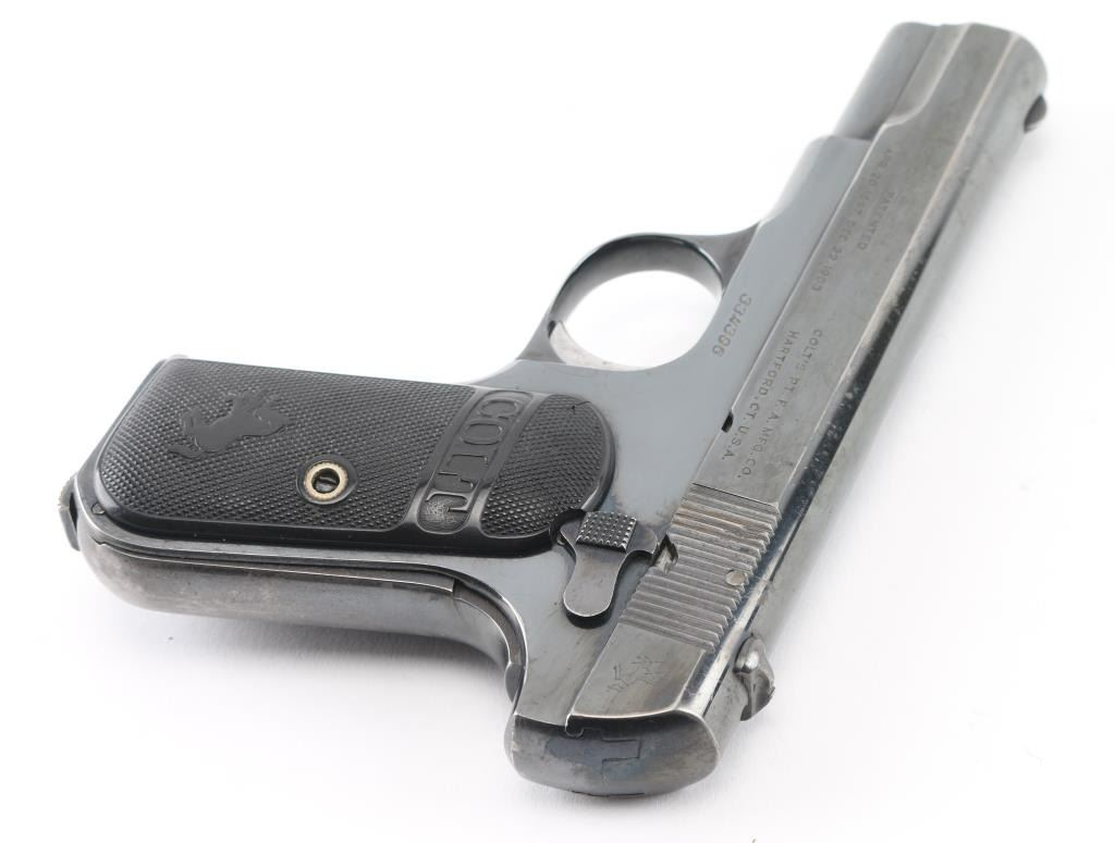 Vintage semiautomatic pistol manufactured circa 1920. Features re-blued finish, checkered black gutta percha grips with embossed Colt banners and Rampant Colt logos, 3.75" barrel, fixed sights, manual safety, grip safety, heel magazine release. Bore is very good condition, bright with some light frosting. Metal surfaces retain 90% re-finish, fading to gray on back strap, edge losses & scratches throughout. Markings are fairly sharp on left side of slide, showing erosion losses from heavy polishing elsewhere. Rampant Colt on slide is shallow, some line loss across center. Sharp edges show polishing losses. Grips are good to very good condition with smoothing of embossed features. Includes (1) very good condition blued steel COLT marked magazine. Condition is NRA Very Good (reblued) *** C&R Firearm ***