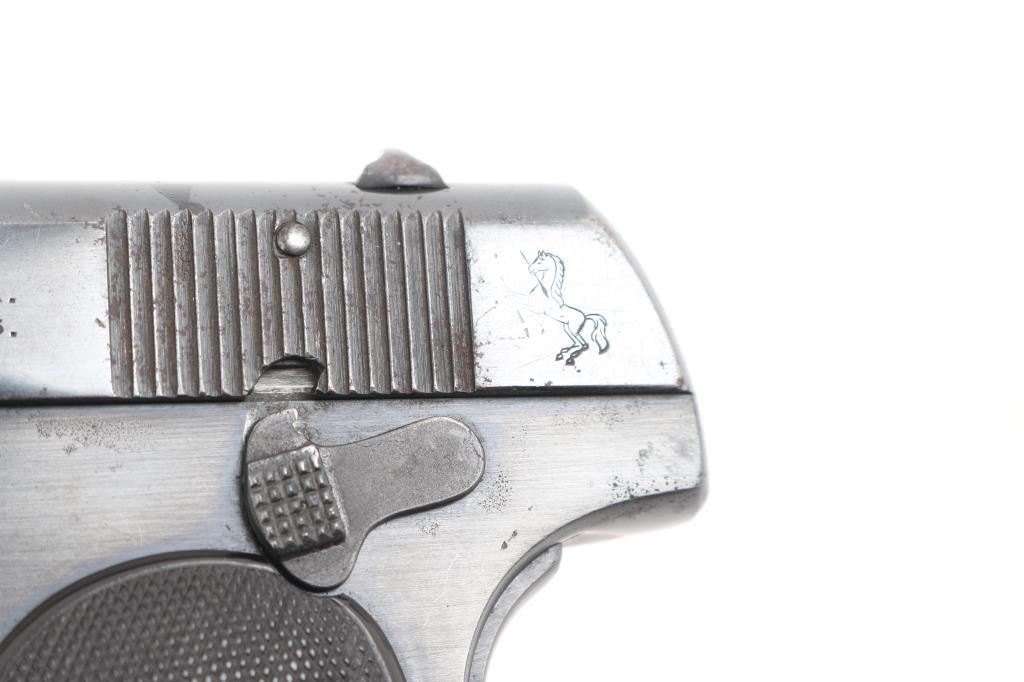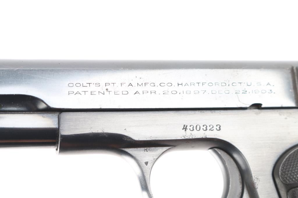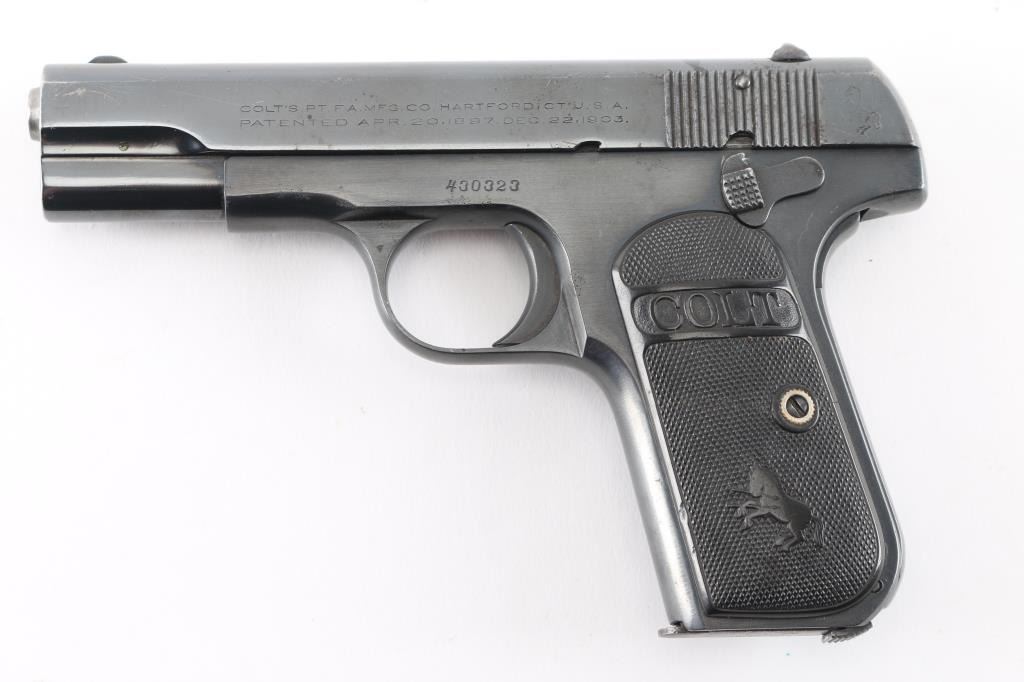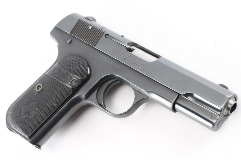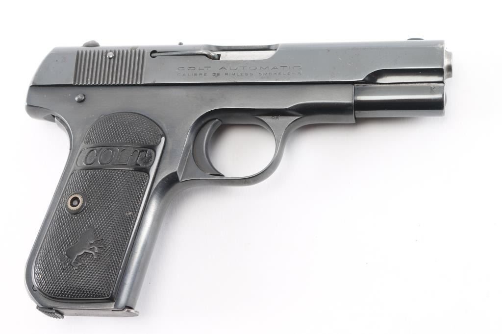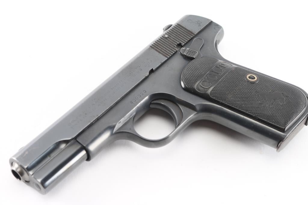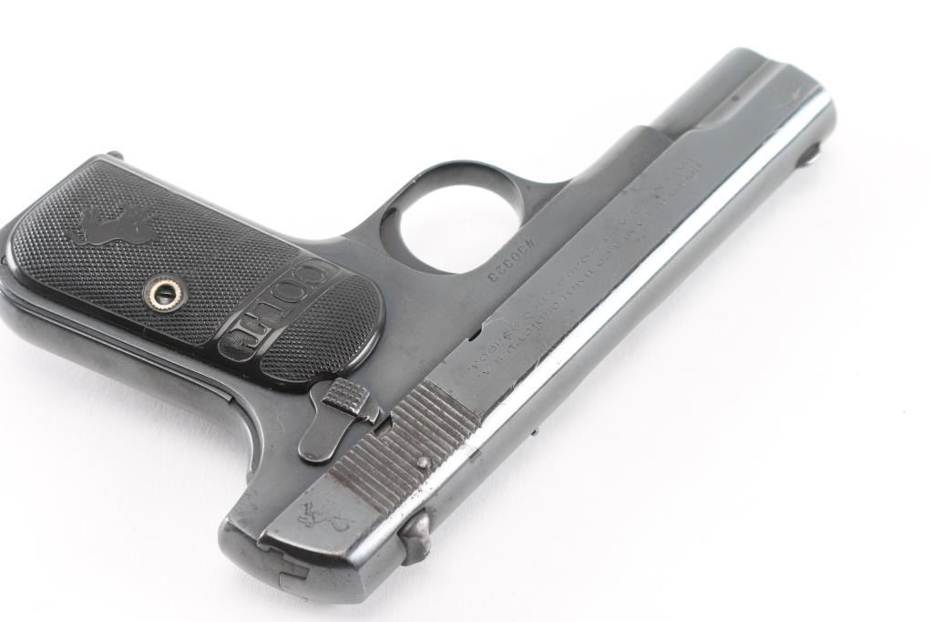 Vintage single action semi-automatic compact pistol chambered in .32 Auto, manufactured circa 1923. Features a reblued finish, 4" barrel, low-profile round blade front sight, dovetailed rear sight with u notch, two-line address/patent marking on the left side of the slide, smooth trigger, concealed hammer, thumb safety/slide catch on the left side of the frame, grip safety, heel magazine release, 8 round blued magazine, (Magazine has some scattered pitting) steel frame and two-piece hard rubber grips with molded "Colt" & Rampant Colt motifs. Bore is very good/bright. Pistol retains about 85% of old reblue finish, with some minor edge wear/scratches. There are a few very minor patches of light pin-prick pitting. Markings are mostly sharp, The Rampant Colt logo at rear of left side of slide is a little faint. Grips very good. Marked and correct Colt magazine.Condition is NRA Good/Refinished. C&R Firearm.