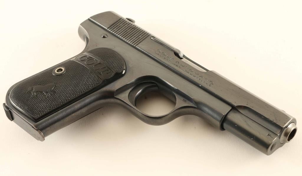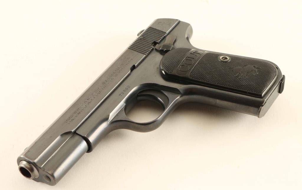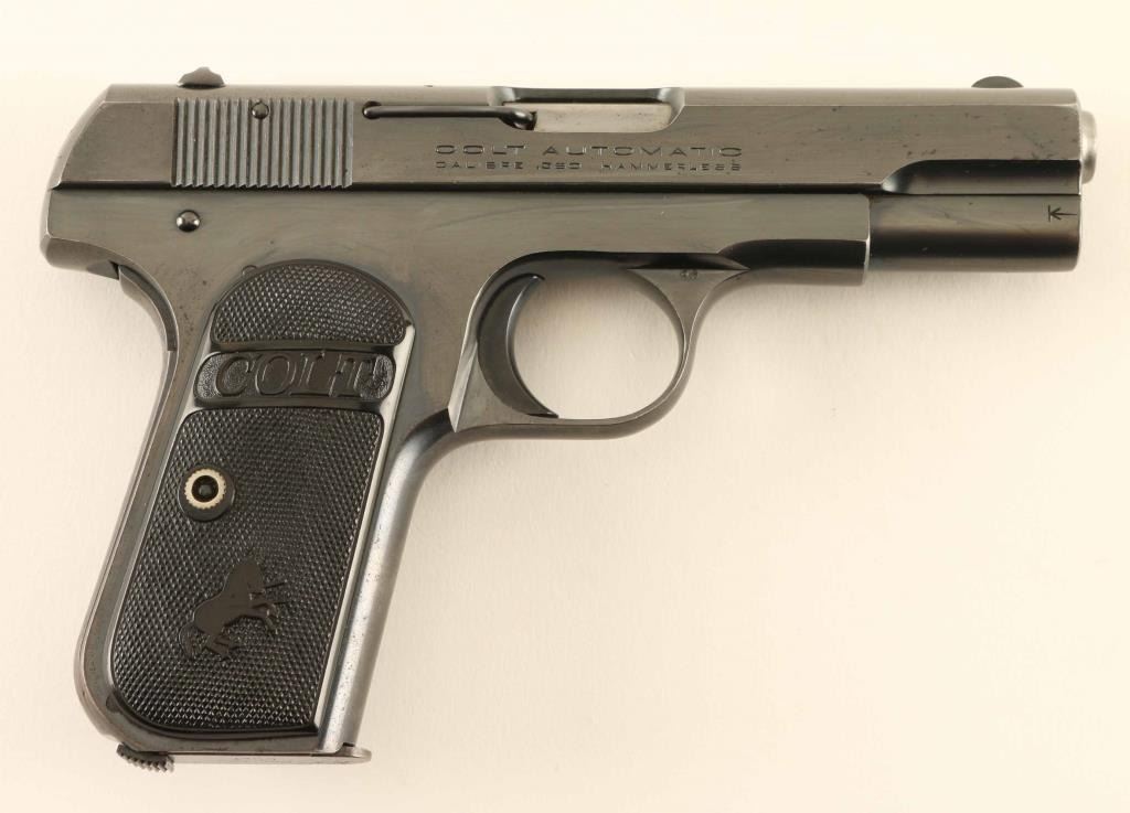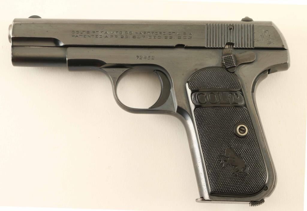 'Type III' Vintage concealed hammer single action semi-automatic pocket pistol chambered in .380 Auto, manufactured circa 1925. Features a blued finish, 3 3/4" barrel, low-profile round blade front sight, dovetailed rear sight with 'u' notch, two-line address/patent marking on the left side of the slide, smooth trigger, concealed hammer, thumb safety/slide catch on the left side of the frame, grip safety, heel magazine release, factory 8 round two-tone magazine, steel frame and two-piece checkered hard rubber grips with molded COLT & Rampant Colt decor. Serial numbers match on the frame and slide. Pistol exhibits approximately 90%+ of it's original blued finish showing edge wear, some scratches, and a small amount of light scattered surface rust. Action is smooth, the bore is excellent, markings are sharp and the hard rubber grips are very good. Condition is NRA Fine. ***C&R Firearm***