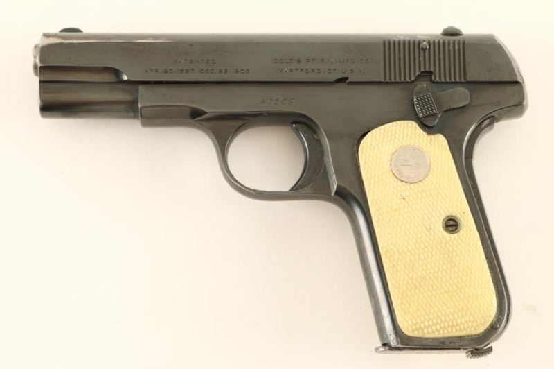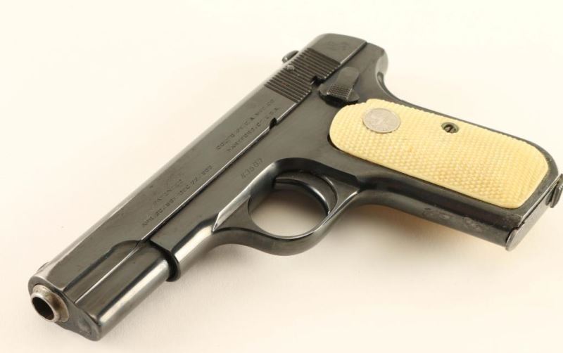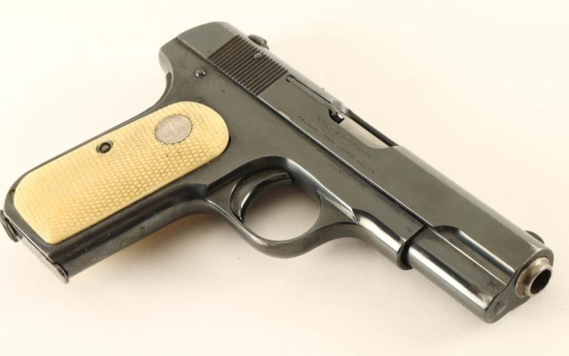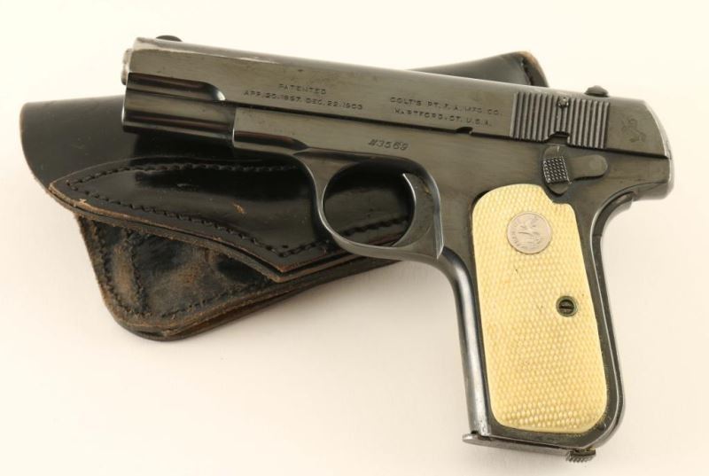 SN: 43569 'Type III' Vintage concealed hammer semi-automatic pocket pistol chambered in .380 Auto, circa 1921. Features a blued refinish, 3.75" barrel, low-profile round blade front sight, 'u' notched rear sight, two-line/two-block address & patent marking on the left side of the slide, smooth trigger, thumb safety, grip safety, heel magazine release, factory 7 round magazine, steel frame and two-piece checkered faux ivory grips with silver Franzite medallions. Includes an unmarked smooth black leather belt loop holster. Serial numbers match on the frame and slide. Pistol exhibits approximately 90% of it's blued refinish showing holster wear, handling marks and a small amount of light surface rust on the end of the slide near the muzzle. Action is smooth, bore is very good, markings are very good, and the plastic grips are very good. Condition is NRA very good as refinished. ***C&R Firearm***