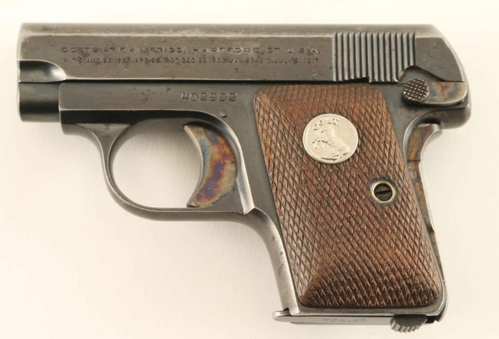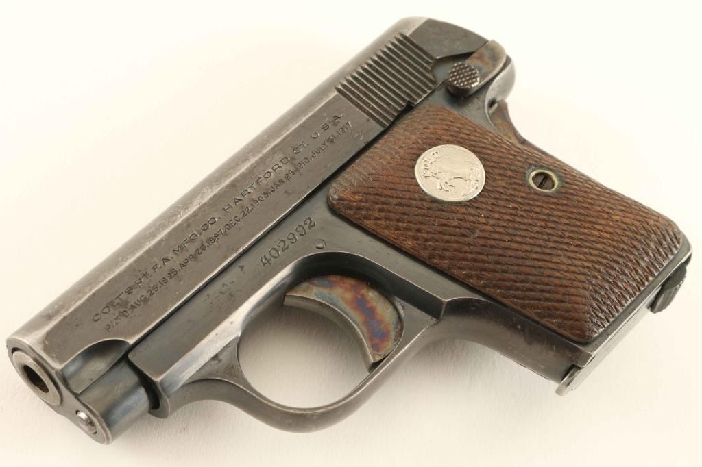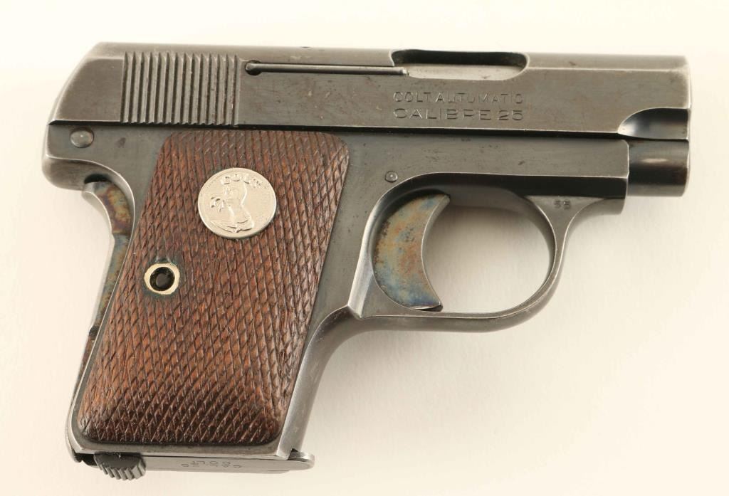 Vintage single action semi-automatic hammerless pocket pistol chambered in .25 Auto, manufactured circa 1936. Features a blued finish with case hardened small parts, 2" barrel, fixed sights, smooth trigger, grip safety, manual safety/slide stop on the left side of the frame, magazine disconnect safety, heel magazine release, factory 6 round magazine, steel frame and two-piece checkered walnut grips with Colt medallions. Pistol exhibits approximately 80% of it's original finish showing nice case colors, edge wear, handling marks and a small amount of scattered light surface rust. Action is strong, the bore is excellent and the wood grips are good with worn points. Condition is NRA Good. ***C&R Firearm***