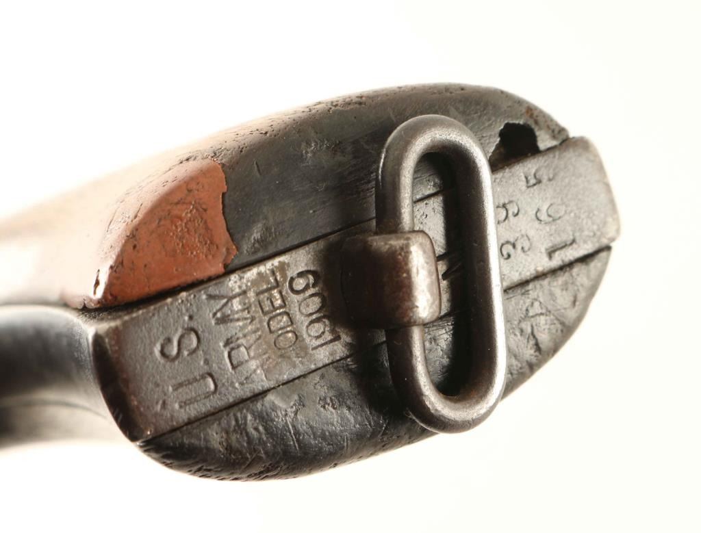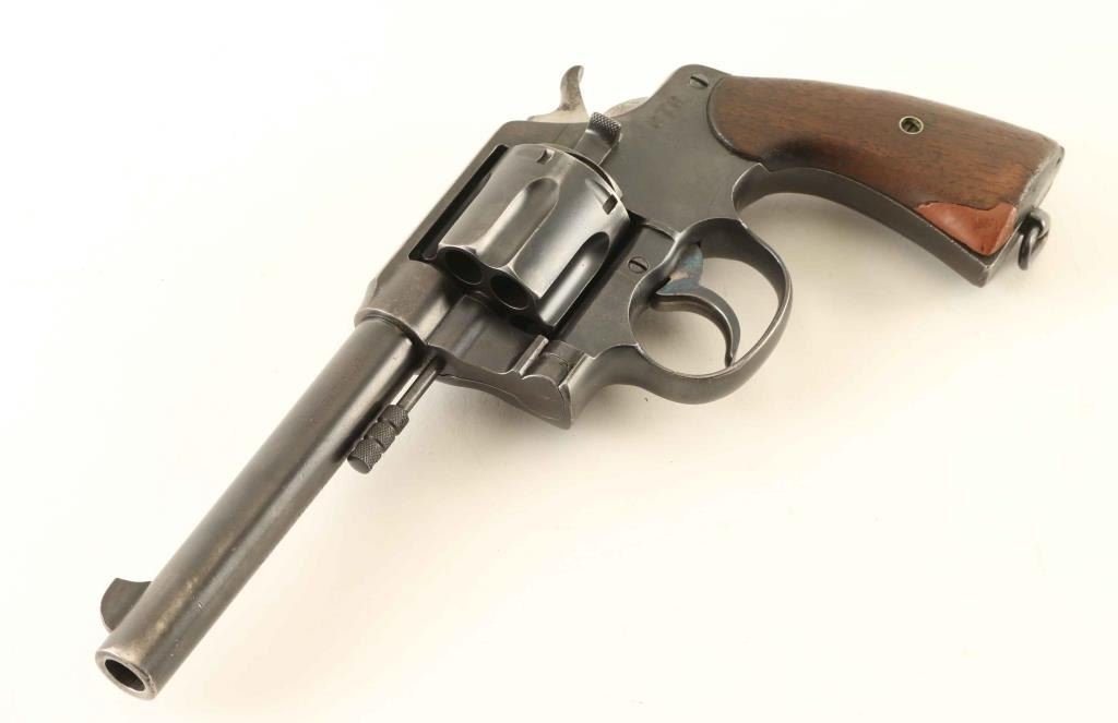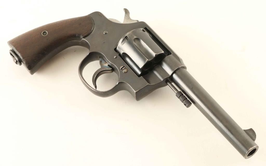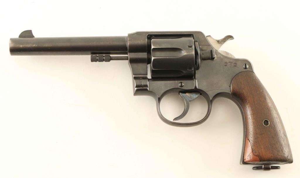 "UNITED STATES PROPERTY" marked large frame double action revolver manufactured circa 1911. The frame is stamped "CTC" which is attributed to Cleveland Trust Co, who issued these revolvers to their guards for their 42 different branch locations. Blued refinish, 5.5" bbl, blade front sight, "u" notched rear sight, fluted swing out cylinder, non-shrouded ejector rod, smooth trigger, knurled hammer spur, lanyard loop, and two-piece smooth walnut grips. Matching serial numbers with exception of the grips. Revolver retains approximately 70% of it's blued finish showing holster wear, thinning and some scattered dings & minor pitting. Action is crisp with solid lock-up, the bore is bright with good rifling & scattered light rust, markings are mostly present with three observed "R.A.C." inspector marks and the wood grips are fair showing repairs. Condition is NRA Good. ***C&R Firearm***