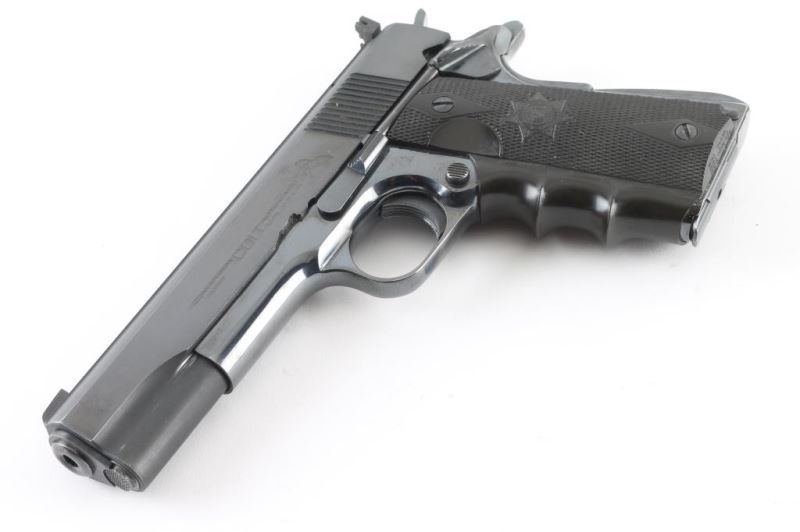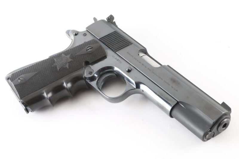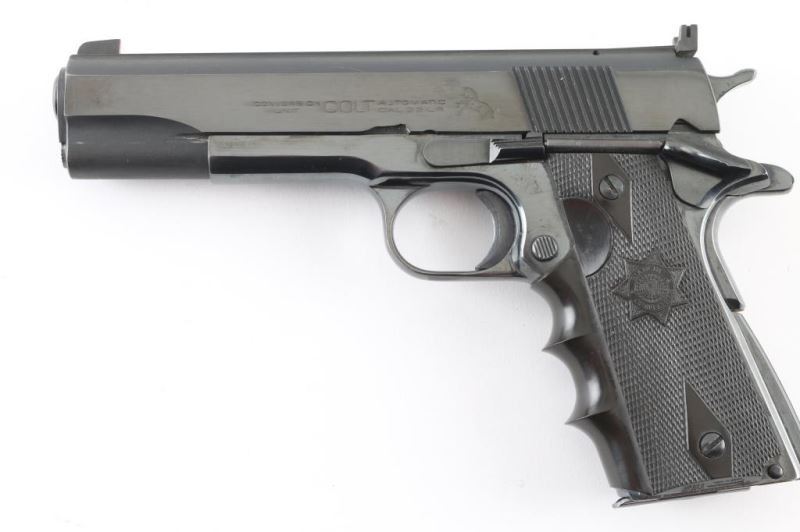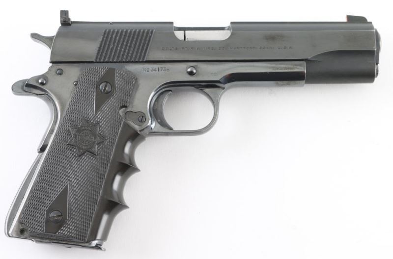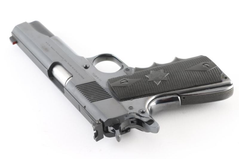 Semiautomatic rimfire pistol assembled from a USGI 1911 frame (manufactured circa 1918) and a Colt 22 long rifle conversion upper with floating chamber. Features a polished bright blued finish (matte finish on top of slide), 5" barrel, partridge type blade front sight, adjustable rear sight with square notch, serrated trigger, knurled hammer spur, thumb safety on the left side of the frame, grip safety, push button magazine release, steel frame, serrated arched mainspring housing, Bianchi black rubber finger groove wrap-around grip. Does not lock back on the supplied magazine when empty. Bore is excellent. Slide retains 95% finish, with handling marks, edge losses. Frame has been polished & reblued, some rounding of edges, retaining 95% dark blued refinish. Condition is NRA Excellent (as reworked) *** C&R Firearm ***