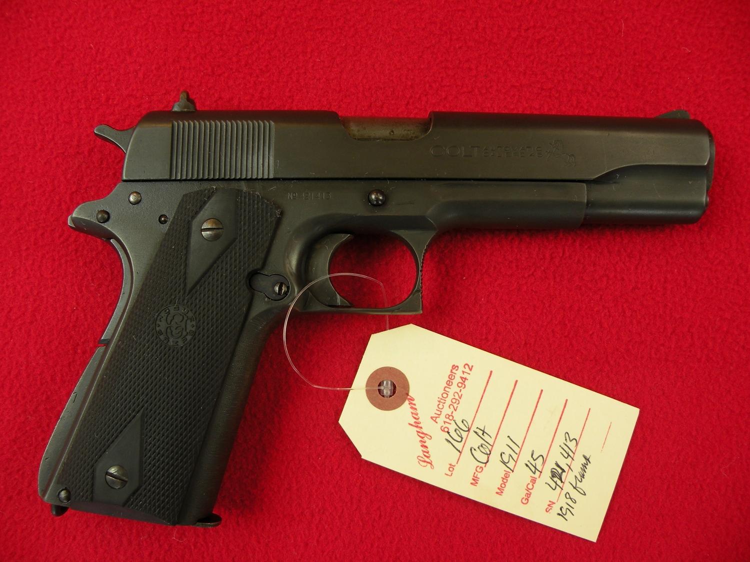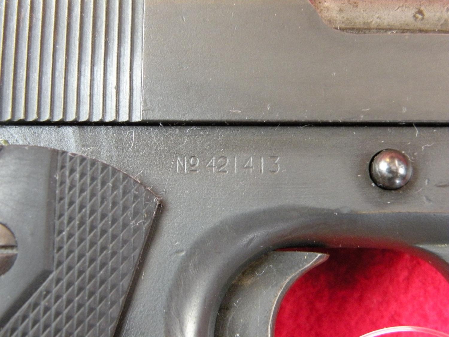 mfg 1918, reworked to correct black model finish, U.S. property, has been removed, newer slide, SN 421413