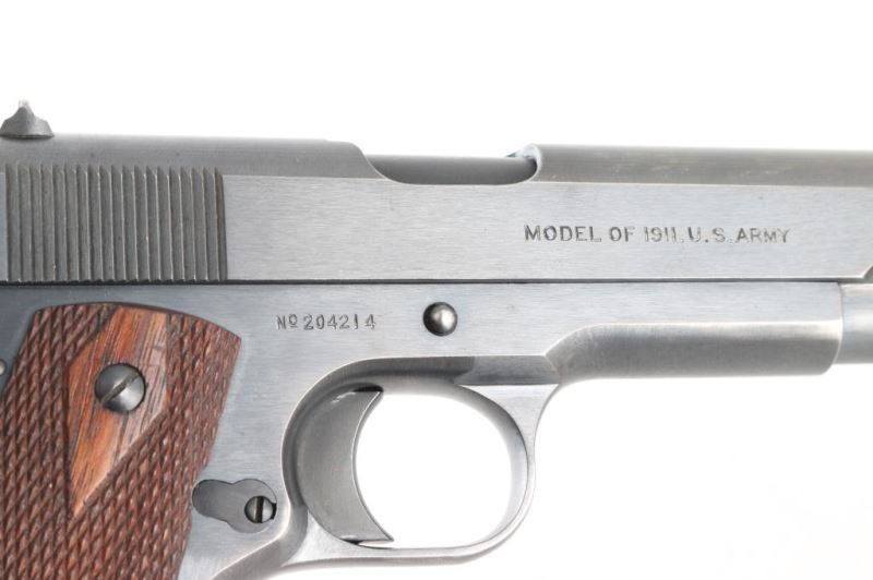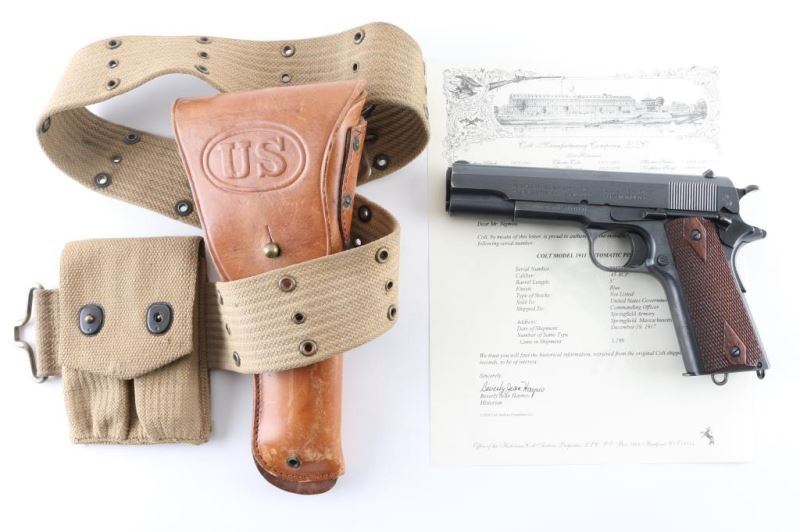 US Military semiautomatic pistol manufactured circa 1917. Features blued finish, double diamond checkered walnut grips, 5" barrel, fixed sights, single action trigger, grip safety, manual safety, flat smooth mainspring housing with lanyard ring. Bore is very good condition. Retains 85% deep dark blued finish, with edge losses, some discoloration on grip straps & top of slide, scratches, a few tiny pits. Grips are very good or better condition, dark colored walnut, with some loss to checkering points. Markings include: "MODEL OF 1911 US ARMY" on right side of slide, two line Colt patent & address lines on left side, "UNITED STATES PROPERTY" on left side of frame. Markings are generally crisp. "GHS" monogram is even and readable. "5" stamp on bottom of blued barrel, forward of feet. "0" inside slide under firing pin channel. "H" on slide rear above firing pin. Rampant Colt at left rear of slide. Includes (1) very good condition two tone lanyard magazine. Includes Colt letter stating delivery in Dec 1917 to the Commanding Officer of Springfield Armory; also a very good condition correct period USGI web belt & holster rig (pouch marked "RUSSELL SEPT 1918", tan holster marked "WARREN LEATHER 1917"). Condition is NRA Very Good++ *** C&R Firearm *** [From the Jim Sigmon Collection]