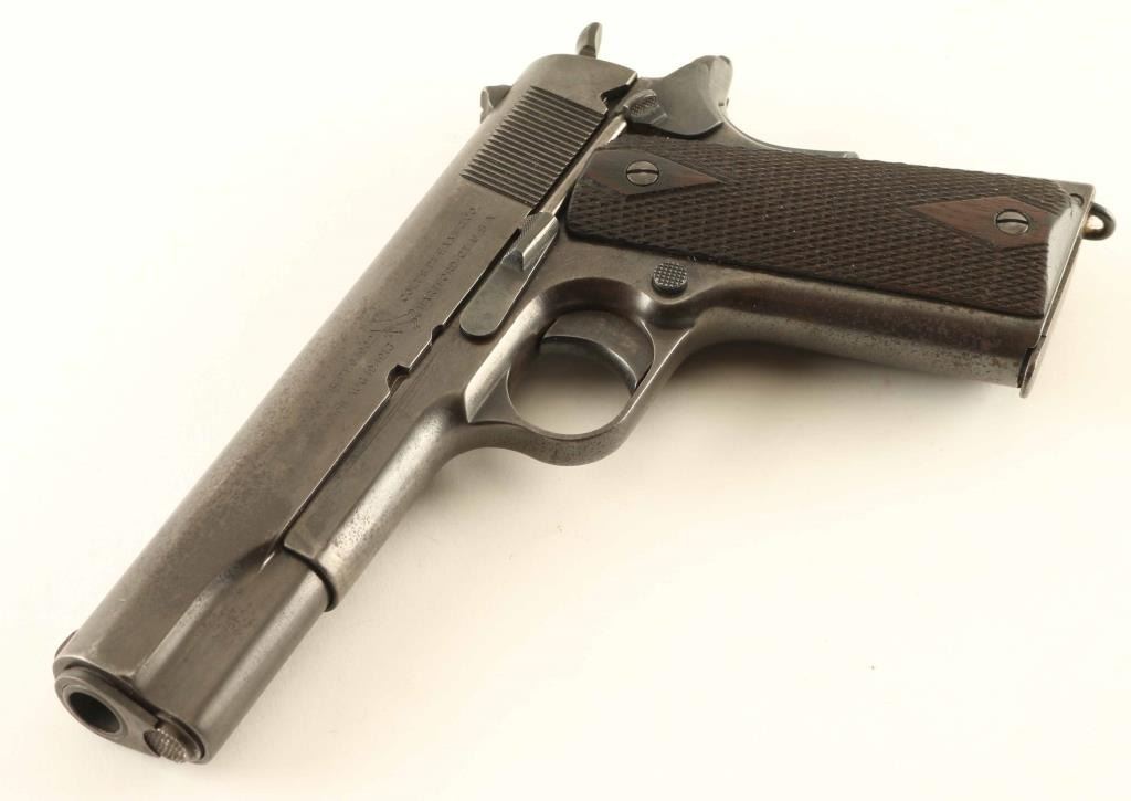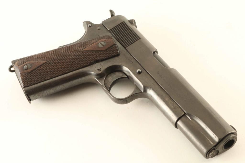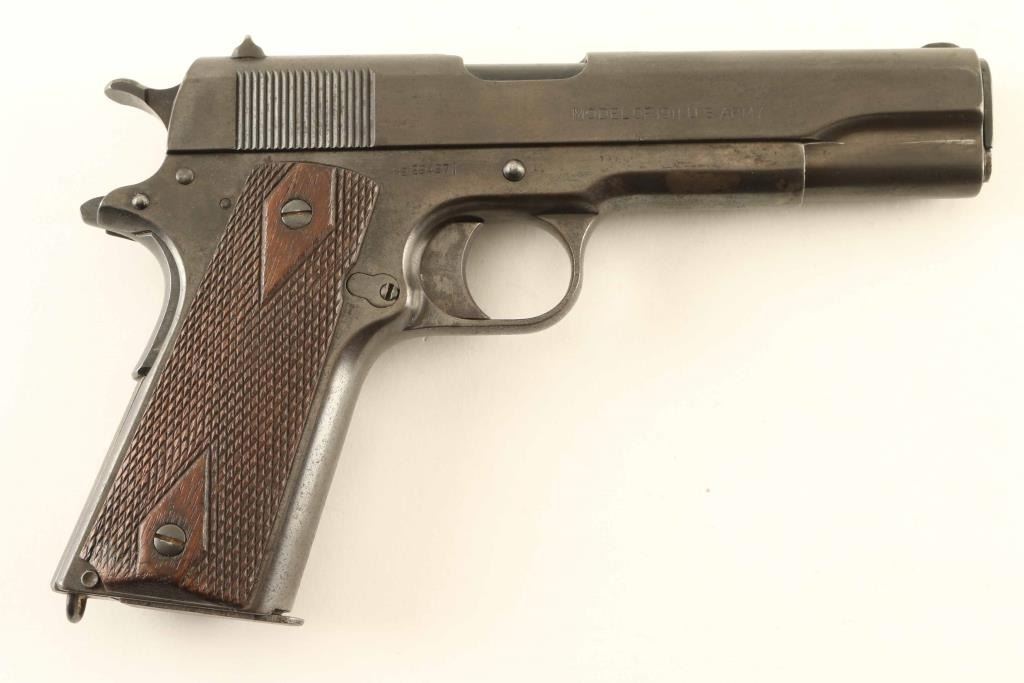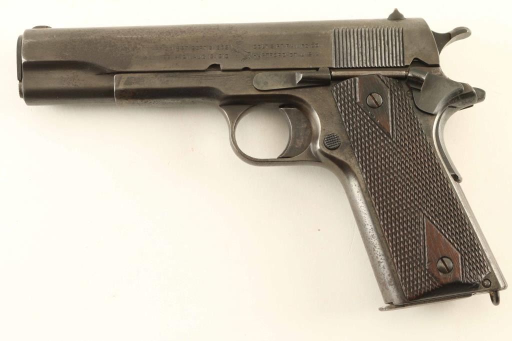 US Military semiautomatic pistol features blued finish, double diamond checkered walnut grips, 5" barrel, fixed sights, single action trigger, grip safety, manual safety, smooth flat mainspring housing with lanyard ring. Bore is very good. Appears reblued. Retains 90% re-finish with some bare metal on sharp edges, mottled color on dust cover. Visible small pits under bluing in many areas, notably left side of slide behind muzzle. Grips are good condition, dark & oil stained, some smoothing of checkering points. Markings include: "MODEL OF 1911 US ARMY" on right side of slide, two line Colt patent & address lines on left side. Left most patent date markings are dished and shallow. Several deep scratches to left side of frame forward of slide stop. Appears to have proper 1911 type parts (slide stop, hammer, safety, grip safety, mainspring housing), with 1911A1 style longer trigger. Includes (1) fair condition two-tone magazine, unmarked, with pitting on base. Condition is NRA Good++ (refinished) *** C&R Firearm ***