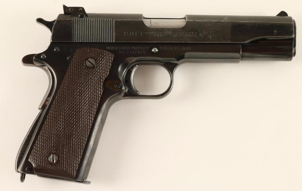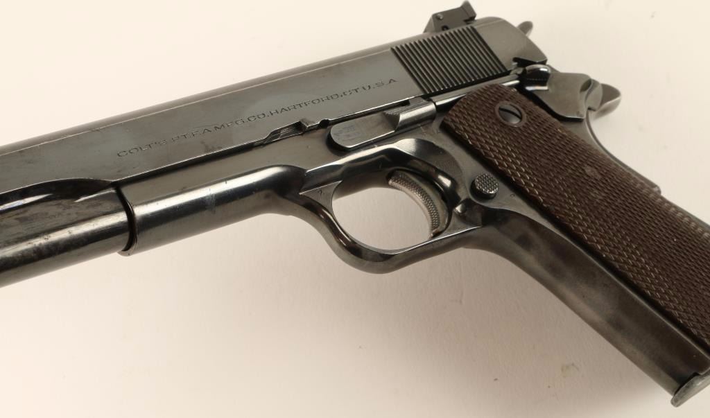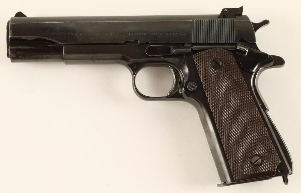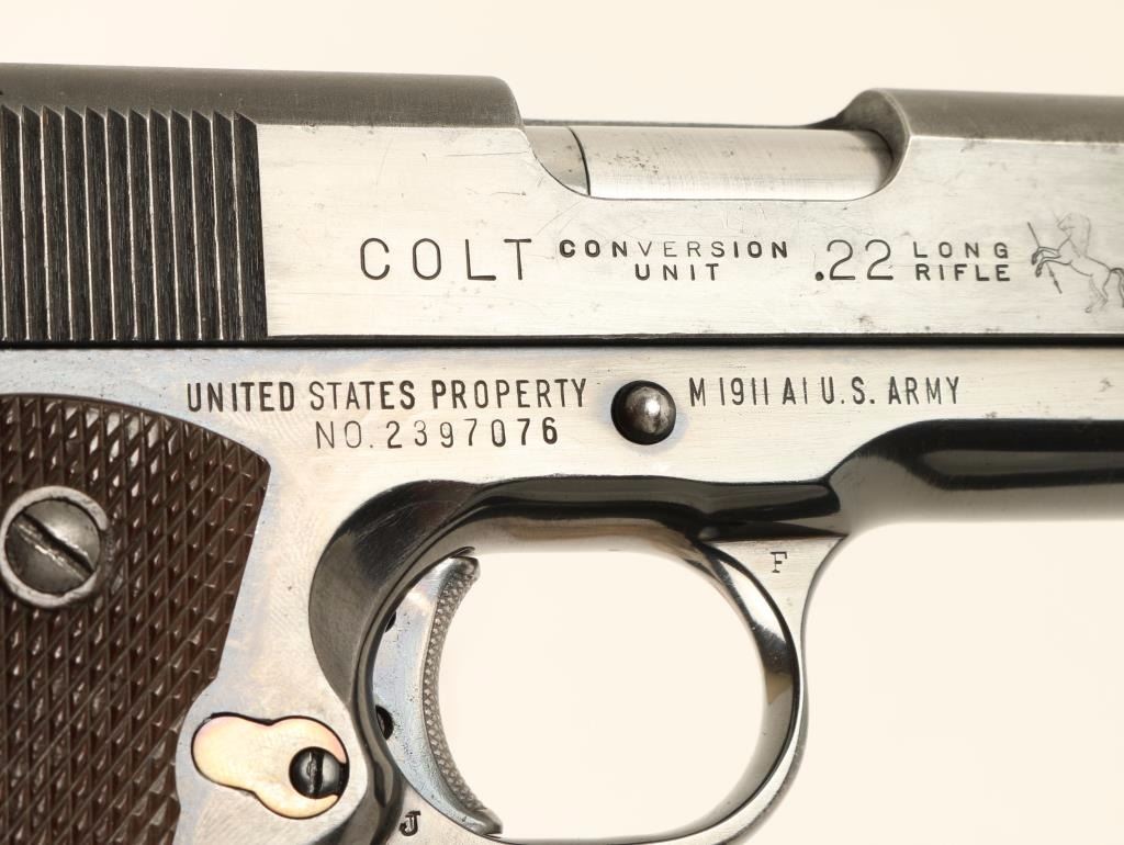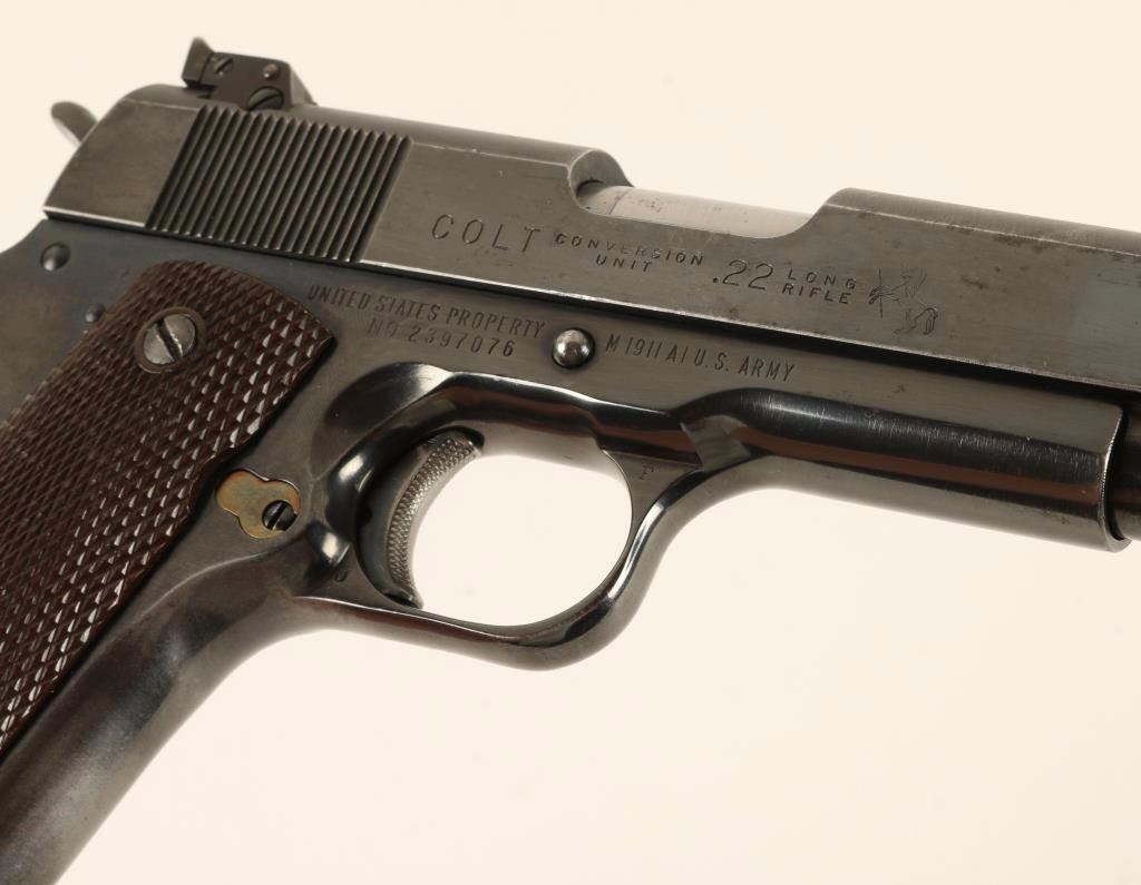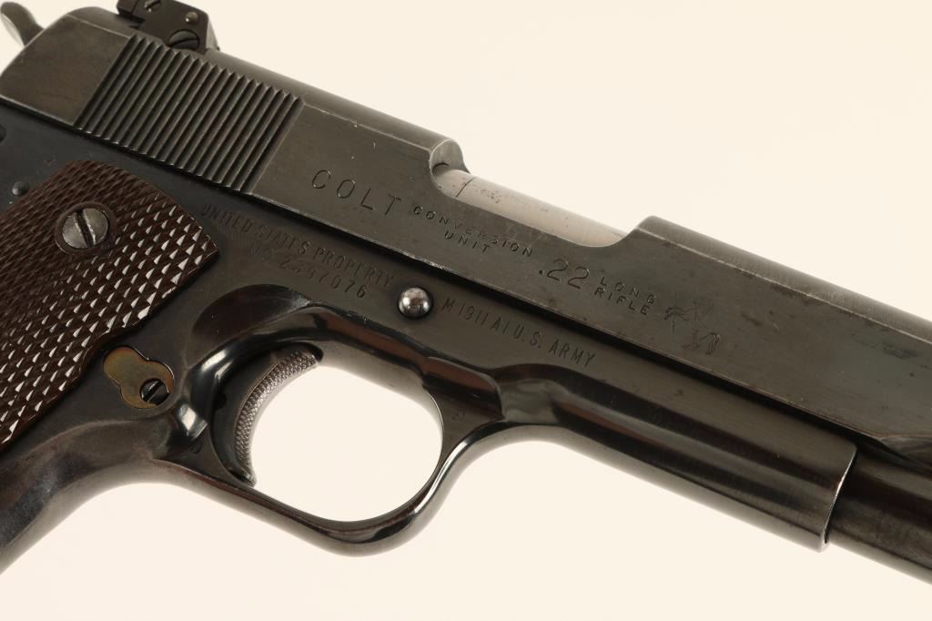 U.S. Military contracted semi automatic pistol with .22 caliber conversion unit installed. Frame circa 1945. Features a blued finish, heavy 4 3/4" stainless steel barrel, serrated slide, fixed front sight, adjustable rear sight, checkered trigger & hammer spur, thumb safety switch, beavertail grip safety, push button magazine release, 10 round magazine, serrated main spring housing with lanyard ring, and two piece checkered brown plastic grips. Slide retains 70% dulling blue finish with storage wear and refinished frame retains 85% bright bluing. Action is strong, bore is pristine, and plastic grips are very good with some wear. Condition is good+++ ***C&R Firearm*** ***Modern Firearm***