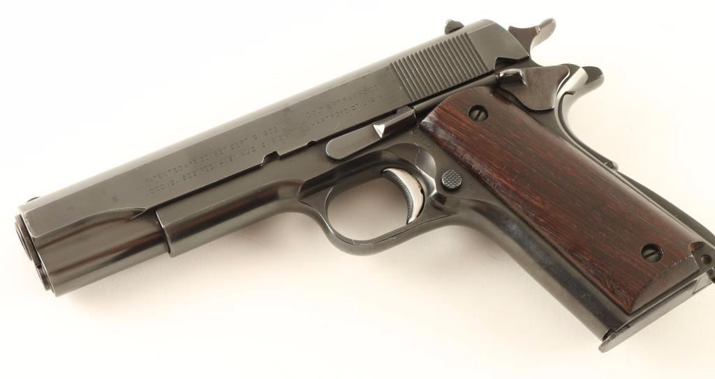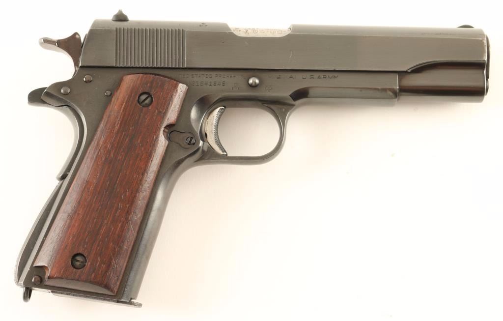 U.S. Military contracted semi-automatic service pistol chambered in .45 Automatic Colt Pistol, circa 1944. This pistol was apart of the Lend-Lease Act and bares British proofs. It also features, a fine blued refinish , 5" jeweled barrel, serrated front sight, wide square notched rear sight, stamped trigger, wide spur hammer spur, thumb safety, beavertail grip safety, unmarked 7 round two-tone magazine, checkered slide stop, serrated mainspring housing, and two piece smooth wood grips. US markings on frame - "United States Property/No1641646", "M1911A1 U.S. Army", "G.H.D.", 'Crossed Cannons', "P". Pistol retains approximately 94% of it's refinish with light scattered oxidation on the slide and a small amount of very light surface rust emerging on the right side of the frame near the lanyard loop. Action is strong, bore is excellent, and wood grips are fine. Condition is excellent. ***C&R Firearm*** ***Modern Firearm***