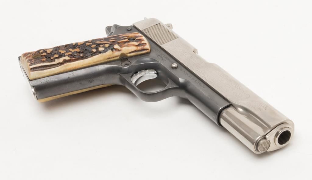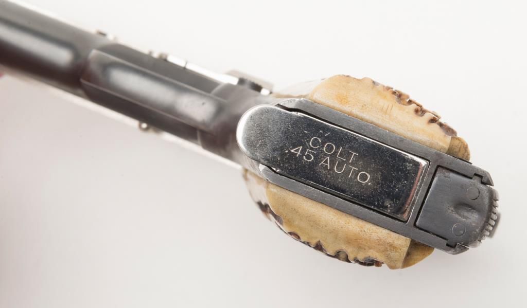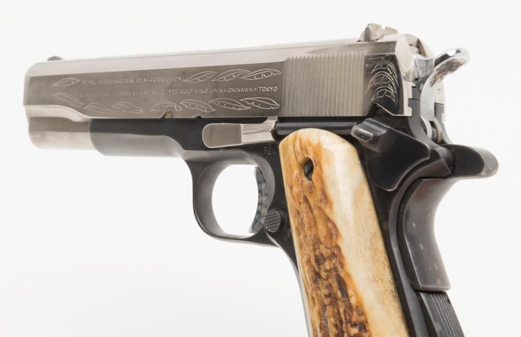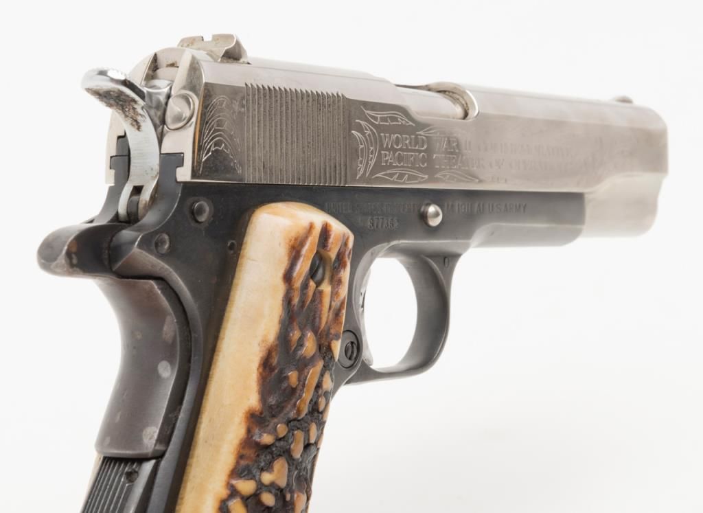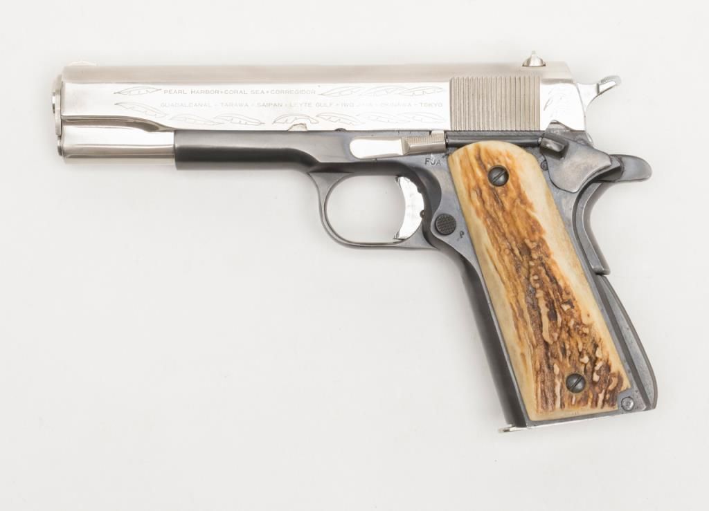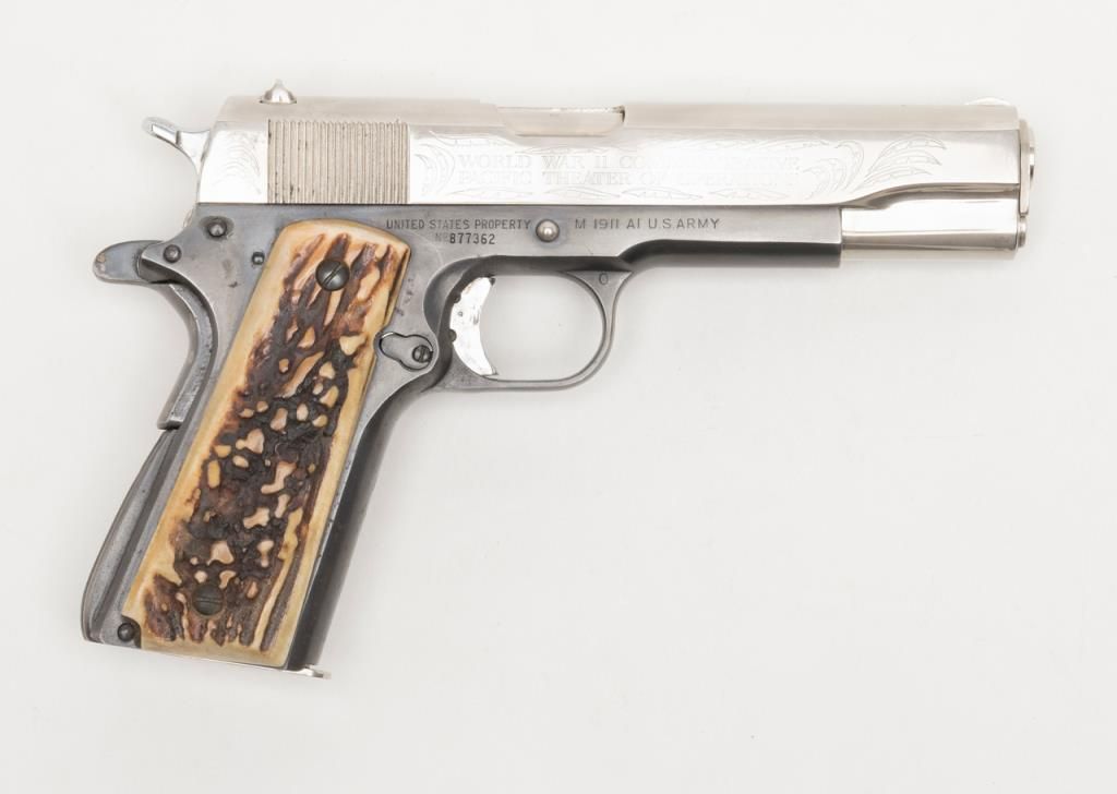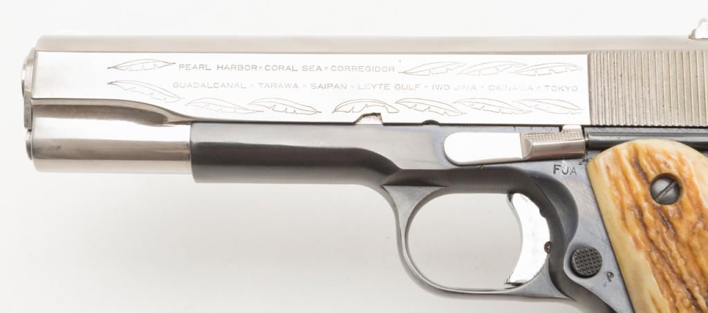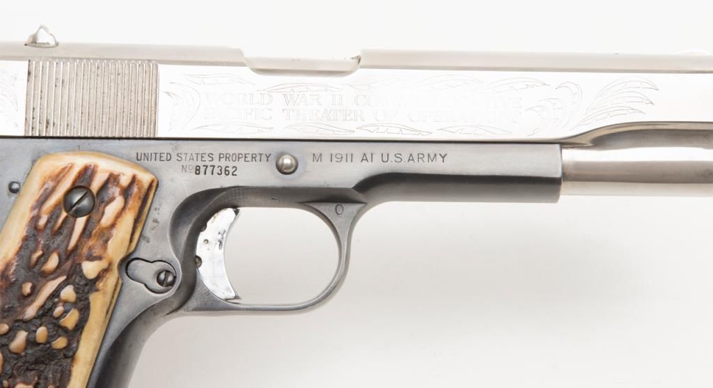 Colt 1911 A1 WWII Commemorative Pacific Theatre of Operations, #877362, .45 ACP., 5" barrel, 2 tone finish with nickel slide, slide release, barrel, jeweled trigger, hammer, and magazine, and blued frame and remaining small parts, stag grips.Pistol is in very good condition overall, nickel is starting to tone, and there are a few spots of freckling and minor corrosion on the frame, and some discoloration to the grip safety, possibly form some chemical. Bore is excellent, action istight. Pistol will improve with a good cleaning. ONE MAGAZINE. (C&R) Est.$600-1200.