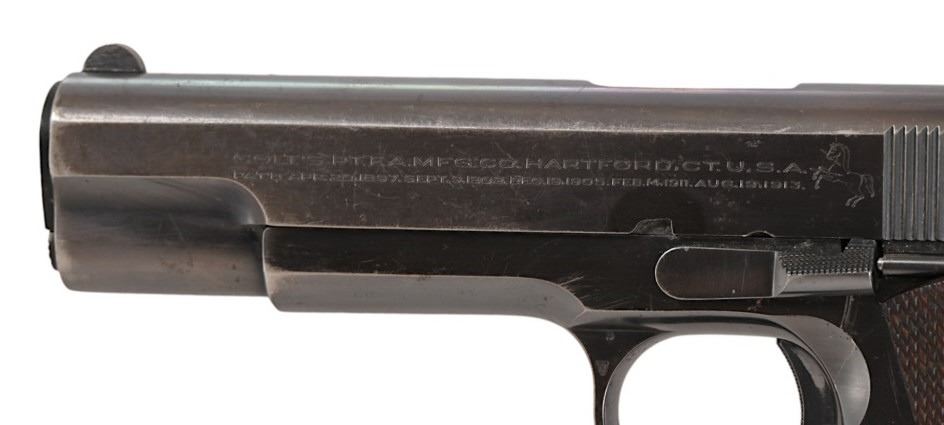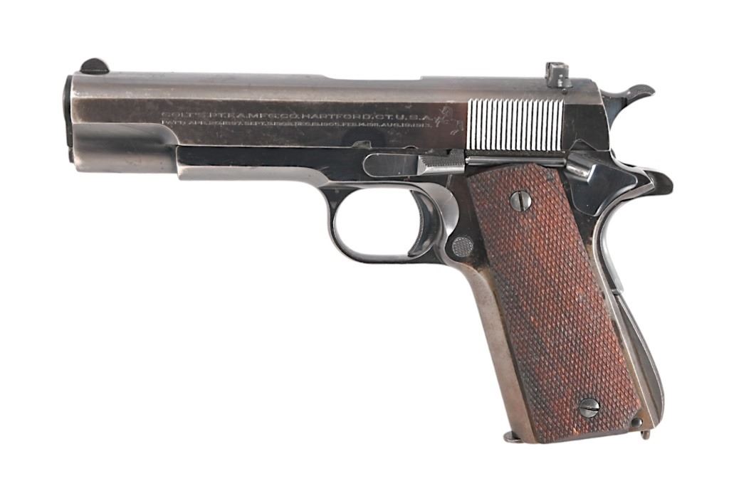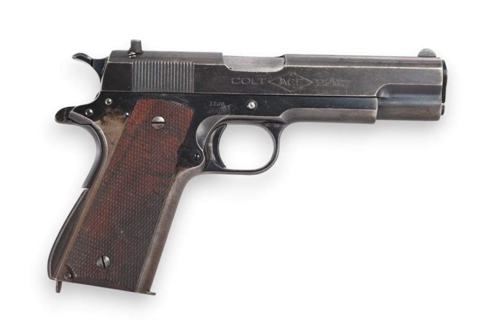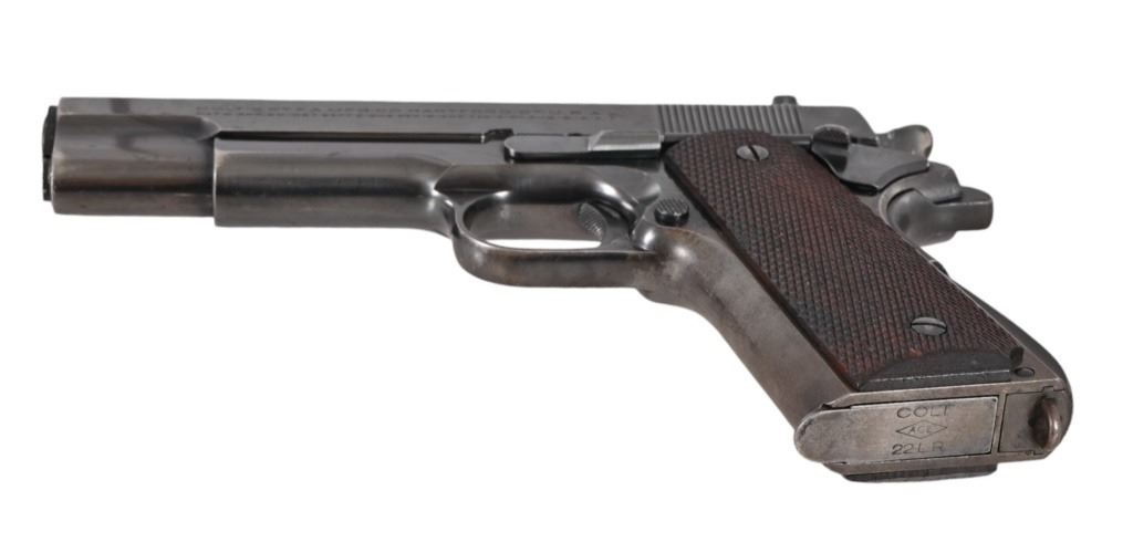 SN 1100. Very early pre-war Ace model. 5" barrel, good bore. Retains a high degree of finish with some freckling and edge loss. Wood grips and original Colt two tone magazine. Modern.