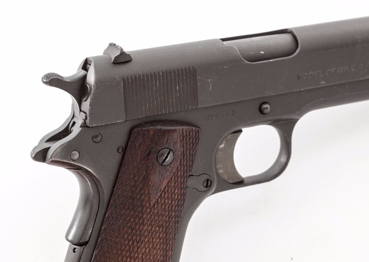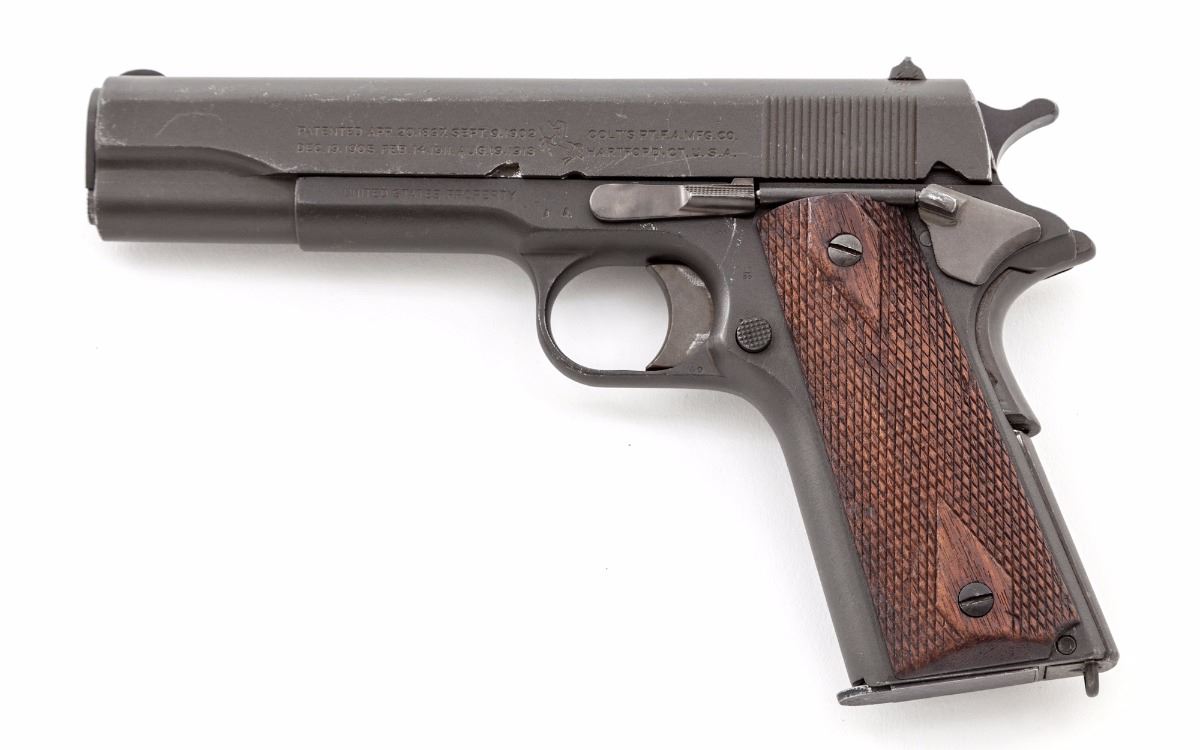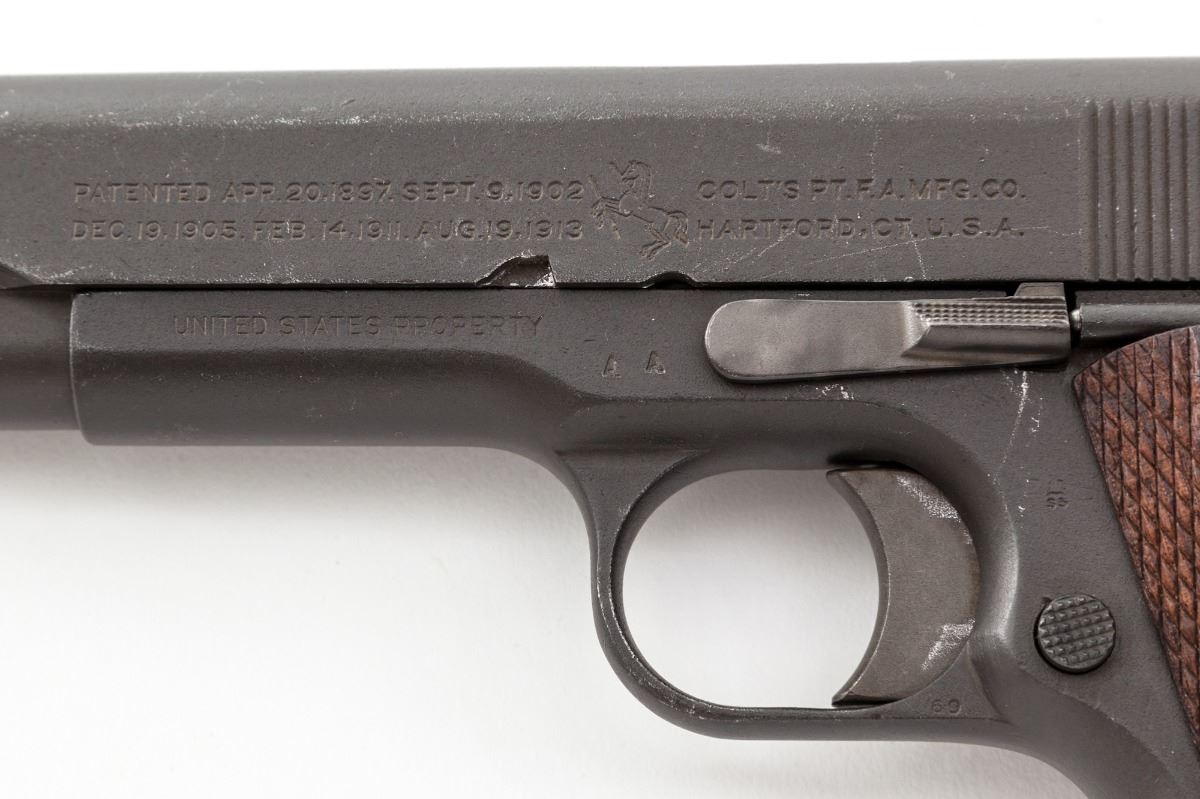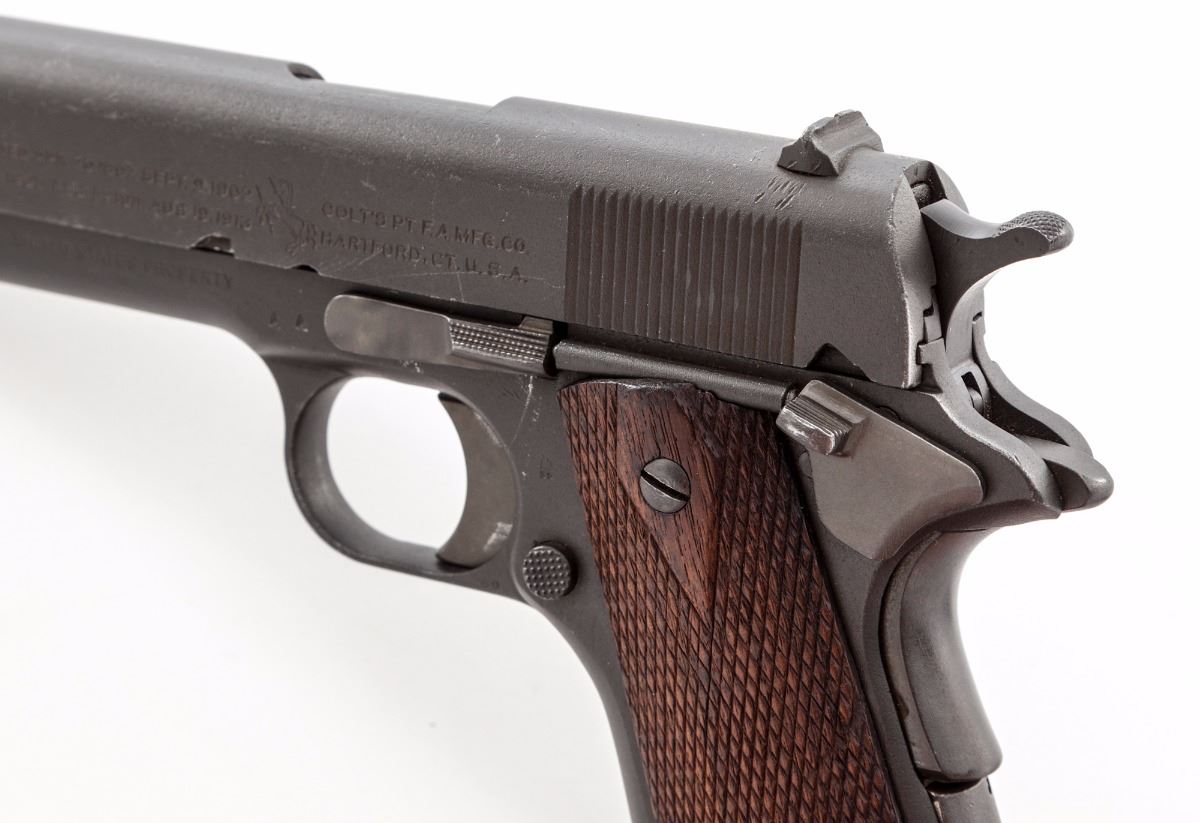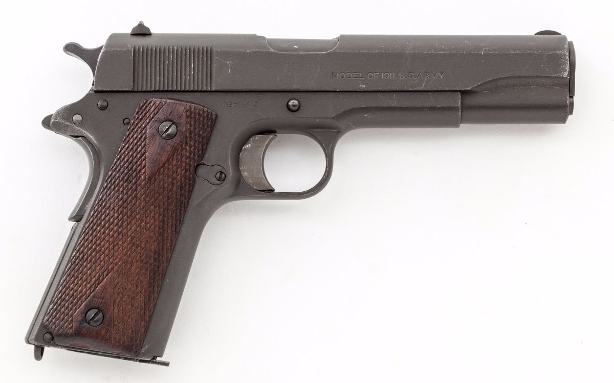 Colt 1911 Augusta Arsenal Rework Semi-Automatic Pistol, #506407, .45 ACP cal., 5'' barrel, parkerized finish, checkered walnut grips, fixed combat sight, with ''AA'' marked on left side of frame, and small ''g'' marked on barrel. Magazine is a Scovill contract. Mfg'd 1918. Condition is excellent as arsenal refinished, retaining approx. 90% arsenal finish with small scratches in places. Grips are good with flattening to the checkering, pressure dents and normal wear. Action is tight, bore is strong but rough. Est.: $1,000-$1,500. (C&R/PPT)