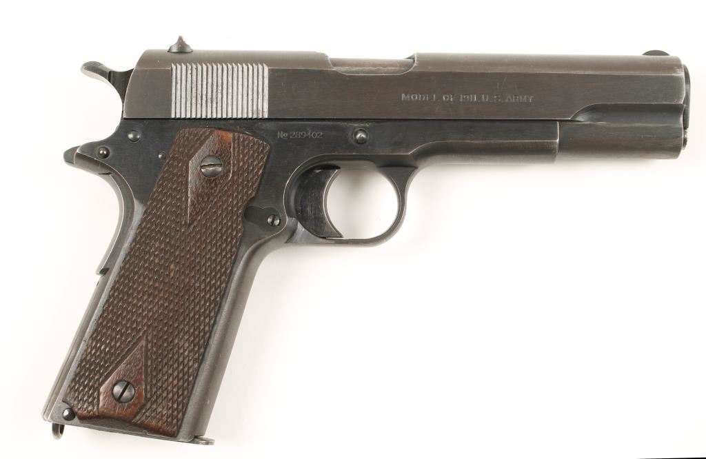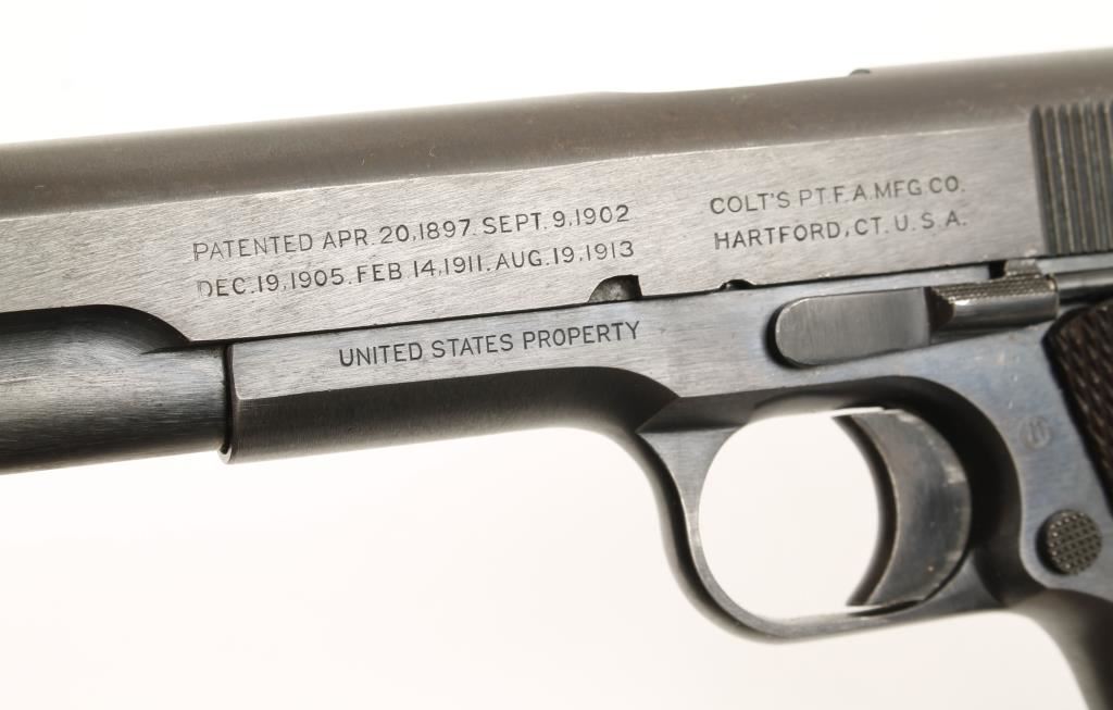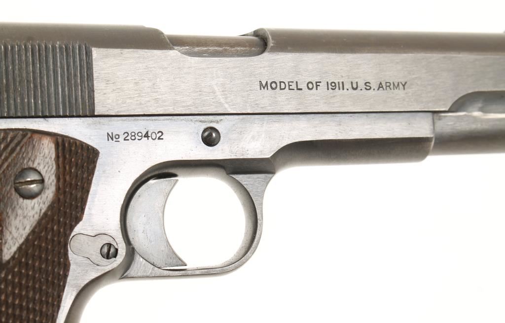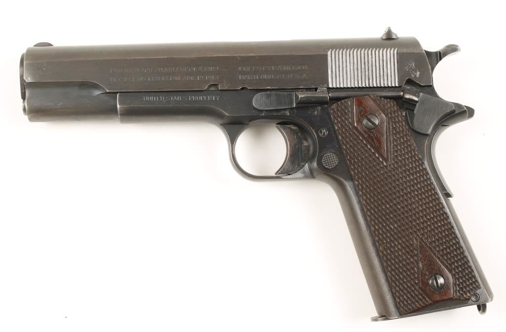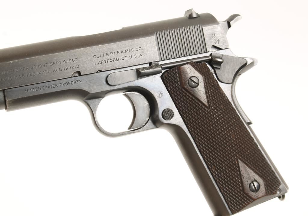 U.S. military marked single action semi-auto pistol. Made in 1918. Stamped "United States Property" and "Model of 1911 U.S. Army". Blued steel with the frame exhibiting colors of the "Royal" blue and the slide being black. Inspector marked JMG for Lt. Col. J. M. Gilbert. The metal finish is excellent. The wood double diamond grips are also excellent with only a few diamonds missing by the safety. A right grip screw show a little abuse to the head. Proper safety and bolt stop. Correct mainspring housing. The magazine is of the two-tone variety. Condition is excellent. *Modern Firearm*