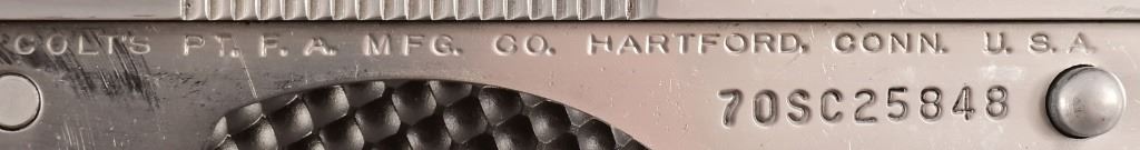 S/N 70SC25848. Satin stainless finish, with Bo-Mar rear sight. Extended barrel with flash suppressor, extended magazine release, checkered grips finger grooved for mag release. Knurled trigger guard and backstrap.