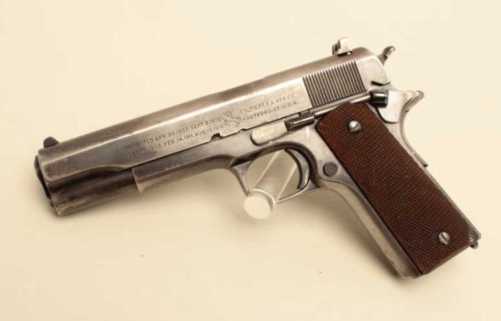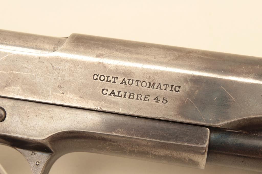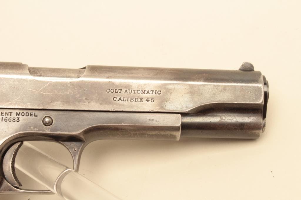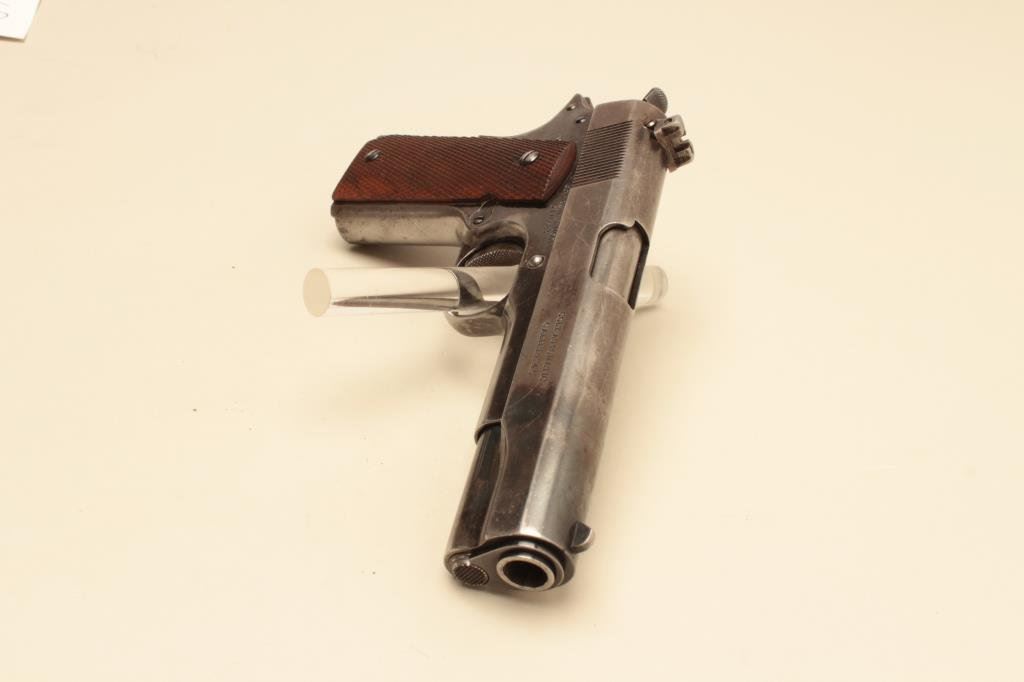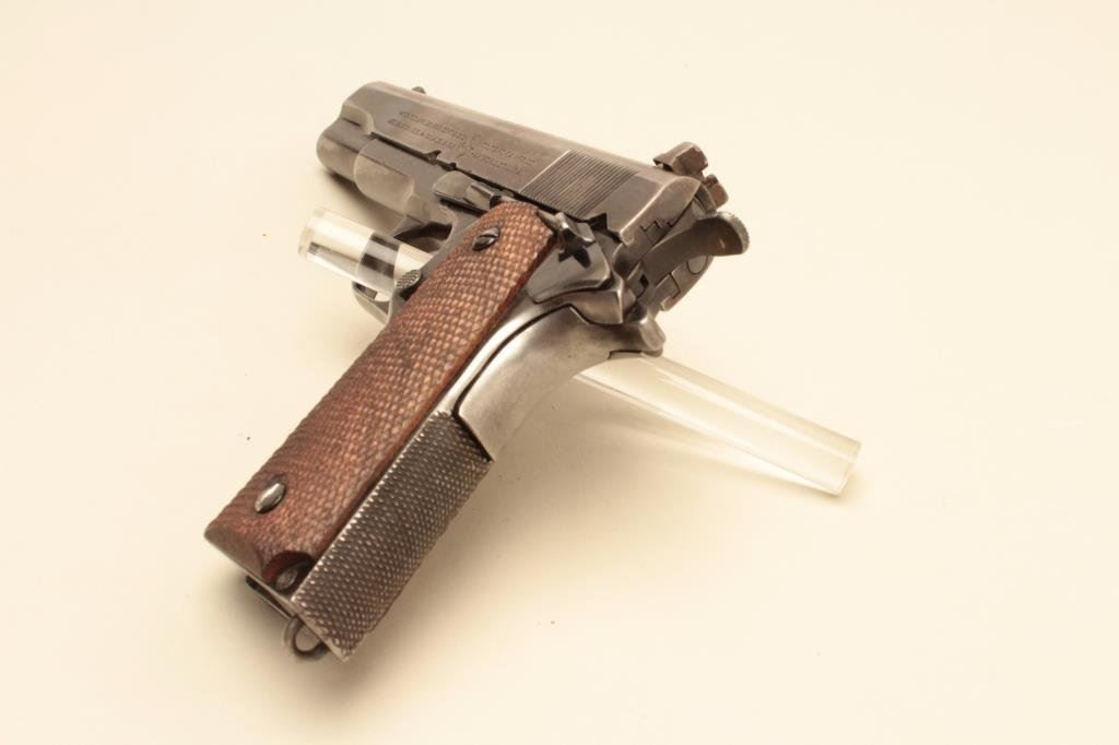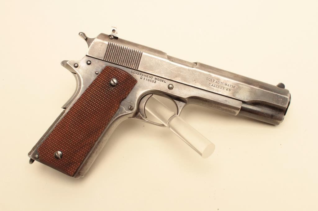 #C116683. The pistol is in good overall condition with a 5” barrel. The pistol retains the majority of its thinning military finish with loss of finish on the slide, high point edge wear and a replaced rear sight. The checkered wood grips are in good condition showing wear and use with some flattening of the checkering and a lanyard loop at the base of the knurled back strap. The bore is good, the markings legible and action is crisp. The lot does not include a magazine. Est.: $800-$1,600. (C+R).
