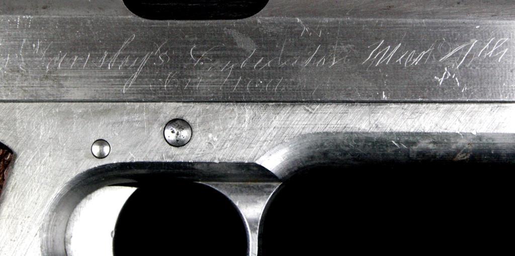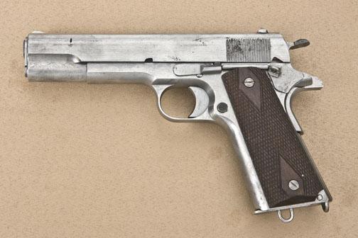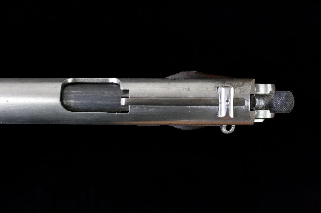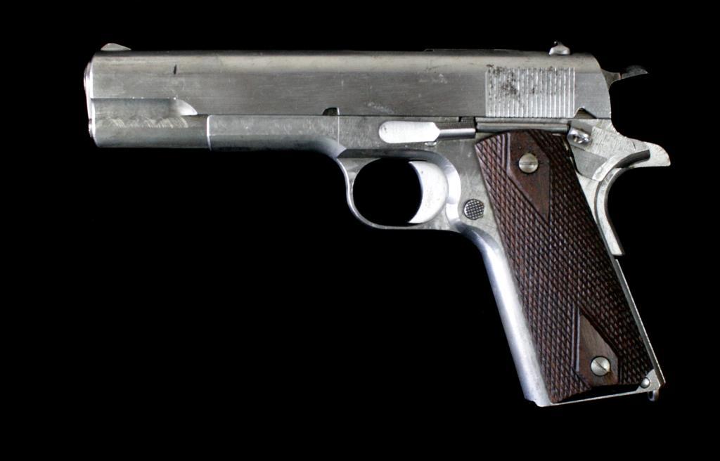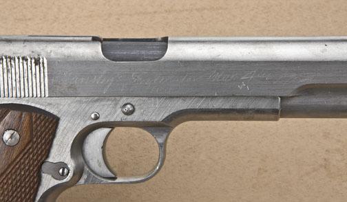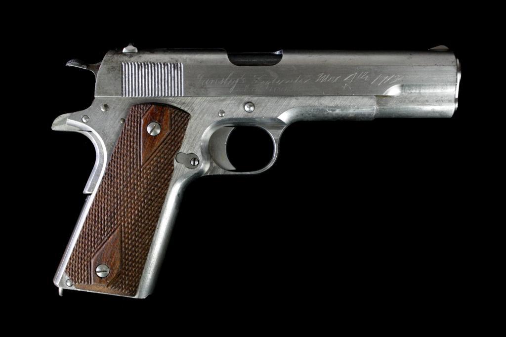 Colt 1911 Prototype w/Tansley loaded Chamber Indicator Device. No serial #, 45acp, mfg:1912. Finished in the White. Colt M1911 Factory Prototype with Experimental Slide Mounted Loaded Chamber Indicator, Springloaded Locked Takedown Lever, modified barrel, extended lightened hammer and oversize grip safety, excellent Checkered Diamond Grips, with proper Early First Model "in the white" magazine. Right of slide ismarked "TANSLEY'S INDICATOR MAR 4TH 1912". No other markings or proofs. The loaded Chamber indicator was developed at the request of the U.S.Army during trials. Mr. George H. Tansley was a Colt Engineer who had Patentsfiled by Colt's Patent Attorney E.Ju. Ehbets. Formerly in the Sid Aberman Collection. Est. $10,000-20,000